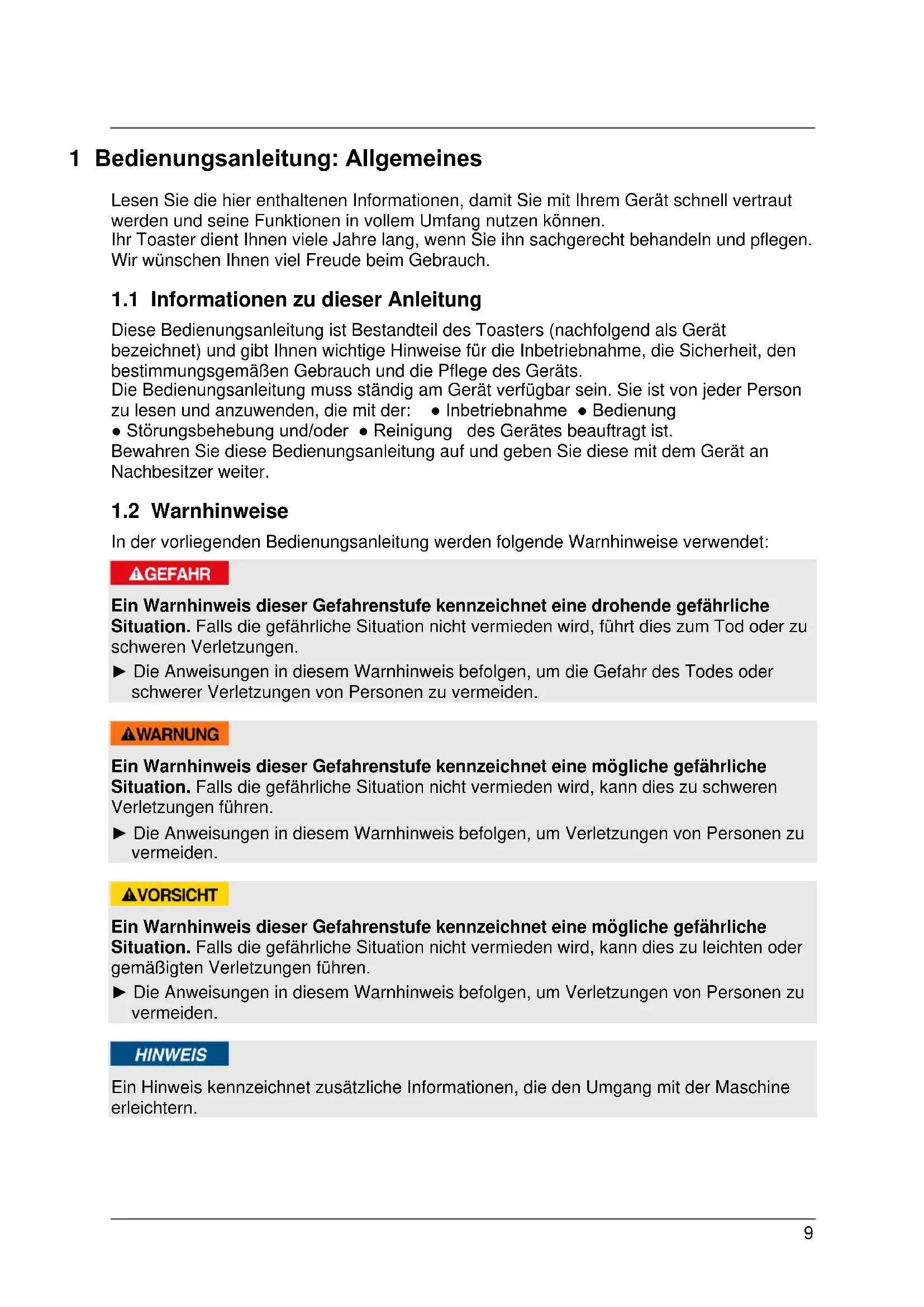 Diese Bedienungsanleitung ist Bestandteil des Toasters (nachfolgend als Gerät bezeichnet) und gibt Ihnen wichtige Hinweise für die Inbetriebnahme, die Sicherheit, den bestimmungsgemäßen Gebrauch und die Pflege des Geräts. Die Bedienungsanleitung muss ständig am Gerät verfügbar sein. Sie ist von jeder Person zu lesen und anzuwenden, die mit der: ● Inbetriebnahme ● Bedienung ● Störungsbehebung und/oder ● Reinigung des Gerätes beauftragt ist. Bewahren Sie diese Bedienungsanleitung auf und geben Sie diese mit dem Gerät an Nachbesitzer weiter.