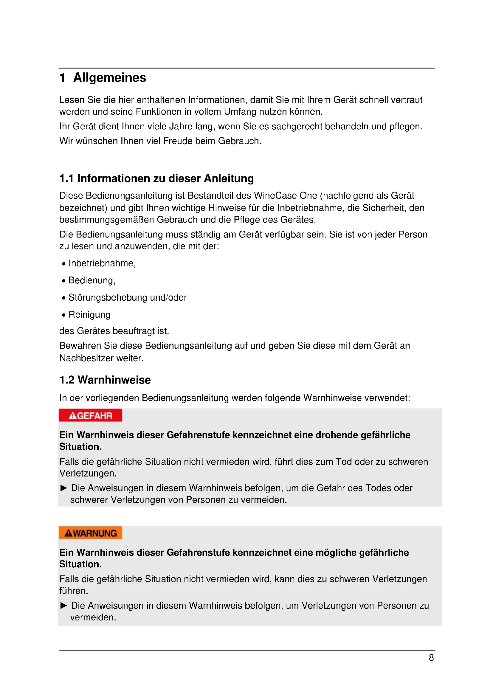 Diese Bedienungsanleitung ist Bestandteil des WineCase One (nachfolgend als Gerät bezeichnet) und gibt Ihnen wichtige Hinweise für die Inbetriebnahme, die Sicherheit, den bestimmungsgemäßen Gebrauch und die Pflege des Gerätes. Die Bedienungsanleitung muss ständig am Gerät verfügbar sein. Sie ist von jeder Person zu lesen und anzuwenden, die mit der: