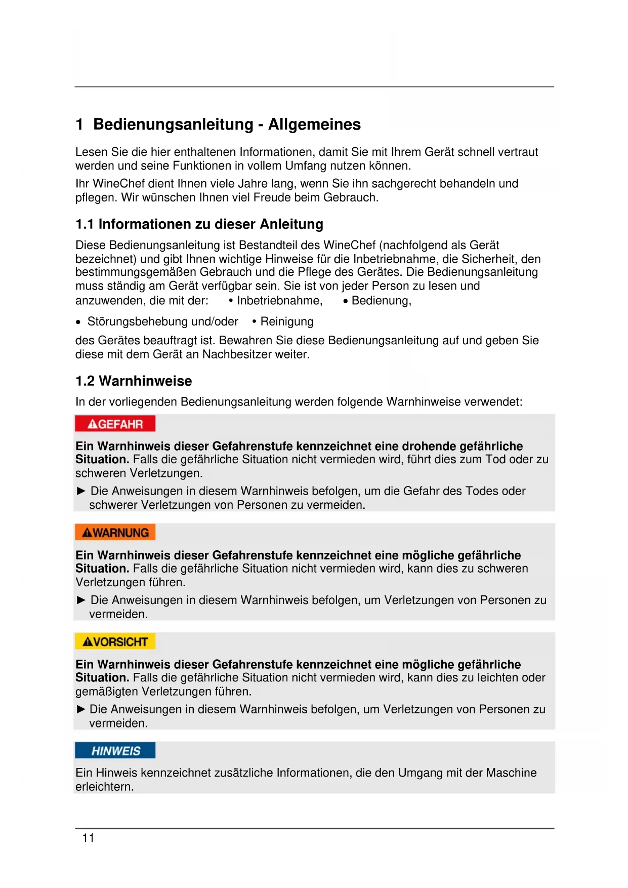 Diese Bedienungsanleitung ist Bestandteil des WineChef (nachfolgend als Gerät bezeichnet) und gibt Ihnen wichtige Hinweise für die Inbetriebnahme, die Sicherheit, den bestimmungsgemäßen Gebrauch und die Pflege des Gerätes. Die Bedienungsanleitung muss ständig am Gerät verfügbar sein. Sie ist von jeder Person zu lesen und anzuwenden, die mit der: Inbetriebnahme, • Bedienung,