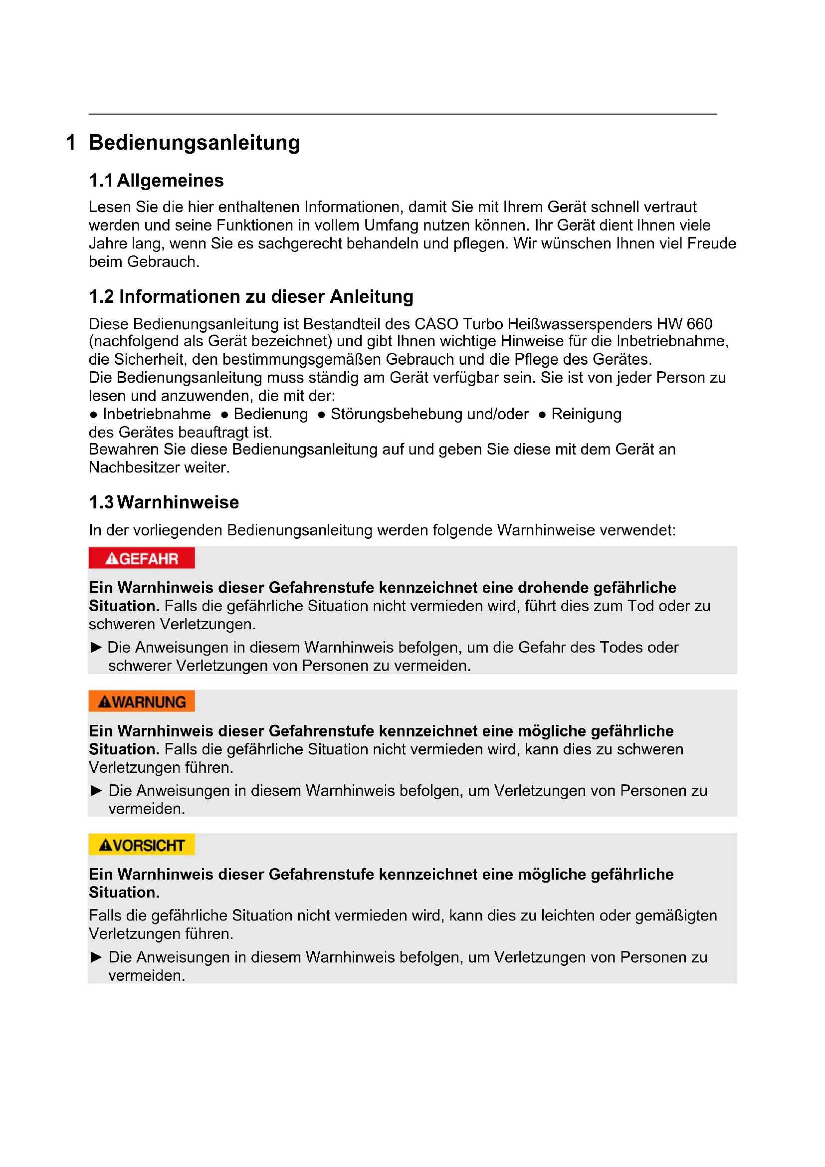 Diese Bedienungsanleitung ist Bestandteil des CASO Turbo Heißwasserspenders HW 660 (nachfolgend als Gerät bezeichnet) und gibt Ihnen wichtige Hinweise für die Inbetriebnahme, die Sicherheit, den bestimmungsgemäßen Gebrauch und die Pflege des Gerätes. Die Bedienungsanleitung muss ständig am Gerät verfügbar sein. Sie ist von jeder Person zu lesen und anzuwenden, die mit der: ● Inbetriebnahme ● Bedienung ● Störungsbehebung und/oder ● Reinigung des Gerätes beauftragt ist. Bewahren Sie diese Bedienungsanleitung auf und geben Sie diese mit dem Gerät an Nachbesitzer weiter.