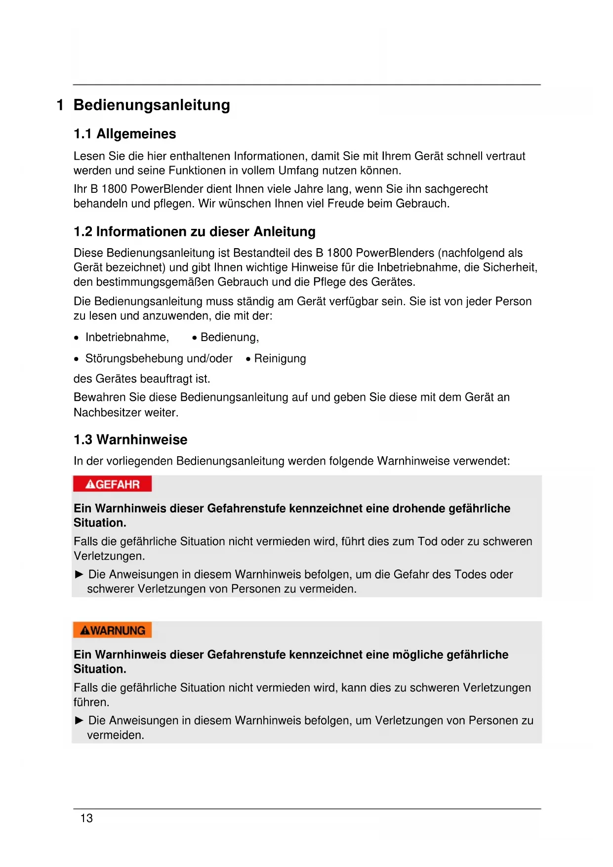 Diese Bedienungsanleitung ist Bestandteil des B 1800 PowerBlenders (nachfolgend als Gerät bezeichnet) und gibt Ihnen wichtige Hinweise für die Inbetriebnahme, die Sicherheit, den bestimmungsgemäßen Gebrauch und die Pflege des Gerätes. Die Bedienungsanleitung muss ständig am Gerät verfügbar sein. Sie ist von jeder Person zu lesen und anzuwenden, die mit der: