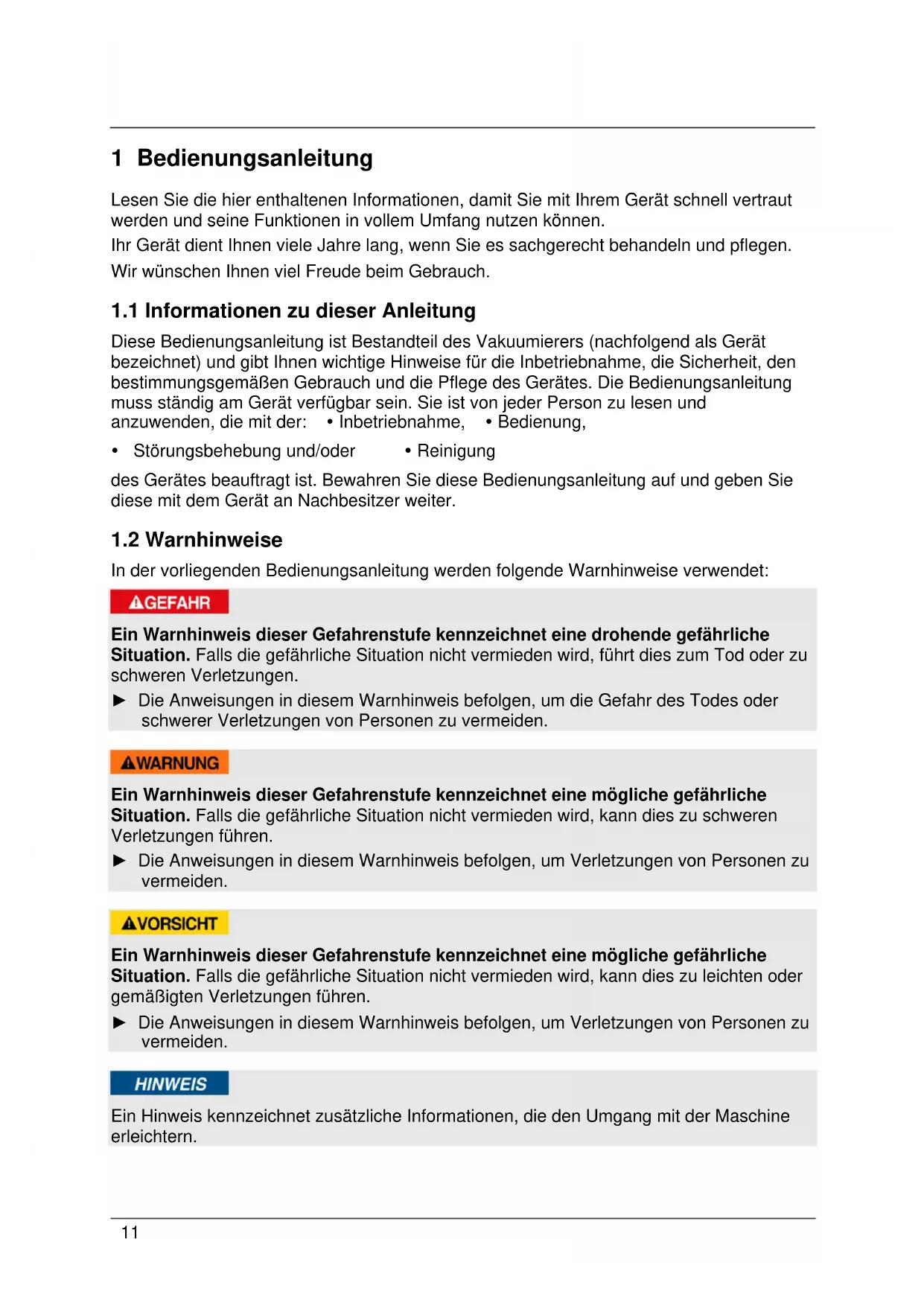 These Bedienungsanleitung ist Bestandteil des Vakuumierers (nachfolgend als Gerät bezeichnet) und gibt Ihnen wichtige Hinweise für die Inbetriebnahme, die Sicherheit, den bestimmungsgemäßen Gebrauch und die Pflege des Gerätes. Die Bedienungsanleitung muss ständig am Gerät verfügbar sein. Sie ist von jeder Person zulesen und anzuwenden, die mit der: • Inbetriebnahme, • Bedienung,