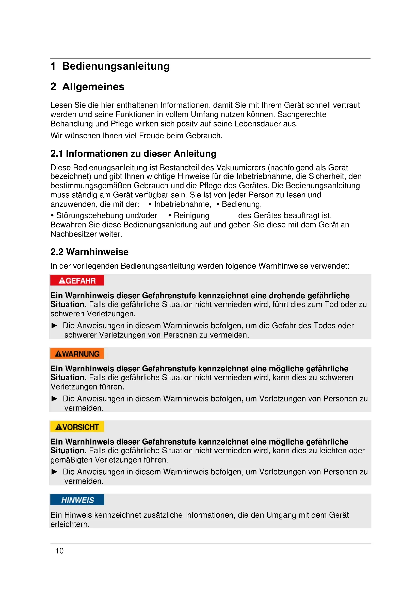 Diese Bedienungsanleitung ist Bestandteil des Vakuumierers (nachfolgend als Gerät bezeichnet) und gibt Ihnen wichtige Hinweise für die Inbetriebnahme, die Sicherheit, den bestimmungsgemäßen Gebrauch und die Pflege des Gerätes. Die Bedienungsanleitung muss ständig am Gerät verfügbar sein. Sie ist von jeder Person zu lesen und anzuwenden, die mit der: Inbetriebnahme, Bedienung, Störungsbehebung und/oder Reinigung des Gerätes beauftragt ist. Bewahren Sie diese Bedienungsanleitung auf und geben Sie diese mit dem Gerät an Nachbesitzer weiter.