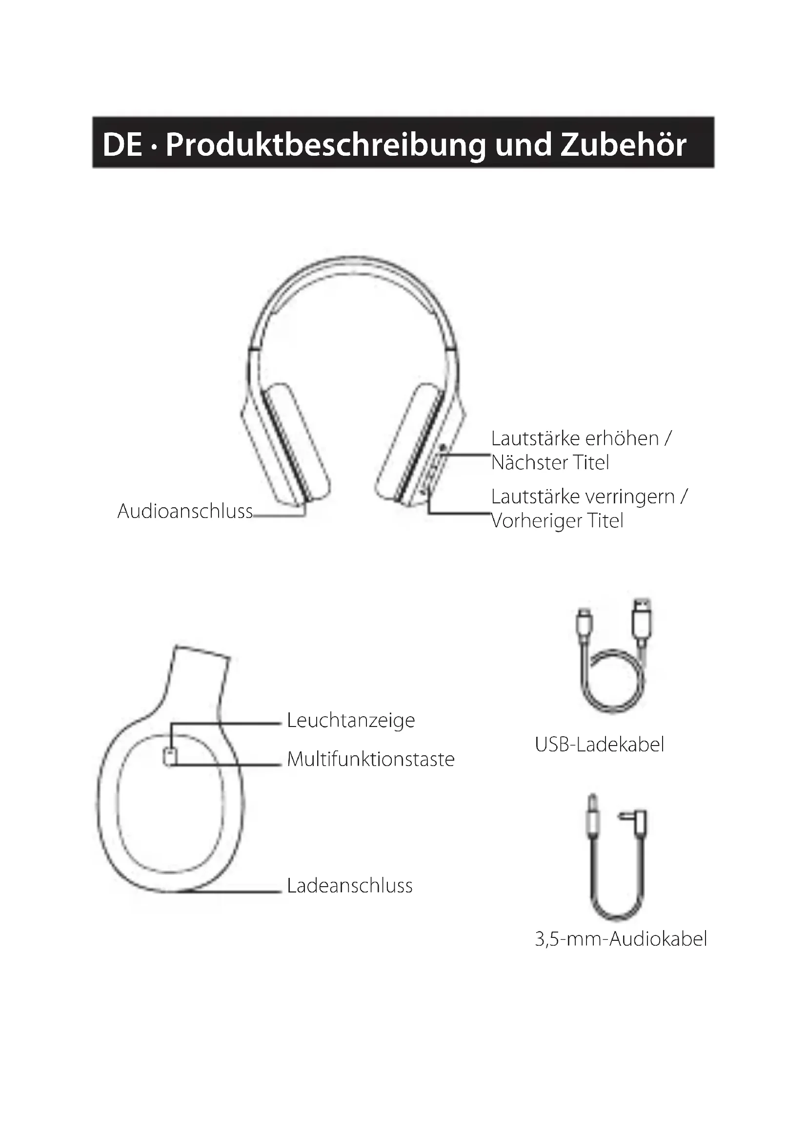 - Kopplungsaufzeichnungen löschen: wenn das Gerät eingeschaltet und nicht verbunden ist, die Tasten „+“ und „-“ gleichzeitig 5 Sekunden lang gedrückt halten. Warten Sie, bis die blaue Kontrollanzeige schnell blinkt. Die Kopplungsaufzeichnungen sind jetzt gelöscht. Anruf entgegennehmen: Einmal drücken Gespräch beenden: Einmal drücken Anruf ablehnen: gedrückt halten Lautstärke erhöhen: Einmal drücken Nächster Titel: gedrückt halten Lautstärke verringern: Einmal drücken Vorheriger Titel: gedrückt halten Pause/Wiedergabe: Einmal drücken Sprachassistent: zweimal drückenAnstatt der blauen Leuchte blinkt die rote Leuchte.