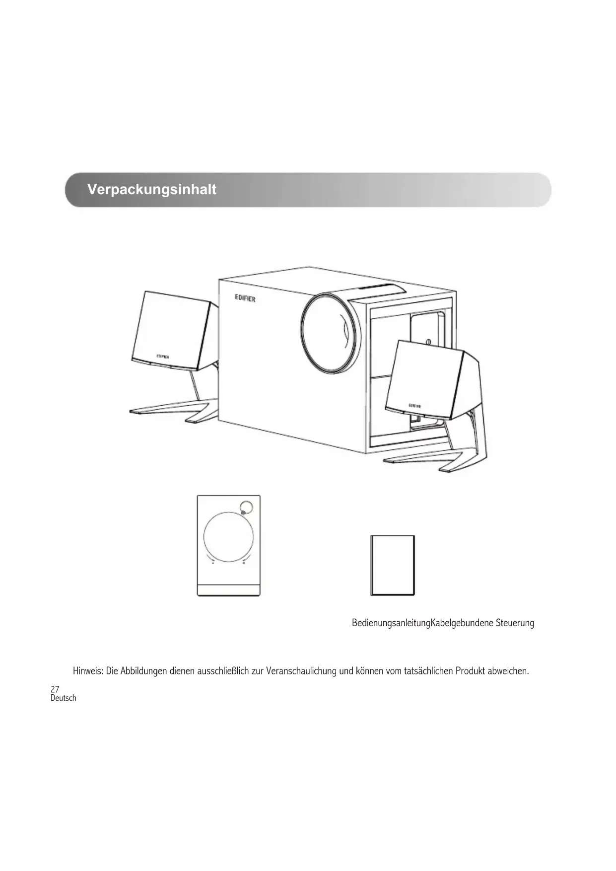 - Lautsprecher von EDIFIER erzeugen ein geringes Rauschen, wenn das Grundrauschen eines der anderen Audiogeräte zu groß ist. Trennen Sie die Audiokabel und drehen Sie die Lautstärke auf. Sollte in einem Abstand von einem Meter zum Lautsprecher kein Geräusch zu vernehmen sein, dann liegt bei diesem Produkt kein Problem vor. Um mehr über EDIFIER zu erfahren, besuchen Sie bitte www.edifier.com Bei Fragen zu Garantieleistungen unserer Produkte gehen Sie bitte auf die entsprechende Webseite Ihres Landes unter www.edifier.com und schauen Sie im Abschnitt Garantiebestimmungen nach. USA und Kanada: service@edifier.ca Südamerika: Besuchen Sie für örtliche Kontaktinformationen bitte www.edifier.com (Englisch) oder www.edifierla.com (Spanisch/Portugiesisch).33 Italiano34 ItalianoContenuto della confezione