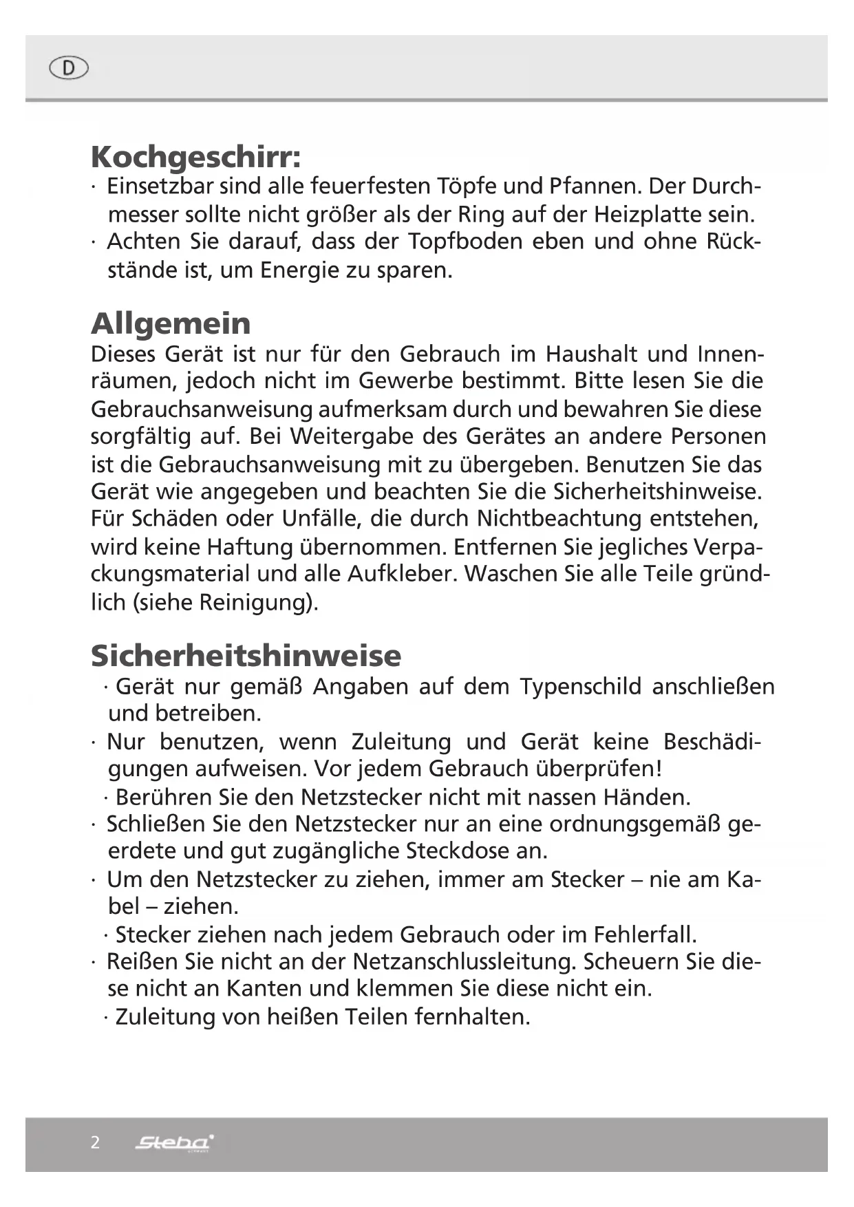 Älä jätä tyhjiä kattiloita tai pannuja keittolevyn päälle. ∙ Käytön jälkeen käännä säätönappula tasolle „0“ ja irrota virtajohto pistorasiasta.35 Tämän tuotteen oikea hävittäminen: Loppuun kuluneet laitteet on heti tehtävä käyttökelvottomiksi. EU:ssa tämä symboli ilmoittaa, ettei tätä tuotetta saa hävittää kotitalous- jätteissä. Loppuun käytetyissä laitteissa on arvokkaita kierrätyskelpoisia ma- teriaaleja, jotka tulee toimittaa uusiokäyttöön, eikä niiden valvomattomalla jätehuollolla saa vaarantaa ympäristöä tai ihmisten terveyttä. Hävitä vanhat laitteet siksi sopivien kierrätysjärjestelmien kautta tai toimita laite hävitettäväksi sil- le liikkeelle, josta olet sen ostanut. Se toimittaa laitteen sitten edelleen raaka-aine- kierrätykseen. Pakkauksen hävittäminen Älä heitä pakkausmateriaalia pois, vaan toimita se kierrätykseen. Paperi-, pahvi- ja aaltopahvipakkaukset toimitetaan paperinkeräykseen. Muoviset pakkauksen osat sekä kelmut tulee samoin panna niille tarkoitettuihin keräysastioihin. Muovien tunnusmerkintöjen esimerkeissä lukee: PE polyetyleenil- le, tunnus 02 on PE-HD, 04 on PE-LD, PP polypropyleenille, PS po- lystyrolille. Huoltopalvelu: Mikäli laitteesi vastoin odotuksia tarvitsee joskus huoltokorjaamon apua, ota yh- teyttä seuraavaan osoitteeseen. Me järjestämme takuutapauksessa sitten laitteen noutamisen. Laite tulee pakata kuljetuskelpoisesti. Emme ota vastaan paketteja, joiden postimaksua ei ole maksettu! STEBA Elektrogeräte GmbH & Co KG Pointstr. 2, 96129 Strullendorf / Saksa Myyntiosasto, puh. +49 (0)9543 449-17 / -18. Huoltamo, puh. +49 (0)9543 449-44, faksi: +49 (0)9543 449-19 S-posti: elektro@steba.com Verkkosivusto: http://www.steba.com Huomio! Vain sähköalan ammattihenkilöt saavat korjata sähkölaitteet, koska asiant- untemattomista korjauksista saattaa aiheutua huomaavia seuraamusvahinkoja.Steba Elektrogeräte GmbH & Co. KG Pointstraße 2, D-96129 Strullendorf Zentrale: Tel.: 09543-449- 0 Elektro@steba.com Fax: 09543- 449-19 Vertrieb: Tel.: 09543-449-17 www.steba.com Tel.: 09543- 449-18 Garantie-Bedingungen Dieses Gerät ist nur für den Gebrauch im Haushalt bestimmt. Schäden am Gerät, die bei bestim- mungsgemäßem Gebrauch auf Werksfehler zurückzuführen sind und uns unverzüglich nach Feststellung und innerhalb der Garantiezeit nach Lieferung an den Endabnehmer mitgeteilt wurden, beheben wir nach Maßgabe der folgenden Bedingungen. Um Ihren Anspruch geltend zu machen, ist der original Verkaufsbeleg mit Verkaufsdatum beizulegen. Eine Garantiepflicht wird nicht ausgelöst durch geringfügige Abweichungen von der Soll-Be- schaffenheit, die für Wert- und Gebrauchstauglichkeit des Gerätes unerheblich sind sowie für Schäden aus nicht normalen Umweltbedingungen. Die Garantie erstreckt sich ausschließlich auf Mängel, welche auf Material- oder Herstellungsfehler zurückzuführen sind. Die Behebung von uns als garantiepflichtig anerkannter Mängel erfolgt dadurch, dass die mangelhaften Teile durch einwandfreie Teile ersetzt werden. Von der Garantie ausgeschlossen sind: ∙ Normaler Verschleiß ∙ Gebrauchsschäden an der Beschichtung ∙ Glasbruch ∙ Unsachgemäße Anwendung, wie Überlastung oder nicht zugelassene Zubehörteile ∙ Beschädigung durch Fremdeinwirkung, Gewaltanwendung oder Fremdkörper ∙ Schaden durch Nichtbeachtung der Gebrauchsanleitung z. B. falsche Netzspannung Geräte, für die unter Bezugnahme auf diese Garantie eine Mangelbeseitigung beansprucht wird, sind an uns sachgemäß verpackt, gereinigt, mit Fehlerangabe und einschließlich Kauf- beleg einzusenden. Ersetzte Teile gehen in unser Eigentum über. Der Garantieanspruch ist nicht übertragbar und erlischt bei unsachgemäßem Gebrauch oder Zweckentfremdung, wenn Reparaturen oder Eingriffe von dritter Seite vorgenommen wurden; und zwar unabhängig davon, ob die Beanstandung hierauf beruht. Garantieleistungen bewirken weder eine Verlän- gerung der Garantiefrist noch setzen sie eine neue Garantiefrist in Lauf. Die Garantiefrist für eingebaute Ersatzteile endet zum gleichen Zeitpunkt wie die Garantiefrist für das ganze Gerät. Kann der Mangel nicht beseitigt werden oder wird die Nachbesserung von uns abgelehnt oder unzumutbar verzögert, wird auf Wunsch des Endabnehmers innerhalb der gesetzlichen Garan- tiezeit ab Kauf- bzw. Lieferdatum entweder kostenfreier Ersatz geliefert oder der Minderwert vergütet oder das Gerät gegen Erstattung des Kaufpreises zurückgenommen. Weitergehende Ansprüche, insbesondere solche auf Ersatz außerhalb des Gerätes entstande- ner Schäden sind ausgeschlossen. Art. Nr. 480-13791 Stand 09/2020 Irrtümer und technische Änderungen vorbehalten, keine Haftung für Übersetzungsfehler