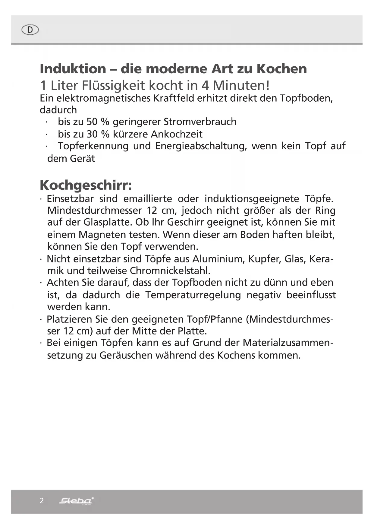 www.steba.com 220 – 240V~; 50/60Hz; 2000 W Induktion IK 55 Gebrauchsanweisung 2 Instructions for use 12 Mode d´emploi 20 Gebruiksaanwijzing 30 Brugsanvisning 402 Induktion – die moderne Art zu Kochen 1 Liter Flüssigkeit kocht in 4 Minuten! Ein elektromagnetisches Kraftfeld erhitzt direkt den Topfboden, dadurch ∙ bis zu 50 % geringerer Stromverbrauch ∙ bis zu 30 % kürzere Ankochzeit ∙ Topferkennung und Energieabschaltung, wenn kein Topf auf dem Gerät Kochgeschirr: ∙ Einsetzbar sind emaillierte oder induktionsgeeignete Töpfe. Mindestdurchmesser 12 cm, jedoch nicht größer als der Ring auf der Glasplatte. Ob Ihr Geschirr geeignet ist, können Sie mit einem Magneten testen. Wenn dieser am Boden haften bleibt, können Sie den Topf verwenden. ∙ Nicht einsetzbar sind Töpfe aus Aluminium, Kupfer, Glas, Kera- mik und teilweise Chromnickelstahl. ∙ Achten Sie darauf, dass der Topfboden nicht zu dünn und eben ist, da dadurch die Temperaturregelung negativ beeinflusst werden kann. ∙ Platzieren Sie den geeigneten Topf/Pfanne (Mindestdurchmes- ser 12 cm) auf der Mitte der Platte. ∙ Bei einigen Töpfen kann es auf Grund der Materialzusammen- setzung zu Geräuschen während des Kochens kommen.3 Allgemein Dieses Gerät ist nur für den Gebrauch im Haushalt und Innen- räumen, jedoch nicht im Gewerbe bestimmt. Bitte lesen Sie die Gebrauchsanweisung aufmerksam durch und bewahren Sie diese sorgfältig auf. Bei Weitergabe des Gerätes an andere Personen ist die Gebrauchsanweisung mit zu übergeben. Benutzen Sie das Gerät wie angegeben und beachten Sie die Sicherheitshinweise. Für Schäden oder Unfälle, die durch Nichtbeachtung entstehen, wird keine Haftung übernommen. Entfernen Sie jegliches Verpa- ckungsmaterial und alle Aufkleber. Waschen Sie alle Teile gründ- lich (siehe Reinigung). Sicherheitshinweise ∙ Personen mit Herzschrittmachern sollten vor Inbetriebnahme ihren Arzt befragen. ∙ Gerät nur gemäß Angaben auf dem Typenschild anschließen und betreiben. ∙ Wegen evtl. Funkstörungen von Radio oder TV, das Gerät an einen separaten Stromkreis anschließen. ∙ Nur benutzen, wenn Zuleitung und Gerät keine Beschädi- gungen aufweisen. Vor jedem Gebrauch überprüfen! ∙ Berühren Sie den Netzstecker nicht mit nassen Händen. ∙ Schließen Sie den Netzstecker nur an eine ordnungsgemäß ge- erdete und gut zugängliche Steckdose an. ∙ Um den Netzstecker zu ziehen, immer am Stecker – nie am Ka- bel – ziehen. ∙ Stecker ziehen nach jedem Gebrauch oder im Fehlerfall. ∙ Reißen Sie nicht an der Netzanschlussleitung. Scheuern Sie die- se nicht an Kanten und klemmen Sie diese nicht ein. ∙ Zuleitung von heißen Teilen fernhalten. ∙ Das Gerät kann von Kindern ab 8 Jahren sowie von Per- sonen mit reduzierten physischen, sensorischen oder men- talen Fähigkeiten oder Mangel an Erfahrung und/oder Wissen benutzt werden, wenn sie beaufsichtigt oder bezüglich des si-4 cheren Gebrauchs des Gerätes unterwiesen wurden und die da- raus resultierenden Gefahren verstanden haben. Reinigung und Benutzer-Wartung dürfen nicht durch Kinder durchgeführt werden, es sei denn sie sind älter als 8 Jahre und beaufsichtigt. ∙ Kinder jünger als 8 Jahre sind vom Gerät und der Anschlusslei- tung fernzuhalten. ∙ Kinder sollten beaufsichtigt werden, um sicherzustellen, dass sie nicht mit dem Gerät oder dem Verpackungsmaterial spielen (z.B. Plastiktüten). ∙ Das Gerät darf nicht mit einer Zeitschaltuhr oder mit einem se- paraten Fernwirksystem betrieben werden! ∙ Lassen Sie das Gerät während des Betriebes niemals ohne Auf- sicht. ∙ Bewahren Sie das Gerät nicht im Freien oder einem feuchten Raum auf. ∙ Stellen Sie nichts auf dem Gerät ab und decken Sie die Lüftungsschlitze nicht ab. ∙ Tauchen Sie das Gerät niemals ins Wasser. ∙ Benutzen Sie das Gerät niemals nach einer Fehlfunktion, z.B. wenn es heruntergefallen ist oder auf eine andere Weise be- schädigt wurde. ∙ Der Hersteller übernimmt keine Verantwortung bei falschen oder unsachgemäßen Gebrauch, der durch die Nichtbeachtung der Gebrauchsanleitung zustande kommt. ∙ Um Gefährdungen zu vermeiden dürfen Reparaturen am Ge- rät, wie z.B. eine beschädigte Zuleitung austauschen, nur durch einen Kundendienst ausgeführt werden. Es dürfen nur original Ersatzteile verwendet werden. ∙ Gerät wird heiß, nur nach dem Abkühlen und ohne Kochge- schirr transportieren. ∙ Das Gerät nur für die in der Bedienungsanleitung beschrie- benen Zwecke benutzen.5 ∙ Dieses Gerät ist dazu bestimmt im Haushalt und ähnlichen An- wendungen verwendet zu werden wie beispielsweise: o in Küchen für Mitarbeiter in Läden, Büros und anderen gewerblichen Bereichen o in landwirtschaftlichen Anwesen und von Kunden in Ho- tels, Motels und anderen Wohneinrichtungen o in Frühstückspensionen. ∙ Vor dem ersten Gebrauch: Alle Teile gründlich reinigen und trocknen. ∙ Vorsicht! Gerät wird heiß. Verbrennungsgefahr! Während des Betriebes kann die Temperatur der be- rührbaren Oberflächen sehr heiß sein! Gerät auf eine ebene nicht empfindliche Unterlage stellen und mindestens 70cm Abstand zu brennbaren Materialien (z.B. Gardinen) ein- halten. ∙ Während des Gebrauchs tritt Dampf aus. Halten Sie Hände und Gesicht auf Abstand. Achten Sie darauf, dass bei Kochgeschirr Dampf austreten kann. Sorgen Sie für ausreichend Abstand zu Hängeschränken damit das Furnier nicht beschädigt wird. ∙ Bei Verwendung eines Verlängerungskabels muss dieses einen Querschnitt von 1,5mm² haben. Eine Kabeltrommel muss voll- ständig abgerollt werden. ∙ Bei einer GS-geprüften 16 A Mehrfach-Steckerleiste darf die- se wegen Brandgefahr nicht mit mehr wie 3680 Watt belastet werden. ∙ Achten Sie drauf, dass Kinder nicht am Kabel ziehen oder eine Stolperfalle entsteht. ∙ Das Gerät ist bei nicht vorhandener Aufsicht und vor dem Zu- sammenbau, dem Auseinandernehmen oder Reinigen stets vom Netz zu trennen. ∙ Stromschlaggefahr! Keine 
