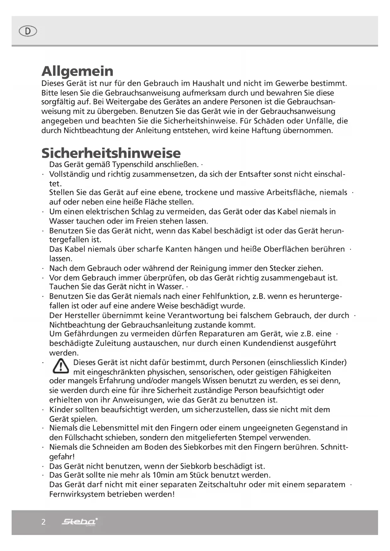 www.steba.com Premium Juicer E 120 Gebrauchsanweisung und Rezepte 2 Instructions for use 10 Mode d´emploi 14 Gebruiksaanwijzing 202 Allgemein Dieses Gerät ist nur für den Gebrauch im Haushalt und nicht im Gewerbe bestimmt. Bitte lesen Sie die Gebrauchsanweisung aufmerksam durch und bewahren Sie diese sorgfältig auf. Bei Weitergabe des Gerätes an andere Personen ist die Gebrauchsan- weisung mit zu übergeben. Benutzen Sie das Gerät wie in der Gebrauchsanweisung angegeben und beachten Sie die Sicherheitshinweise. Für Schäden oder Unfälle, die durch Nichtbeachtung der Anleitung entstehen, wird keine Haftung übernommen. Sicherheitshinweise Das Gerät gemäß Typenschild anschließen. ∙ Vollständig und richtig zusammensetzen, da sich der Entsafter sonst nicht einschal- ∙ tet. Stellen Sie das Gerät auf eine ebene, trockene und massive Arbeitsfläche, niemals ∙ auf oder neben eine heiße Fläche stellen. Um einen elektrischen Schlag zu vermeiden, das Gerät oder das Kabel niemals in ∙ Wasser tauchen oder im Freien stehen lassen. Benutzen Sie das Gerät nicht, wenn das Kabel beschädigt ist oder das Gerät herun- ∙ tergefallen ist. Das Kabel niemals über scharfe Kanten hängen und heiße Oberflächen berühren ∙ lassen. Nach dem Gebrauch oder während der Reinigung immer den Stecker ziehen. ∙ Vor dem Gebrauch immer überprüfen, ob das Gerät richtig zusammengebaut ist. ∙ Tauchen Sie das Gerät nicht in Wasser. ∙ Benutzen Sie das Gerät niemals nach einer Fehlfunktion, z.B. wenn es herunterge- ∙ fallen ist oder auf eine andere Weise beschädigt wurde. Der Hersteller übernimmt keine Verantwortung bei falschem Gebrauch, der durch ∙ Nichtbeachtung der Gebrauchsanleitung zustande kommt. Um Gefährdungen zu vermeiden dürfen Reparaturen am Gerät, wie z.B. eine ∙ beschädigte Zuleitung austauschen, nur durch einen Kundendienst ausgeführt werden. ∙ Dieses Gerät ist nicht dafür bestimmt, durch Personen (einschliesslich Kinder) mit eingeschränkten physischen, sensorischen, oder geistigen Fähigkeiten oder mangels Erfahrung und/oder mangels Wissen benutzt zu werden, es sei denn, sie werden durch eine für ihre Sicherheit zuständige Person beaufsichtigt oder erhielten von ihr Anweisungen, wie das Gerät zu benutzen ist. Kinder sollten beaufsichtigt werden, um sicherzustellen, dass sie nicht mit dem ∙ Gerät spielen. Niemals die Lebensmittel mit den Fingern oder einem ungeeigneten Gegenstand in ∙ den Füllschacht schieben, sondern den mitgelieferten Stempel verwenden. Niemals die Schneiden am Boden des Siebkorbes mit den Fingern berühren. Schnitt- ∙ gefahr! Das Gerät nicht benutzen, wenn der Siebkorb beschädigt ist. ∙ Das Gerät sollte nie mehr als 10min am Stück benutzt werden. ∙ Das Gerät darf nicht mit einer separaten Zeitschaltuhr oder mit einem separatem ∙ Fernwirksystem betrieben werden!3 Zusammenbau Die Motorbasis mit einem feuchten Tuch abwischen. Alle anderen Teile abspülen ∙ und trocknen. Vorsicht: Im Siebkorb sind scharfe Messer! Darauf achten, dass der Schalter der Motorbasis auf 0 steht. ∙ Die Saft-Auffangschale auf die Motorbasis stellen, wobei der Saftauslauf in die ∙ Ausbuchtung an der Motorbasis kommt. Setzen Sie den Siebkorb in die Auffangschale, wobei die 3 Pfeile unten am Siebkorb ∙ auf die 3 Aussparungen am Antrieb zeigen müssen und drücken Sie den Siebkorb vorsichtig an den Rändern nach unten, bis dieser hörbar auf dem Antrieb einrastet und nicht wackelt. Legen Sie die Abdeckung auf die Saft-Auffangschale und klappen den Bügel nach ∙ oben. Achten Sie darauf, dass der Verriegelungsbügel sicher eingerastet ist. ∙ Den Tresterbehälter leicht schräg unter den Tresterauswurf führen und dann stel- ∙ len. Hinweis: Zur leichten Reinigung des Behälters diesen mit einem Gefrierbeutel auskleiden. Stellen Sie den Saftbehälter unter die Entsafteröffnung. ∙ Dann erst den Stecker einstecken. Benutzung Wenn das Gerät das erste Mal benutzt wird, kann der Motor kurzzeitig einen leich- ∙ ten Geruch abgeben. Schalterstellung I: ∙ langsame Geschwindigkeit für weiche Früchte wie Trauben, Melonen, etc. Schalterstellung II: hohe Geschwindigkeit für harte Früchte und Gemüse wie Äpfel, Karotten, etc. Bei laufendem Motor die zu entsaftenden Lebensmittel in den Füllschacht geben. ∙ Niemals Lebensmittel mit harten Kernen oder Schalen in den Füllschacht geben, da ∙ die Messer beschädigt werden. Den Stempel langsam ohne Kraft nach unten drücken, keine anderen Hilfsmittel ∙ verwenden oder mit den Fingern in den Schacht langen. Verletzungsgefahr! Nach dem letzten Füllen das Gerät noch einige Sekunden laufen lassen, damit der ∙ restliche Saft abtropfen kann. Den Tresterbehälter nicht überfüllen, da das Gerät nicht richtig arbeiten kann oder ∙ beschädigt wird.4 Tipps Alle Früchte und Gemüse waschen. Die meisten Früchte oder Gemüse müssen nicht in Stücke geschnitten werden, solange diese leicht in die Füllöffnung passen. Früchte mit einer harten oder ungenießbaren Schale wie Melonen, Kiwi, Ananas immer vorher schälen. Zitrusfrüchte vor dem Entsaften schälen. Bei Äpfeln einen kleinen Schuss Zitronensaft zugeben, so vermeidet man, dass sich der Saft verfärbt. Stein- oder Kernobst vor dem Entsaften entkernen. Keine Bananen oder Avocados in das Gerät geben, da dieses verstopft wird. Der Trester besteht aus Faserstoffen und Zellulose und enthält viele Nährstoffe. Den Trester von Gemüse und Kartoffeln kann man zum Andicken von Suppen verwenden. Der Trester ist am gleichen Tag zu verarbeiten. Reinigung Schalter auf 0 stellen und den Stecker des Gerätes ziehen. ∙ Den Verriegelungshebel umklappen und die Abdeckung entfernen. ∙ Mit beiden Händen die Saft-Auffangschale nach oben ziehen. ∙ Die Saft-Auffangschale vorsichtig kippen damit der Siebkorb rausrutscht. ∙ Den Siebkorb am Rand halten und mit der mitgelieferten Bürste vorsichtig unter ∙ fließendem Wasser reinigen. Alle ande