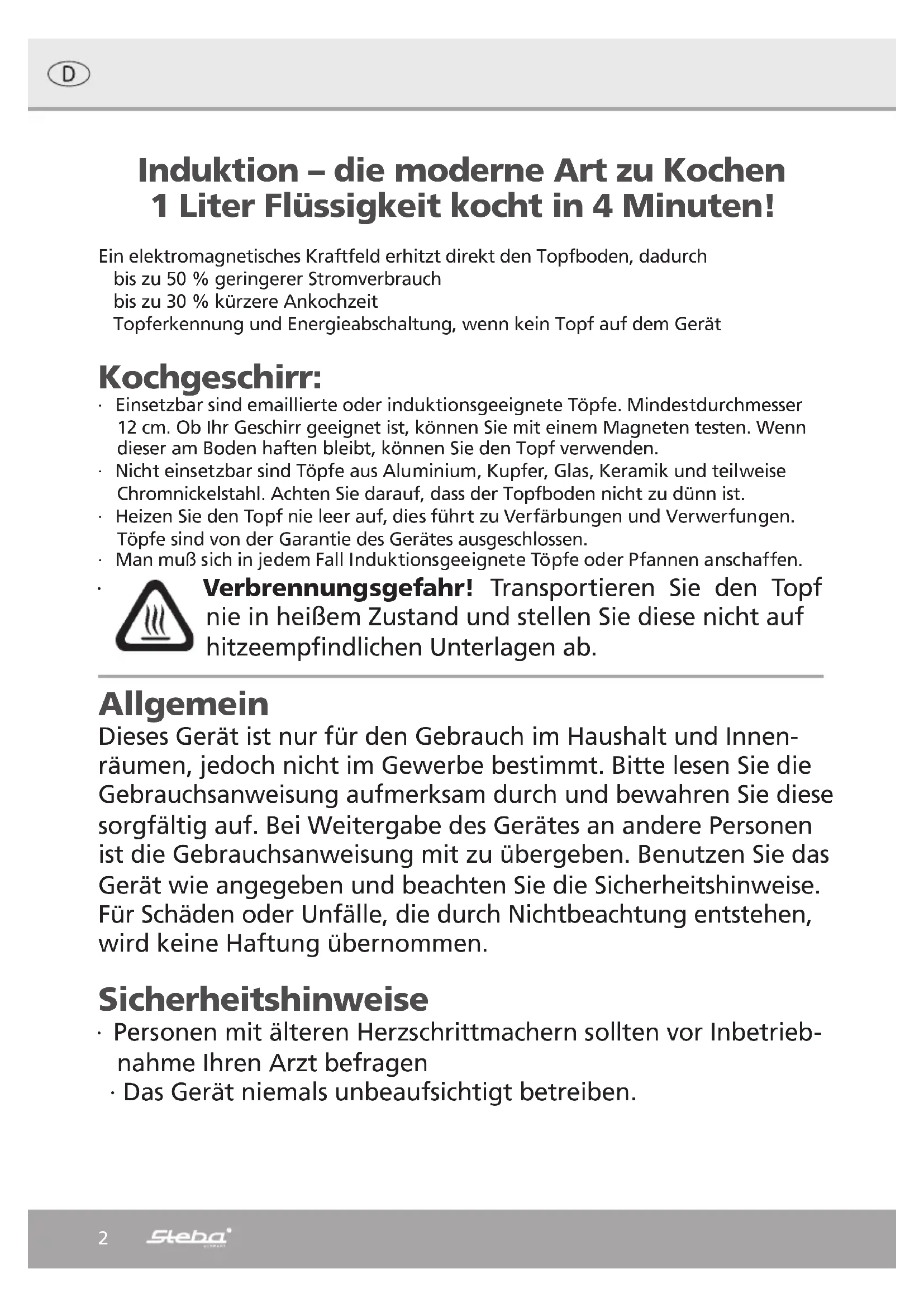 www.steba.com Induktion IK 400 S.B.EK. die moderne Art zu Kochen Gebrauchsanweisung 2 Instructions for use 12 Mode d´emploi 20 Gebruiksaanwijzing 292 Induktion – die moderne Art zu Kochen 1 Liter Flüssigkeit kocht in 4 Minuten! Ein elektromagnetisches Kraftfeld erhitzt direkt den Topfboden, dadurch