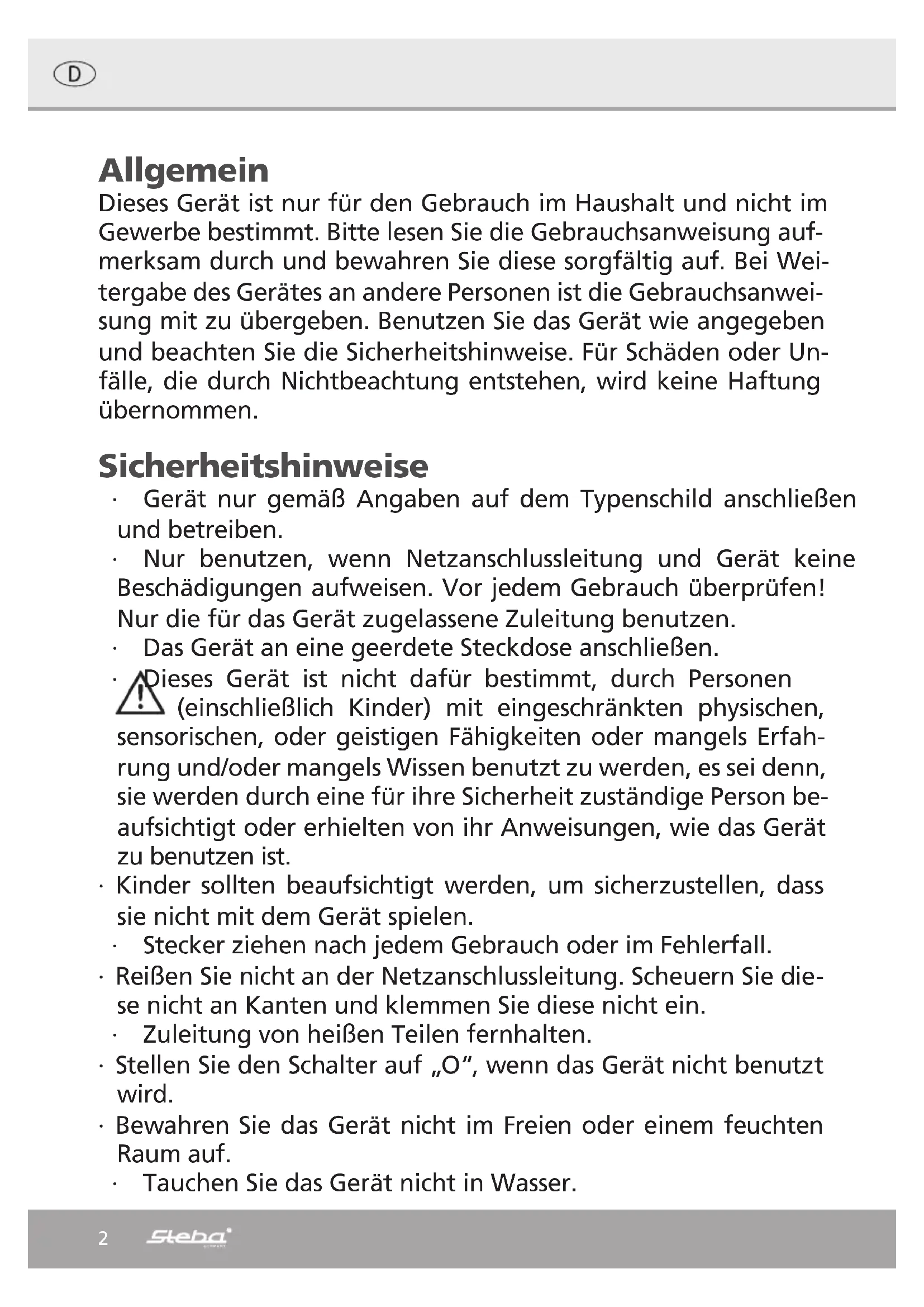 60,5 dB(A) Maksimal lufthastighed c 2,99 m/sek Målestandard for nytteværdi IEC 60879:1986(CORR.1992) Yderligere oplysninger kan fås ved hen- vendelse til: Steba Elektrogeräte GmbH & Co.KG Pointstr. 2 96129 Strullendorf38 Korrekt bortskaffelse af dette produkt: Nedslidte maskiner skal straks tages ud af brug. Inden for den Europæiske Union, indikerer dette symbol, at produktet ikke må bortskaffes sammen med andet husholdningsaffald. Elektronisk affald indeholder værdifulde og genanvendelige materialer, som burde blive genbrugt for ikke at skade naturen eller menneskers sundhed igennem ukontrolleret affaldshåndtering. Sørg derfor altid for at aflevere elektronisk affald på en genbrugsstation eller sende det til bortskaffelse hos forhandleren. Denne sørger herefter for at maskinenens komponenter genbruges. Bortskaffelse af emballage: Smid aldrig blot emballagen ud, men bortskaf det på korrekt og ansvarlig vis til genanvendelse. Emballage: ∙ Aflever papir-, pap- og bølgepapemballage på genbrugsstationen. ∙ Forpakningsdele af plastik og folie skal ligeledes afleveres i den dertil indrettede opsamlingsbeholder I eksemplerne på mærkning af plastmaterialer står: PE for polyethy- len, kodenummer 02 for PE-HD, 04 for PE-LD, PP for polypropylen, PS for polystyrol. Kundeservice: Hvis din maskine mod forventning får brug for service, bedes du kontakte os på føl- gende adresse. Vi afhenter apparatet hvis den stadig er dækket af garantien. Appara- tet skal pakkes ind til transport. Ufrankerede pakker modtages ikke! STEBA Elektriske Apparater ApS & Co K/S Pointstr. 2, 96129 Strullendorf / Germany Salgstelefon: 09543 / 449-17 / -18, servicetelefon: 09543 / 449-44, fax: 09543 / 449-19 e-Mail: elektro@steba.com Internet: http://www.steba.com Advarsel! For at undgå væsentlige skader, der kan opstå som følge af ukyndig repara- tion, må elektroniske apparater kun repareres af autoriserede el-reparatører.39Steba Elektrogeräte GmbH & Co. KG Pointstraße 2, D-96129 Strullendorf Zentrale: Tel.: 09543-449- 0 Elektro@steba.com Fax: 09543-449-19 Vertrieb: Tel.: 09543-449-17 www.steba.com Tel.: 09543-449-18 Art. Nr. 480-13703 Stand 11/2018 Garantie-Bedingungen Dieses Gerät ist nur für den Gebrauch im Haushalt bestimmt. Schäden am Gerät, die bei bestim- mungsgemäßem Gebrauch auf Werksfehler zurückzuführen sind und uns unverzüglich nach Feststellung und innerhalb der Garantiezeit nach Lieferung an den Endabnehmer mitgeteilt wurden, beheben wir nach Maßgabe der folgenden Bedingungen. Um Ihren Anspruch geltend zu machen, ist der original Verkaufsbeleg mit Verkaufsdatum beizulegen. Eine Garantiepflicht wird nicht ausgelöst durch geringfügige Abweichungen von der Soll-Be- schaffenheit, die für Wert- und Gebrauchstauglichkeit des Gerätes unerheblich sind sowie für Schäden aus nicht normalen Umweltbedingungen. Die Garantie erstreckt sich ausschließlich auf Mängel, welche auf Material- oder Herstellungsfehler zurückzuführen sind. Die Behebung von uns als garantiepflichtig anerkannter Mängel erfolgt dadurch, dass die mangelhaften Teile durch einwandfreie Teile ersetzt werden. Von der Garantie ausgeschlossen sind: ∙ Normaler Verschleiß ∙ Gebrauchsschäden an der Beschichtung ∙ Glasbruch ∙ Unsachgemäße Anwendung, wie Überlastung oder nicht zugelassene Zubehörteile ∙ Beschädigung durch Fremdeinwirkung, Gewaltanwendung oder Fremdkörper ∙ Schaden durch Nichtbeachtung der Gebrauchsanleitung z. B. falsche Netzspannung Geräte, für die unter Bezugnahme auf diese Garantie eine Mangelbeseitigung beansprucht wird, sind an uns sachgemäß verpackt, gereinigt, mit Fehlerangabe und einschließlich Kauf- beleg einzusenden. Ersetzte Teile gehen in unser Eigentum über. Der Garantieanspruch ist nicht übertragbar und erlischt bei unsachgemäßem Gebrauch oder Zweckentfremdung, wenn Reparaturen oder Eingriffe von dritter Seite vorgenommen wurden; und zwar unabhängig davon, ob die Beanstandung hierauf beruht. Garantieleistungen bewirken weder eine Verlän- gerung der Garantiefrist noch setzen sie eine neue Garantiefrist in Lauf. Die Garantiefrist für eingebaute Ersatzteile endet zum gleichen Zeitpunkt wie die Garantiefrist für das ganze Gerät. Kann der Mangel nicht beseitigt werden oder wird die Nachbesserung von uns abgelehnt oder unzumutbar verzögert, wird auf Wunsch des Endabnehmers innerhalb der gesetzlichen Garan- tiezeit ab Kauf- bzw. Lieferdatum entweder kostenfreier Ersatz geliefert oder der Minderwert vergütet oder das Gerät gegen Erstattung des Kaufpreises zurückgenommen. Weitergehende Ansprüche, insbesondere solche auf Ersatz außerhalb des Gerätes entstande- ner Schäden sind ausgeschlossen. Irrtümer und technische Änderungen vorbehalten, keine Haftung für Übersetzungsfehler