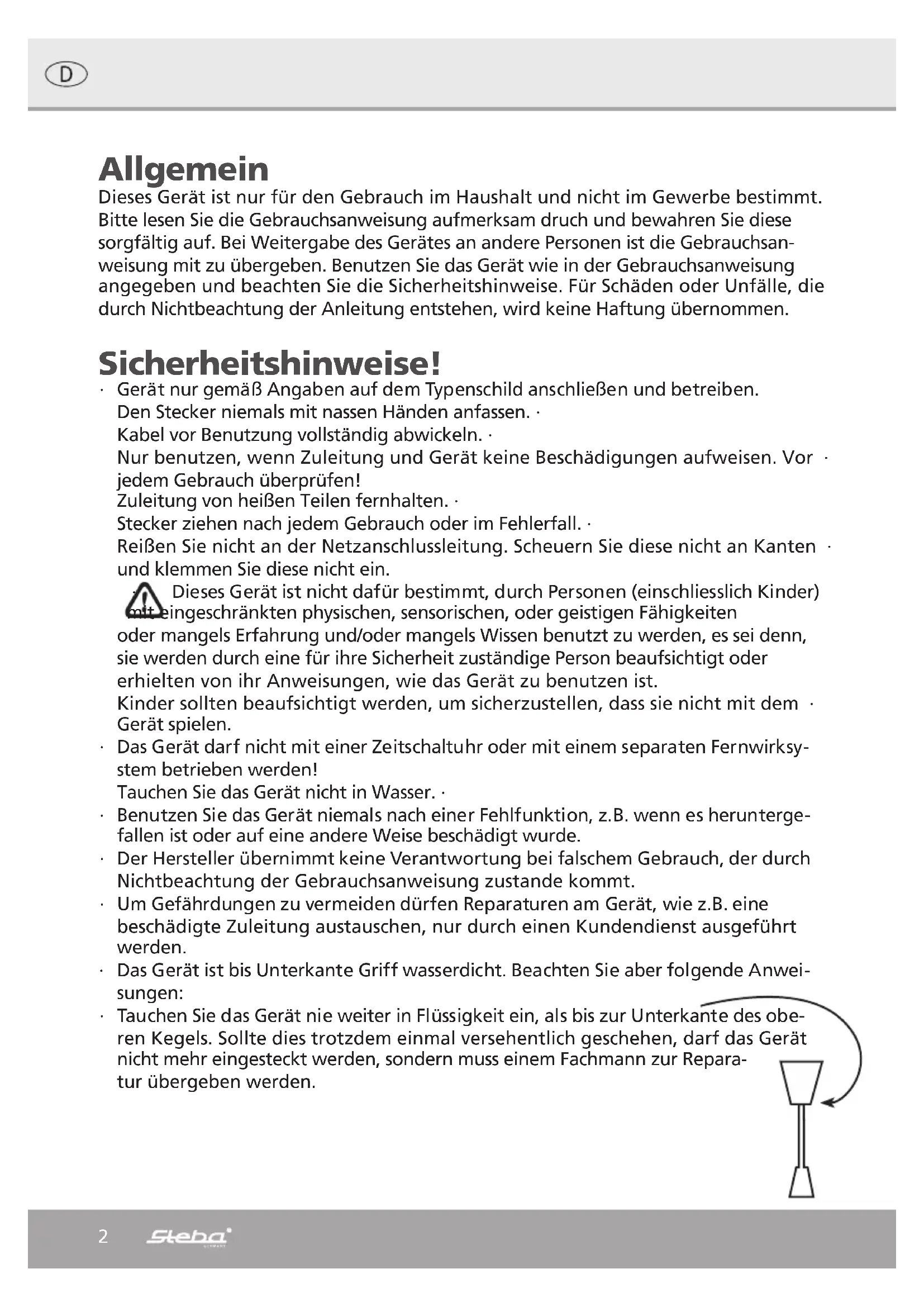 - Kunststoffverpackungsteile und Folien sollten ebenfalls in die dafür vorgesehenen ∙ Sammelbehälter gegeben werden ∙ In den Beispielen für die Kunststoffkennzeichnung steht: PE für Polyethylen, die Kennziffer 02 für PE-HD, 04 für PE-LD, PP für Polypropylen, PS für Polystürol. Kundenservice: Sollte Ihr Gerät wider Erwarten einmal den Kundendienst benötigen, wenden Sie sich bitte an nachfolgende Anschrift. Wir werden dann im Garantiefall die Abholung veranlassen. Das Gerät muss transportfähig verpackt sein. Unfreie Pakete können nicht angenommen werden! STEBA Elektrogeräte GmbH & Co KG Pointstr. 2, 96129 Strullendorf / Germany Vertrieb-Tel.: 09543 / 449-17 / -18, Service-Tel.: 09543 / 449-44, Fax: 09543 / 449-19 e-Mail: elektro@steba.com Internet: http://www.steba.com Achtung! Elektrogeräte dürfen nur durch Elektro-Fachkräfte repariert werden, da durch unsachgemäße Reparaturen erhebliche Folgeschäden entstehen können. Technische Daten: 00 Watt / 230 V