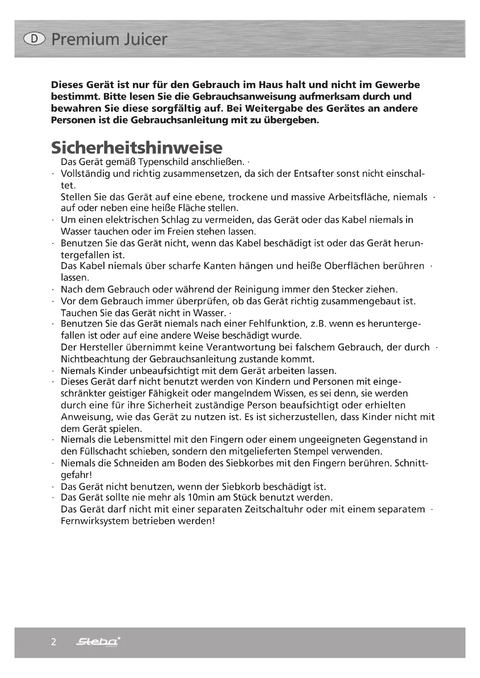 www.steba.com Premium Juicer E 150 Gebrauchsanweisung und Rezepte 2 Instructions for use 10 Mode d´emploi 14 Gebruiksaanwijzing 202 Premium Juicer Dieses Gerät ist nur für den Gebrauch im Haus halt und nicht im Gewerbe bestimmt. Bitte lesen Sie die Gebrauchsanweisung aufmerksam durch und bewahren Sie diese sorgfältig auf. Bei Weitergabe des Gerätes an andere Personen ist die Gebrauchsanleitung mit zu übergeben. Sicherheitshinweise Das Gerät gemäß Typenschild anschließen. ∙ Vollständig und richtig zusammensetzen, da sich der Entsafter sonst nicht einschal- ∙ tet. Stellen Sie das Gerät auf eine ebene, trockene und massive Arbeitsfläche, niemals ∙ auf oder neben eine heiße Fläche stellen. Um einen elektrischen Schlag zu vermeiden, das Gerät oder das Kabel niemals in ∙ Wasser tauchen oder im Freien stehen lassen. Benutzen Sie das Gerät nicht, wenn das Kabel beschädigt ist oder das Gerät herun- ∙ tergefallen ist. Das Kabel niemals über scharfe Kanten hängen und heiße Oberflächen berühren ∙ lassen. Nach dem Gebrauch oder während der Reinigung immer den Stecker ziehen. ∙ Vor dem Gebrauch immer überprüfen, ob das Gerät richtig zusammengebaut ist. ∙ Tauchen Sie das Gerät nicht in Wasser. ∙ Benutzen Sie das Gerät niemals nach einer Fehlfunktion, z.B. wenn es herunterge- ∙ fallen ist oder auf eine andere Weise beschädigt wurde. Der Hersteller übernimmt keine Verantwortung bei falschem Gebrauch, der durch ∙ Nichtbeachtung der Gebrauchsanleitung zustande kommt. Niemals Kinder unbeaufsichtigt mit dem Gerät arbeiten lassen. ∙ Dieses Gerät darf nicht benutzt werden von Kindern und Personen mit einge- ∙ schränkter geistiger Fähigkeit oder mangelndem Wissen, es sei denn, sie werden durch eine für ihre Sicherheit zuständige Person beaufsichtigt oder erhielten Anweisung, wie das Gerät zu nutzen ist. Es ist sicherzustellen, dass Kinder nicht mit dem Gerät spielen. Niemals die Lebensmittel mit den Fingern oder einem ungeeigneten Gegenstand in ∙ den Füllschacht schieben, sondern den mitgelieferten Stempel verwenden. Niemals die Schneiden am Boden des Siebkorbes mit den Fingern berühren. Schnitt- ∙ gefahr! Das Gerät nicht benutzen, wenn der Siebkorb beschädigt ist. ∙ Das Gerät sollte nie mehr als 10min am Stück benutzt werden. ∙ Das Gerät darf nicht mit einer separaten Zeitschaltuhr oder mit einem separatem ∙ Fernwirksystem betrieben werden!3 Zusammenbau Die Motorbasis mit einem feuchten Tuch abwischen. Alle anderen Teile abspülen ∙ und trocknen. Vorsicht: Im Siebkorb sind scharfe Messer! Darauf achten, dass der Schalter der Motorbasis auf 0 steht. ∙ Die Saft-Auffangschale auf die Motorbasis stellen, wobei der Saftauslauf in die ∙ Ausbuchtung an der Motorbasis kommt. Setzen Sie den Siebkorb in die Auffangschale, wobei die 3 Pfeile unten am Siebkorb ∙ auf die 3 Aussparungen am Antrieb zeigen müssen und drücken Sie den Siebkorb vorsichtig an den Rändern nach unten, bis dieser hörbar auf dem Antrieb einrastet und nicht wackelt. Legen Sie die Abdeckung auf die Saft-Auffangschale und klappen den Bügel nach ∙ oben. Achten Sie darauf, dass der Verriegelungsbügel sicher eingerastet ist. ∙ Den Tresterbehälter leicht schräg unter den Tresterauswurf führen und dann stel- ∙ len. Hinweis: Zur leichten Reinigung des Behälters diesen mit einem Gefrierbeutel auskleiden. Achten Sie darauf, dass der Tresterbehälter fest einrastet, ansonsten lässt sich das Gerät nicht einschalten. Stellen Sie den Saftbehälter unter die Entsafteröffnung. ∙ Dann erst den Stecker einstecken. Benutzung Wenn das Gerät das erste Mal benutzt wird, kann der Motor kurzzeitig einen leich- ∙ ten Geruch abgeben. Schalterstellung I: ∙ langsame Geschwindigkeit für weiche Früchte wie Trauben, Melonen, etc. Schalterstellung II: hohe Geschwindigkeit für harte Früchte und Gemüse wie Äpfel, Karotten, etc. Bei laufendem Motor die zu entsaftenden Lebensmittel in den Füllschacht geben. ∙ Niemals Lebensmittel mit harten Kernen oder Schalen in den Füllschacht geben, da ∙ die Messer beschädigt werden. Den Stempel langsam ohne Kraft nach unten drücken, keine anderen Hilfsmittel ∙ verwenden oder mit den Fingern in den Schacht langen. Verletzungsgefahr! Nach dem letzten Füllen das Gerät noch einige Sekunden laufen lassen, damit der ∙ restliche Saft abtropfen kann. Den Tresterbehälter nicht überfüllen, da das Gerät nicht richtig arbeiten kann oder ∙ beschädigt wird.4 Tipps Alle Früchte und Gemüse waschen. Die meisten Früchte oder Gemüse müssen nicht in Stücke geschnitten werden, solange diese leicht in die Füllöffnung passen. Früchte mit einer harten oder ungenießbaren Schale wie Melonen, Kiwi, Ananas immer vorher schälen. Zitrusfrüchte vor dem Entsaften schälen. Bei Äpfeln einen kleinen Schuss Zitronensaft zugeben, so vermeidet man, dass sich der Saft verfärbt. Stein- oder Kernobst vor dem Entsaften entkernen. Keine Bananen oder Avocados in das Gerät geben, da dieses verstopft wird. Der Trester besteht aus Faserstoffen und Zellulose und enthält viele Nährstoffe. Den Trester von Gemüse und Kartoffeln kann man zum Andicken von Suppen verwenden. Der Trester ist am gleichen Tag zu verarbeiten. Reinigung Schalter auf 0 stellen und den Stecker des Gerätes ziehen. ∙ Den Verriegelungshebel umklappen und die Abdeckung entfernen. ∙ Mit beiden Händen die Saft-Auffangschale nach oben ziehen. ∙ Die Saft-Auffangschale vorsichtig kippen damit der Siebkorb rausrutscht. ∙ Den Siebkorb am Rand halten und mit der mitgelieferten Bürste vorsichtig unter ∙ fließendem Wasser reinigen. Alle anderen Teile wie Saft-Auffangschale, Abdeckung, Tresterbehälter und Saft- ∙ behälter können in warmer Spülmittellauge gereinigt werden. Danach gut abtrock- nen. Motorbasis nur mit einem feuchten Lappen abwischen, bitte darauf achten, dass ∙ kein Wasser in das Innere der Basis gelangt.5 Korrekte Entsorgung dieses Produkts: Aus