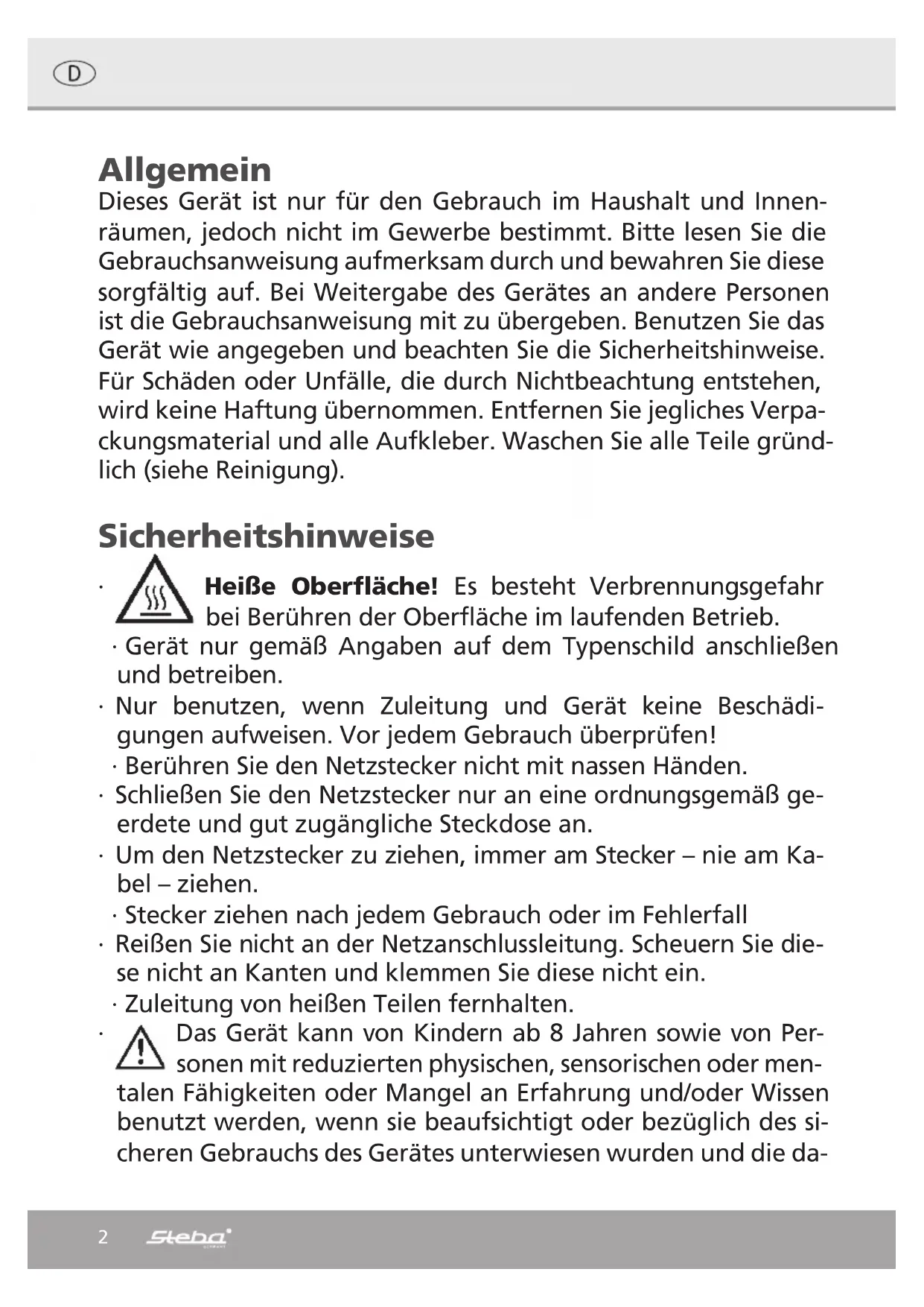 www.steba.com 220-240 V~; 50/60 Hz; 750 – 850 W Toaster TO 20 Gebrauchsanweisung 2 Instructions for use 8 Mode d´emploi 14 Gebruiksaanwijzing 20 Brugsanvisning 262 Allgemein Dieses Gerät ist nur für den Gebrauch im Haushalt und Innen- räumen, jedoch nicht im Gewerbe bestimmt. Bitte lesen Sie die Gebrauchsanweisung aufmerksam durch und bewahren Sie diese sorgfältig auf. Bei Weitergabe des Gerätes an andere Personen ist die Gebrauchsanweisung mit zu übergeben. Benutzen Sie das Gerät wie angegeben und beachten Sie die Sicherheitshinweise. Für Schäden oder Unfälle, die durch Nichtbeachtung entstehen, wird keine Haftung übernommen. Entfernen Sie jegliches Verpa- ckungsmaterial und alle Aufkleber. Waschen Sie alle Teile gründ- lich (siehe Reinigung). Sicherheitshinweise ∙ Heiße Oberfläche! Es besteht Verbrennungsgefahr bei Berühren der Oberfläche im laufenden Betrieb. ∙ Gerät nur gemäß Angaben auf dem Typenschild anschließen und betreiben. ∙ Nur benutzen, wenn Zuleitung und Gerät keine Beschädi- gungen aufweisen. Vor jedem Gebrauch überprüfen! ∙ Berühren Sie den Netzstecker nicht mit nassen Händen. ∙ Schließen Sie den Netzstecker nur an eine ordnungsgemäß ge- erdete und gut zugängliche Steckdose an. ∙ Um den Netzstecker zu ziehen, immer am Stecker – nie am Ka- bel – ziehen. ∙ Stecker ziehen nach jedem Gebrauch oder im Fehlerfall ∙ Reißen Sie nicht an der Netzanschlussleitung. Scheuern Sie die- se nicht an Kanten und klemmen Sie diese nicht ein. ∙ Zuleitung von heißen Teilen fernhalten. ∙ Das Gerät kann von Kindern ab 8 Jahren sowie von Per- sonen mit reduzierten physischen, sensorischen oder men- talen Fähigkeiten oder Mangel an Erfahrung und/oder Wissen benutzt werden, wenn sie beaufsichtigt oder bezüglich des si- cheren Gebrauchs des Gerätes unterwiesen wurden und die da-3 raus resultierenden Gefahren verstanden haben. Reinigung und Benutzer-Wartung dürfen nicht durch Kinder durchgeführt werden, es sei denn sie sind älter als 8 Jahre und beaufsichtigt. ∙ Kinder jünger als 8 Jahre sind vom Gerät und der Anschlusslei- tung fernzuhalten. ∙ Kinder sollten beaufsichtigt werden, um sicherzustellen, dass sie nicht mit dem Gerät oder dem Verpackungsmaterial spielen (z.B. Plastiktüten) ∙ Das Gerät darf nicht mit einer Zeitschaltuhr oder mit einem se- paraten Fernwirksystem betrieben werden! ∙ Lassen Sie das Gerät während des Betriebes niemals ohne Auf- sicht. ∙ Bewahren Sie das Gerät nicht im Freien oder einem feuchten Raum auf. ∙ Stromschlaggefahr! Niemals mit metallischen Ge- genständen oder den Fingern in den Röstschacht fassen! ∙ Tauchen Sie das Gerät niemals ins Wasser. ∙ Benutzen Sie das Gerät niemals nach einer Fehlfunktion, z.B. wenn es heruntergefallen ist oder auf eine andere Weise be- schädigt wurde. ∙ Der Hersteller übernimmt keine Verantwortung bei falschen oder unsachgemäßen Gebrauch, der durch die Nichtbeachtung der Gebrauchsanleitung zustande kommt. ∙ Um Gefährdungen zu vermeiden dürfen Reparaturen am Ge- rät, wie z.B. eine beschädigte Zuleitung austauschen, nur durch einen Kundendienst ausgeführt werden. Es dürfen nur original Ersatzteile verwendet werden. ∙ Gerät wird heiß, nur nach dem Abkühlen transportieren. Während des Gebrauchs den Standort nicht verändern. ∙ Das Gerät nur für die in der Bedienungsanleitung beschrie- benen Zwecke benutzen. ∙ Keine Materialien wie Papier, Pappe, Plastik etc. in das Gerät geben.4 ∙ Dieses Gerät ist dazu bestimmt im Haushalt und ähnlichen An- wendungen verwendet zu werden wie beispielsweise: o in Küchen für Mitarbeiter in Läden, Büros und anderen gewerblichen Bereichen o in landwirtschaftlichen Anwesen und von Kunden in Ho- tels, Motels und anderen Wohneinrichtungen o in Frühstückspensionen. ∙ Vor dem ersten Gebrauch: Alle Teile gründlich reinigen und trocknen. Um den Neugeruch zu beseitigen, das Gerät ohne Toast 2 – 3 mal auf höchster Stufe aufheizen lassen. ∙ Vorsicht! Gerät wird heiß. Verbrennungsgefahr! Während des Betriebes kann die Temperatur der be- rührbaren Oberflächen sehr heiß sein! Gerät auf eine ebene nicht empfindliche Unterlage stellen und mindestens 70cm Abstand zu brennbaren Materialien (z.B. Gardinen) ein- halten. ∙ Bei Verwendung eines Verlängerungskabels muss dieses einen Querschnitt von 1,5mm² haben. ∙ Bei einer GS-geprüften 16 A Mehrfach-Steckerleiste darf die- se wegen Brandgefahr nicht mit mehr wie 3680 Watt belastet werden. ∙ Achten Sie drauf, dass Kinder nicht am Kabel ziehen oder eine Stolperfalle entsteht. ∙ Das Gerät ist bei nicht vorhandener Aufsicht und vor dem Zu- sammenbau, dem Auseinandernehmen oder Reinigen stets vom Netz zu trennen. ∙ Hygiene: Darauf achten, dass das Gerät wegen Bakterien- oder Schimmelbefall immer gereinigt werden soll. Reinigung ∙ Achtung! Vor jeder Reinigung Netzstecker ziehen und das Gerät abkühlen lassen. ∙ Gerät nicht in Wasser tauchen. ∙ Krümel müssen aus hygienischen Gründen und wegen Brandgefahr entfernt werden.5 ∙ Die Krümelschublade kann dazu aus dem Gerät gezogen wer- den. Nach der Reinigung muss die Krümelschublade immer wie- der in das Gerät geschoben werden. ∙ Keine Scheuermittel, Backofenspray oder Lösungsmittel ver- wenden. ∙ Das Gehäuse mit einem feuchten Tuch mit Spülmittel abwi- schen und trocknen. Arbeitsplatz Wichtig: Das Gerät niemals auf oder neben eine heiße Ober- fläche stellen (z.B. Herdplatte), sondern nur auf einer ebenen, stabilen und temperaturbeständigen Unterlage betreiben. Es ist immer darauf zu achten, dass sich keine entflammbaren Gegen- stände in der Nähe befinden. Das Gerät nicht an die Tischkante stellen, damit es nicht von Kin- dern berührt werden kann oder bei Berührung herunterfällt. Inbetriebnahme Verschiedene Brote haben unterschiedliche Feuchtigkeitsgehalte, daher kann diesel- be Bräunungsstufe zu unterschiedlichen Ergebnissen führen. Um Brotscheiben aus 