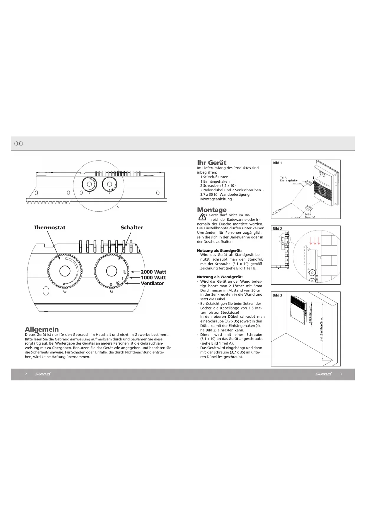 Ihr Gerät Im Lieferumfang des Produktes sind inbegriffen:1 Stützfuß unten ∙1 Einhängehaken ∙2 Schrauben 3,1 x 10 ∙2 Nylondübel und 2 Senkschrauben ∙3,7 x 35 für WandbefestigungMontageanleitung ∙ Montage Das Gerät darf nicht im Be-reich der Badewanne oder In-nerhalb der Dusche montiert werden. Die Einstellknöpfe dürfen unter keinen Umständen für Personen zugänglich sein die sich in der Badewanne oder in der Dusche aufhalten.Nutzung als Standgerät:Wird das Gerät als Standgerät be- ∙nutzt, schraubt man den Standfuß mit der Schraube (3,1 x 10) gemäß Zeichnung fest (siehe Bild 1 Teil B). Nutzung als Wandgerät: Wird das Gerät an der Wand befes- ∙ tigt bohrt man 2 Löcher mit 6mm Durchmesser im Abstand von 30 cm in der Senkrechten in die Wand und setzt die Dübel. Berücksichtigen Sie beim Setzen der ∙ Löcher die Kabellänge von 1,5 Me- tern bis zur Steckdose! In den oberen Dübel schraubt man ∙ eine Schraube (3,7 x 35) soweit in den Dübel damit der Einhängehaken (sie-he Bild 2) einrasten kann. Dieser wird mit einer Schraube ∙ (3,1 x 10) an das Gerät angeschraubt (siehe Bild 1 Teil A). Das Gerät wird eingehängt und dann ∙ mit der Schraube (3,7 x 35) im unte-ren Dübel festgeschraubt.