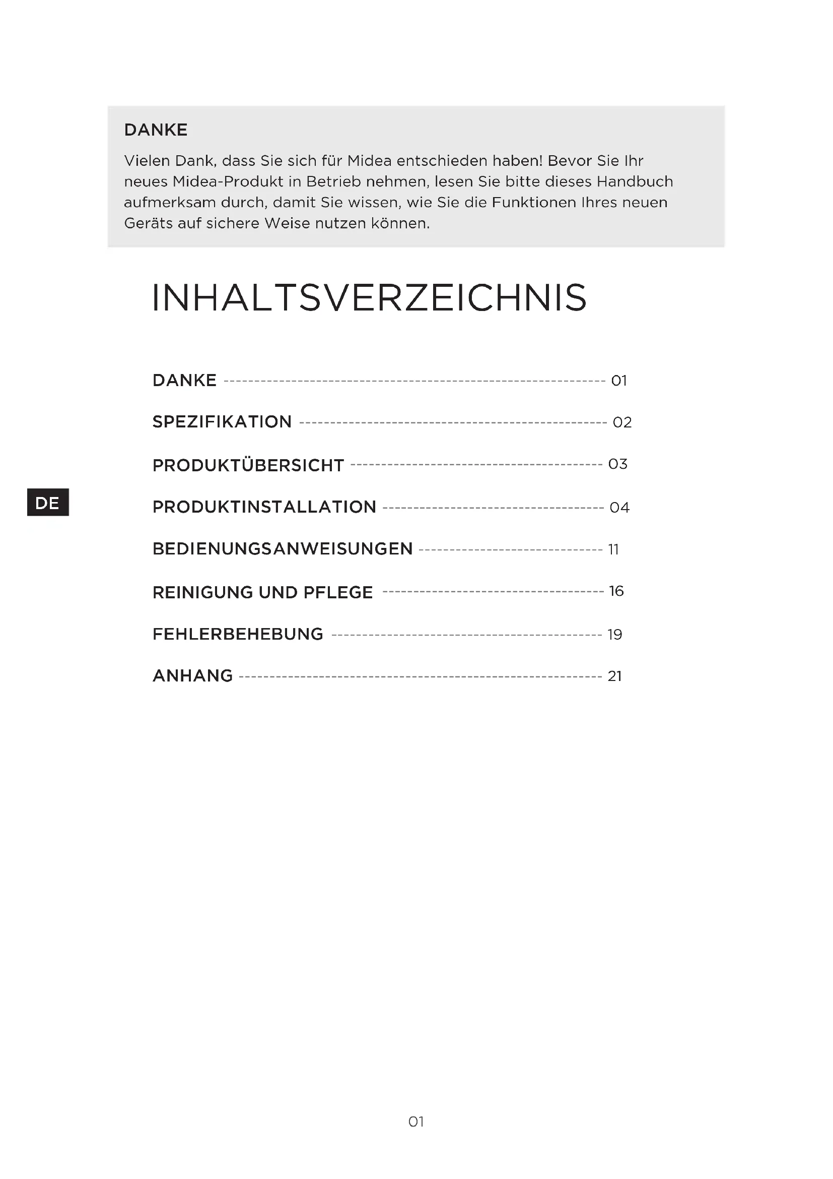 DANKE Vielen Dank, dass Sie sich für Midea entschieden haben! Bevor Sie Ihr neues Midea-Produkt in Betrieb nehmen, lesen Sie bitte dieses Handbuch aufmerksam durch, damit Sie wissen, wie Sie die Funktionen Ihres neuen Geräts auf sichere Weise nutzen können. INHALTSVERZEICHNIS DANKE