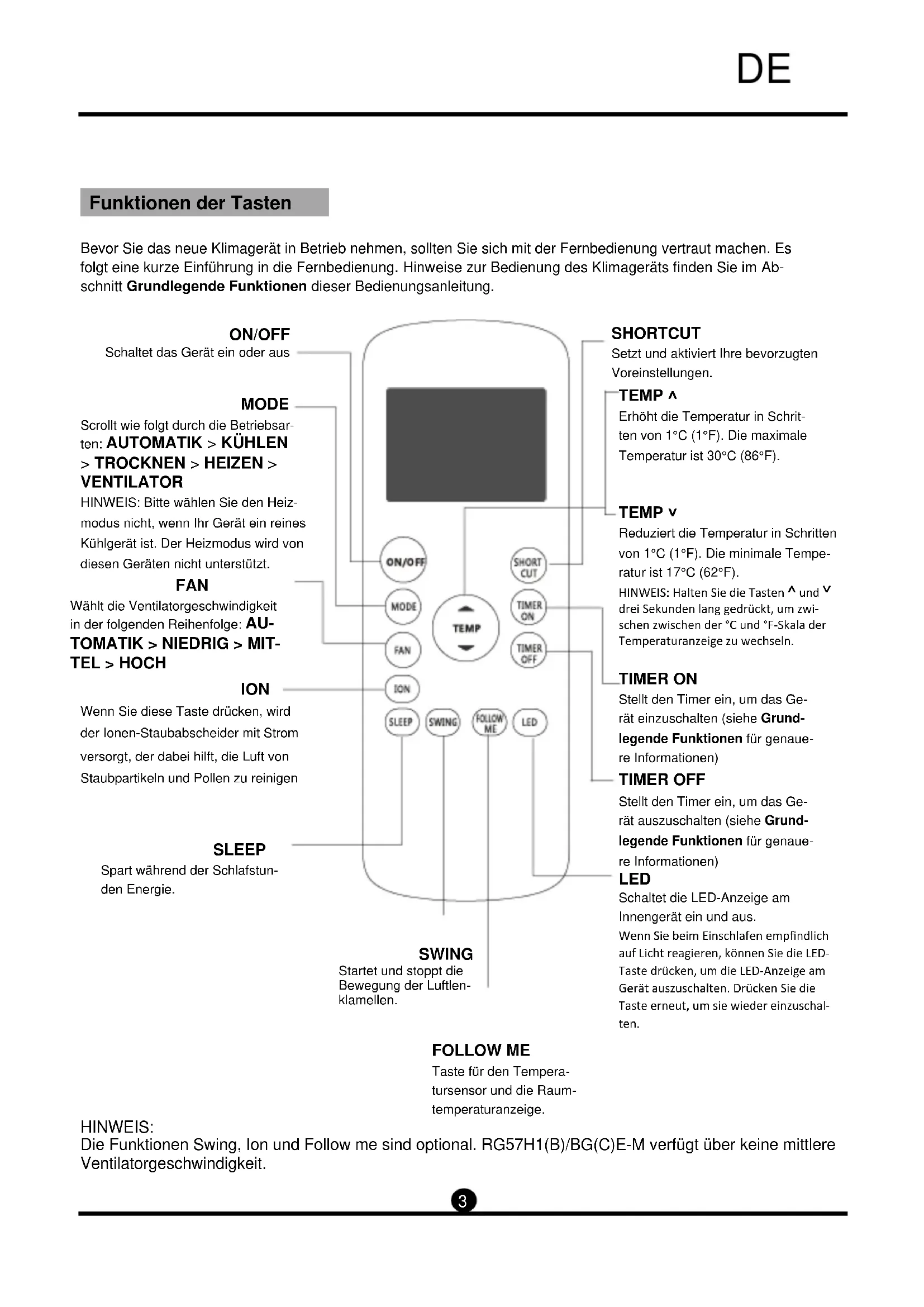 TEL > HOCH ION Wenn Sie diese Taste drücken, wird der Ionen-Staubabscheider mit Strom versorgt, der dabei hilft, die Luft von Staubpartikeln und Pollen zu reinigen SLEEP Spart während der Schlafstun-den Energie. SWING Startet und stoppt die Bewegung der Luftlen-klamellen. FOLLOW ME Taste für den Tempera-tursensor und die Raum-temperaturanzeige. HINWEIS: Die Funktionen Swing, Ion und Follow me sind optional. RG57H1(B)/BG(C)E-M verfügt über keine mittlere Ventilatorgeschwindigkeit. SHORTCUT Setzt und aktiviert Ihre bevorzugten Voreinstellungen. TEMP ˄ Erhöht die Temperatur in Schrit-ten von 1°C (1°F). Die maximale Temperatur ist 30°C (86°F).
