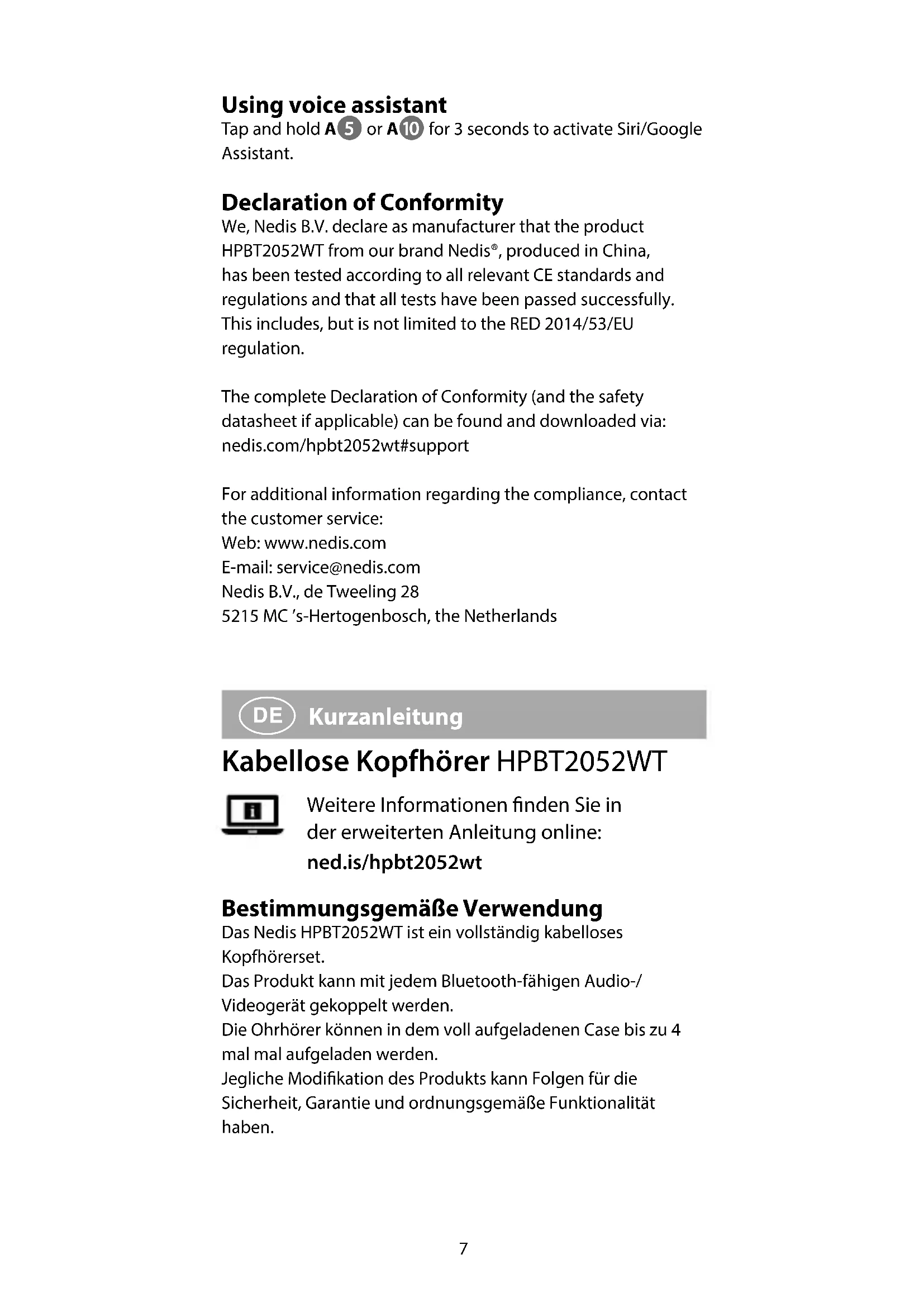 , um zum vorherigen Titel zu springen. Verwenden des Sprachassistenten Halten Sie A5 oder Aq 3 Sekunden lang gedrückt, um Siri oder den Google Assistant zu aktivieren. Konformitätserklärung Wir, Nedis B.V., erklären als Hersteller, dass das Produkt HPBT2052WT unserer Marke Nedis®, produziert in China, nach allen geltenden CE-Standards und Vorschriften getestet wurde und alle diese Tests erfolgreich bestanden hat. Dies gilt unter anderem auch für die Richtlinie RED 2014/53/EU. Die vollständige Konformitätserklärung (und das Sicherheitsdatenblatt, falls zutreend) steht zum Download zur Verfügung unter: nedis.de/hpbt2052wt#support Weiterführende Informationen zur Compliance erhalten Sie über den Kundenservice: Web: www.nedis.com E-Mail: service@nedis.com Nedis B.V., de Tweeling 28 5215 MC ’s-Hertogenbosch, Niederlande
