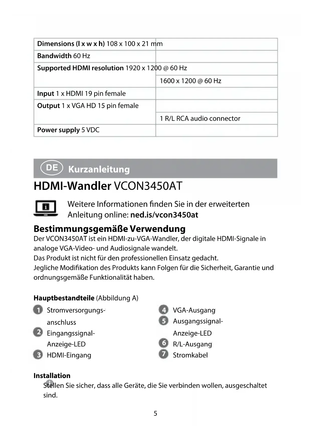 Kurzanleitung HDMI-Wandler VCON3450AT Weitere Informationen nden Sie in der erweiterten Anleitung online: ned.is/vcon3450at Bestimmungsgemäße Verwendung Der VCON3450AT ist ein HDMI-zu-VGA-Wandler, der digitale HDMI-Signale in analoge VGA-Video- und Audiosignale wandelt.Das Produkt ist nicht für den professionellen Einsatz gedacht.Jegliche Modikation des Produkts kann Folgen für die Sicherheit, Garantie und ordnungsgemäße Funktionalität haben.Hauptbestandteile (Abbildung A) Stromversorgungs-anschluss Eingangssignal- Anzeige-LED HDMI-Eingang VGA-Ausgang Ausgangssignal- Anzeige-LED R/L-Ausgang StromkabelInstallation Stellen Sie sicher, dass alle Geräte, die Sie verbinden wollen, ausgeschaltet sind.6