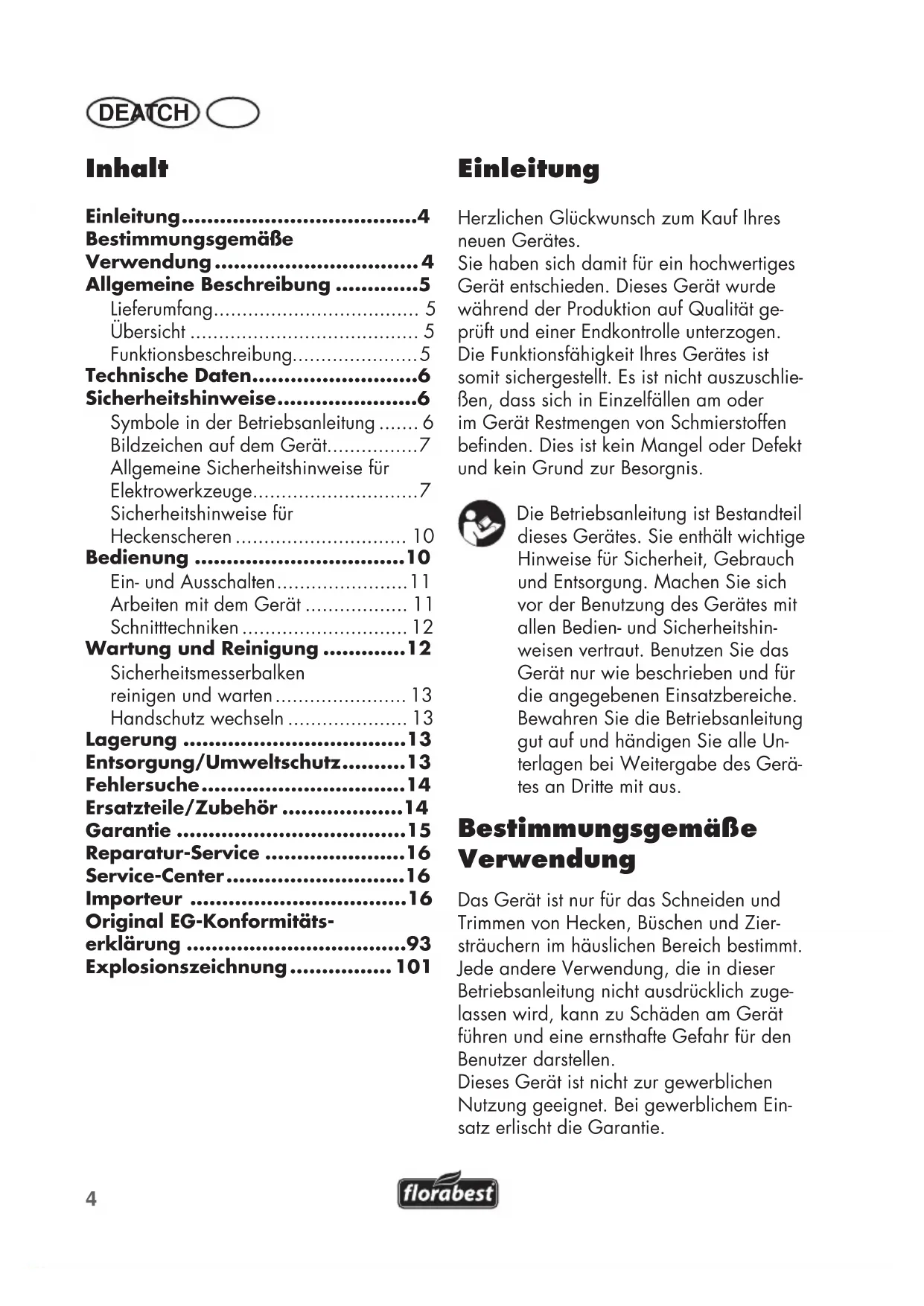 DE AT CH Einleitung Herzlichen Glückwunsch zum Kauf Ihres neuen Gerätes. Sie haben sich damit für ein hochwertiges Gerät entschieden. Dieses Gerät wurde während der Produktion auf Qualität ge- prüft und einer Endkontrolle unterzogen. Die Funktionsfähigkeit Ihres Gerätes ist somit sichergestellt. Es ist nicht auszuschlie- ßen, dass sich in Einzelfällen am oder im Gerät Restmengen von Schmierstoffen benden. Dies ist kein Mangel oder Defekt und kein Grund zur Besorgnis. Die Betriebsanleitung ist Bestandteil dieses Gerätes. Sie enthält wichtige Hinweise für Sicherheit, Gebrauch und Entsorgung. Machen Sie sich vor der Benutzung des Gerätes mit allen Bedien- und Sicherheitshin- weisen vertraut. Benutzen Sie das Gerät nur wie beschrieben und für die angegebenen Einsatzbereiche. Bewahren Sie die Betriebsanleitung gut auf und händigen Sie alle Un- terlagen bei Weitergabe des Gerä- tes an Dritte mit aus. Bestimmungsgemäße Verwendung Das Gerät ist nur für das Schneiden und Trimmen von Hecken, Büschen und Zier- sträuchern im häuslichen Bereich bestimmt. Jede andere Verwendung, die in dieser Betriebsanleitung nicht ausdrücklich zuge- lassen wird, kann zu Schäden am Gerät führen und eine ernsthafte Gefahr für den Benutzer darstellen. Dieses Gerät ist nicht zur gewerblichen Nutzung geeignet. Bei gewerblichem Ein- satz erlischt die Garantie. Inhalt Einleitung .....................................4 Bestimmungsgemäße Verwendung