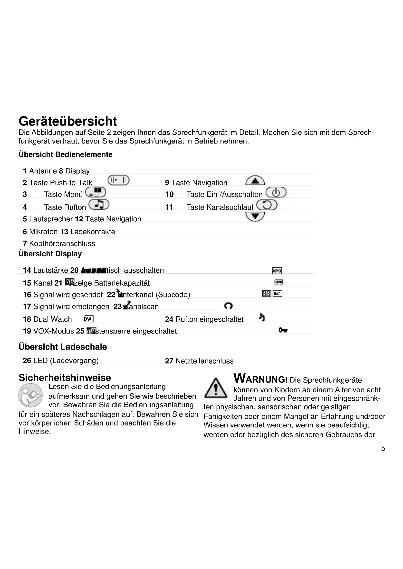 24 Rufton eingeschaltet 19 VOX-Modus 25 Tastensperre eingeschaltet Übersicht Ladeschale 26 LED (Ladevorgang) 27 Netzteilanschluss Übersicht Bedienelemente 1 Antenne 8 Display 2 Taste Push-to-Talk PTT 9 Taste Navigation 3 Taste Menü 10 Taste Ein-/Ausschalten 4 Taste Rufton 11 Taste Kanalsuchlauf 5 Lautsprecher 12 Taste Navigation 6 Mikrofon 13 Ladekontakte 7 Kopfhöreranschluss Sicherheitshinweise Lesen Sie die Bedienungsanleitung aufmerksam und gehen Sie wie beschrieben vor. Bewahren Sie die Bedienungsanleitung für ein späteres Nachschlagen auf. Bewahren Sie sich vor körperlichen Schäden und beachten Sie die Hinweise. Warnung! Die Sprechfunkgeräte können von Kindern ab einem Alter von acht Jahren und von Personen mit eingeschränk- ten physischen, sensorischen oder geistigen Fähigkeiten oder einem Mangel an Erfahrung und/oder Wissen verwendet werden, wenn sie beaufsichtigt werden oder bezüglich des sicheren Gebrauchs der6 Sprechfunkgeräte unterwiesen wurden und die daraus resultierenden Gefahren verstanden haben. Kinder dürfen nicht mit den Sprechfunkgeräten spielen. Reinigung und Benutzerwartung dürfen nicht durch Kinder ohne Beaufsichtigung durchgeführt werden. Warnung! Es besteht Erstickungsge- fahr! Von Kindern fernhalten! Halten Sie Verpackungs- und Schutzfolien sowie Batterien von Kindern fern. Bewahren Sie die Sprechfunkgeräte außerhalb der Reichweite von Kindern auf. Kleinkinder können Kleinteile oder Batterien verschlucken. Falls eine Batterie verschluckt wird, ist umgehend ein Arzt aufzusuchen. Vorsicht! Explosionsgefahr durch Verwendung falscher Batterietypen! Verwenden Sie ausschließlich wiederauad- bare Batterien, die den Angaben in den Technischen Daten entsprechen. Laden Sie KEINE Batterien. Vermischen Sie die verwendeten Batterietypen nicht. Vorsicht! Explosionsgefahr durch unsachgemäßes Austauschen oder Entnehmen der wiederauadbaren Batterien! Ersetzen Sie die Batterien nur durch einen vom Hersteller freigegebenen Typ und entsorgen Sie die Batterien fachgerecht. Vorsicht! Explosionsgefahr durch unsachgemäßes Austauschen oder Entnehmen der wiederauadbaren Batterien! Entfernen Sie die Batterien nicht, während die Batterien geladen werden. Entfernen Sie das Ladekabel von Ihrem Gerät bzw. nehmen Sie das Gerät aus der Ladeschale, bevor Sie die Batterien austauschen oder entnehmen. Vorsicht! Die Sprachübertragung wird über den Lautsprecher wiedergegeben. Halten Sie das Sprechfunkgerät beim Empfangen von Sprachübertragung in etwa 30 cm Entfernung. Wichtig! Verwenden Sie die Sprech- funkgeräte nicht in verbotenen oder explosionsgefährdeten Bereichen! Befolgen Sie die örtlichen Vorschriften. Wichtig! Schützen Sie Ihre Sprechfunk- geräte gegen Nässe, Staub, Flüssigkeiten, Chemikalien, Dämpfe, Hitze und direkte Sonneneinstrahlung. Ihre Sprechfunkgeräte sind nicht wasserdicht, halten Sie die Geräte trocken. Wichtig! Benutzen Sie das Gerät nicht in für den privaten Funkverkehr gesperrten Zonen. Not- und Hilfsdienste können mit diesem Gerät nicht gerufen werden. Wichtig! Beachten Sie die lokalen Vorschriften bzgl. der Verwendung von Funkgeräten, bevor Sie Ihr Funkgerät verwenden. Verpackungsinhalt Prüfen Sie den Verpackungsinhalt Ihrer Sprechfunk- geräte, bevor Sie Ihre Sprechfunkgeräte in Betrieb nehmen. Sollte etwas fehlen oder beschädigt sein, wenden Sie sich an unseren Service. 2 x Sprechfunkgerät PMR 1410 2 x Gürtelclip 2 x Kopfhörer (2,5-mm-Klinkenanschluss) Ladeschale7 Netzstecker 6 x wiederauadbare Batterien (Typ AAA, 1,2 V, 500 mAh) Bedienungsanleitung Bestimmungsgemäße Verwendung Die Sprechfunkgeräte sind geeignet für die Kommu- nikation mit anderen Sprechfunkgeräten des gleichen Standards (446 MHz-PMR-Funk). Jede andere Verwendung gilt als nicht bestimmungsgemäß. Eigenmächtige Veränderungen oder Umbauten sind nicht zulässig. Öffnen Sie das Gerät in keinem Fall selbst und führen Sie keine eigenen Reparaturversu- che durch. Wiederauadbare Batterien einlegen Bevor Sie Ihr Sprechfunkgerät verwenden können, legen Sie die im Lieferumfang enthaltenen Batterien in Ihr Sprechfunkgerät ein. 1 Nehmen Sie die Batteriefach- abdeckung ab. Schieben Sie die Batteriefachabdeckung mit leichtem Druck nach vorne. Vorsicht! Explosionsgefahr durch Verwendung falscher Batterietypen! Verwen- den Sie ausschließlich wiederauf- ladbare Batterien, die den Angaben in den Technischen Daten entsprechen. Laden Sie KEINE Batterien. Vermischen Sie die verwendeten Batterietypen nicht. 2 Legen Sie drei geeignete Batterien polrichtig in das Batteriefach ein. 3 Setzen Sie die Batteriefachabdeckung wieder auf. Die Batteriefachabdeckung rastet hörbar ein. Wiederauadbare Batterien laden Laden Sie die wiederauadbaren Batterien auf, bevor diese vollständig aufgebraucht sind. 1 Schließen Sie das Netzteil an eine leicht zugängli- che und in der Nähe bendliche Steckdose an. 2 Schließen Sie den Netzstecker an den Netzteilan- schluss der Ladeschale an. 3 Stellen Sie die Sprechfunkgeräte in die Ladeschale. Während die Batterien geladen werden, leuchten die Leuchtanzeigen an der Vorderseite der Ladeschale dauerhaft rot. 4 Entnehmen Sie die Sprechfunkgeräte nach 8 Stunden aus der Ladeschale. 5 Ziehen Sie das Netzteil aus der Steckdose. Sprechfunkgerät einschalten Drücken und halten Sie die Taste für etwa 3 Sekunden. Das Sprechfunkgerät wird einge- schaltet, das Display zeigt Ihnen den gewählten Ka- nal - , die Lautstärke und die aktuelle Batteriekapazität . Sehen Sie nur noch einen Balken , sind die Batterien fast aufgebraucht. Laden Sie die Batterien zeitnah auf.8 Sprechfunkgerät ausschalten Drücken und halten Sie die Taste für etwa drei Sekunden. Das Sprechfunkgerät wird ausgeschaltet, das Display erlischt. Sprechfunkgerät bedienen Wenn Sie über die Sprechfunkgeräte kommunizie- ren möchten, müssen die Sprechfunkgeräte einge- schaltet und auf den gleichen Kanal eingestellt sein. Für eine erfolgreiche Verbindung müssen sich di