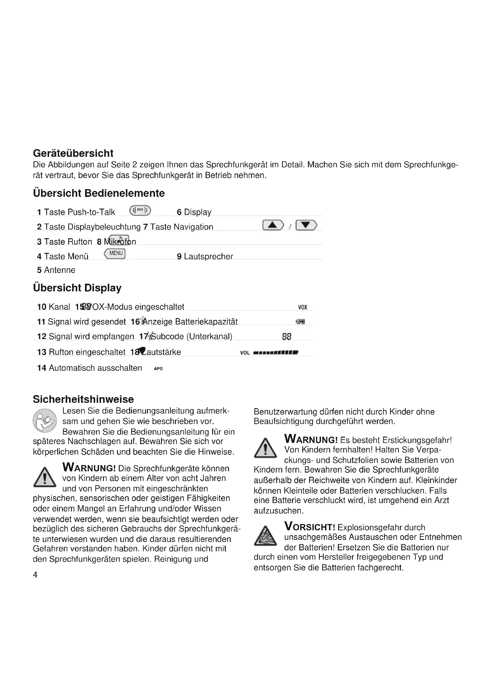 3 Taste Rufton 8 Mikrofon 4 Taste Menü MENU 9 Lautsprecher 5 Antenne Übersicht Display 10 Kanal 15 VOX-Modus eingeschaltet 11 Signal wird gesendet 16 Anzeige Batteriekapazität 12 Signal wird empfangen 17 Subcode (Unterkanal) 13 Rufton eingeschaltet 18 Lautstärke 14 Automatisch ausschalten Sicherheitshinweise Lesen Sie die Bedienungsanleitung aufmerk- sam und gehen Sie wie beschrieben vor Bewahren Sie die Bedienungsanleitung für ein späteres Nachschlagen auf Bewahren Sie sich vor körperlichen Schäden und beachten Sie die Hinweise Warnung! Die Sprechfunkgeräte können von Kindern ab einem Alter von acht Jahren und von Personen mit eingeschränkten physischen, sensorischen oder geistigen Fähigkeiten oder einem Mangel an Erfahrung und/oder Wissen verwendet werden, wenn sie beaufsichtigt werden oder bezüglich des sicheren Gebrauchs der Sprechfunkgerä- te unterwiesen wurden und die daraus resultierenden Gefahren verstanden haben Kinder dürfen nicht mit den Sprechfunkgeräten spielen Reinigung und Benutzerwartung dürfen nicht durch Kinder ohne Beaufsichtigung durchgeführt werden Warnung! Es besteht Erstickungsgefahr! Von Kindern fernhalten! Halten Sie Verpa- ckungs- und Schutzfolien sowie Batterien von Kindern fern Bewahren Sie die Sprechfunkgeräte außerhalb der Reichweite von Kindern auf Kleinkinder können Kleinteile oder Batterien verschlucken Falls eine Batterie verschluckt wird, ist umgehend ein Arzt aufzusuchen Vorsicht! Explosionsgefahr durch unsachgemäßes Austauschen oder Entnehmen der Batterien! Ersetzen Sie die Batterien nur durch einen vom Hersteller freigegebenen Typ und entsorgen Sie die Batterien fachgerecht Vorsicht! Die Sprachübertragung wird über den Lautsprecher wiedergegeben Halten Sie das Sprechfunkgerät beim Empfangen von Sprachübertragung in etwa 30 cm Entfernung So vermeiden Sie eine eventuelle Schädigung des Gehörs Wichtig! Verwenden Sie die Sprechfunkge- räte nicht in verbotenen oder explosionsgefähr- deten Bereichen! Befolgen Sie die örtlichen Vorschriften! Wichtig! Schützen Sie Ihre Sprechfunkgerä- te gegen Nässe, Staub, Flüssigkeiten, Chemikalien, Dämpfe, Hitze und direkte Sonneneinstrahlung Ihre Sprechfunkgeräte sind nicht wasserdicht, halten Sie die Geräte trocken Wichtig! Die Sprechfunkgeräte enthalten keine vom Benutzer zu wartende oder auszutauschende Teile Reparaturen dürfen ausschließlich durch qualiziertes Personal ausgeführt werden - zu diesem Zweck wenden Sie sich bitte an unseren Service Wichtig! Benutzen Sie das Gerät nicht in ausgewiesenen Sicherheitszonen und in für den privaten Funkverkehr gesperrten Zonen Not- und Hilfsdienste können mit diesem Gerät nicht gerufen werden Wichtig! Beachten Sie die lokalen Vorschrif- ten bzgl der Verwendung von Funkgeräten, bevor Sie Ihr Funkgerät verwenden Verpackungsinhalt Prüfen Sie den Verpackungsinhalt Ihrer Sprechfunkge- räte, bevor Sie Ihre Sprechfunkgeräte in Betrieb neh- men Sollte etwas fehlen oder beschädigt sein, wenden Sie sich an unseren Service 2x Sprechfunkgerät PMR 1208 2x Gürtelclip Bedienungsanleitung5 Geräteübersicht Die Abbildungen auf Seite 2 zeigen Ihnen das Sprechfunkgerät im Detail Machen Sie sich mit dem Sprechfunkge- rät vertraut, bevor Sie das Sprechfunkgerät in Betrieb nehmen Übersicht Bedienelemente 1 Taste Push-to-Talk PTT 6 Display 2 Taste Displaybeleuchtung 7 Taste Navigation