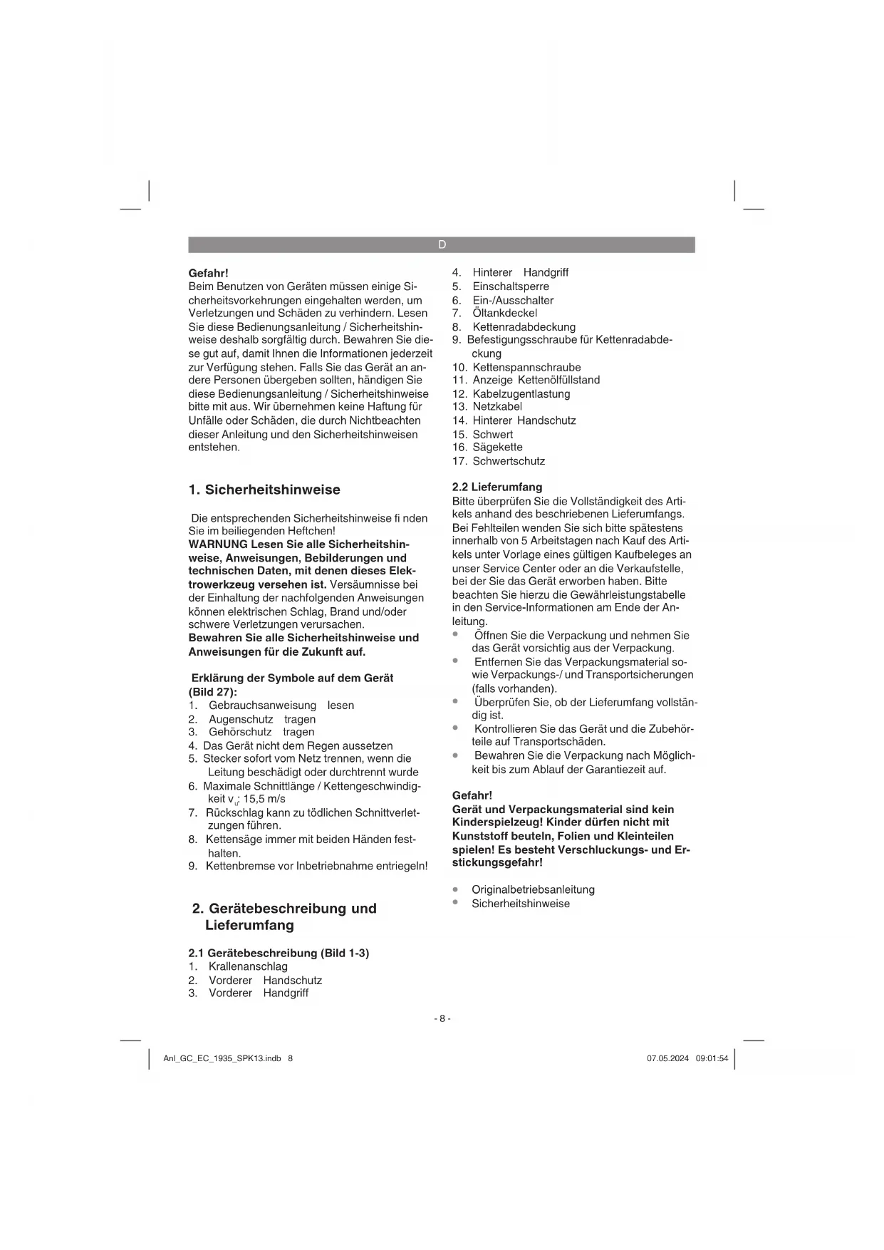Motorbremse Der Motor bremst die Sägekette ab, sobald der Ein- /Ausschalter (Abb.1/Pos.6) losgelassen oder die Stromzufuhr unterbrochen wurde. Dadurch wird die Gefahr einer Verletzung durch eine nach- laufende Kette deutlich gesenkt. Kettenbremse Die Kettenbremse ist ein Schutzmechanismus, der über den vorderen Handschutz (Abb.1/Pos.2) ausgelöst wird. Wenn die Kettensäge durch einen Rückschlag zurückgeschleudert wird, löst die Kettenbremse aus und stoppt die Sägekette in weniger als 0,1 Sekunden. Prüfen Sie regelmäßig die Funktion der Ketten- bremse. Klappen Sie dazu den vorderen Hand- schutz (Abb.1/Pos.2) nach vorne und schalten Sie die Kettensäge kurz ein. Die Sägekette darf nicht anlaufen. Ziehen Sie den vorderen Handschutz (Abb.1/ Pos.2) zurück, bis dieser einrastet, um die Ketten- bremse zu lösen. Gefahr! Benutzen Sie die Säge nicht, wenn die Schutzeinrichtungen nicht einwandfrei funktio- nieren. Versuchen Sie nicht, sicherheitsrelevante Schutz- einrichtungen selbst zu reparieren, sondern wenden Sie sich an unseren Service oder eine ähnlich qualifi zierte Werkstatt. Handschutz Der vordere Handschutz (zugleich Kettenbremse) (Abb. 1/Pos.2) und der hintere Handschutz (Abb. 2/Pos. 14) schützen die Finger vor Verlet- zungen durch den Kontakt mit der Sägekette, falls diese durch Überlastung reißt. Anl_GC_EC_1935_SPK13.indb 11Anl_GC_EC_1935_SPK13.indb 11 07.05.2024 09:01:5507.05.2024 09:01:55D