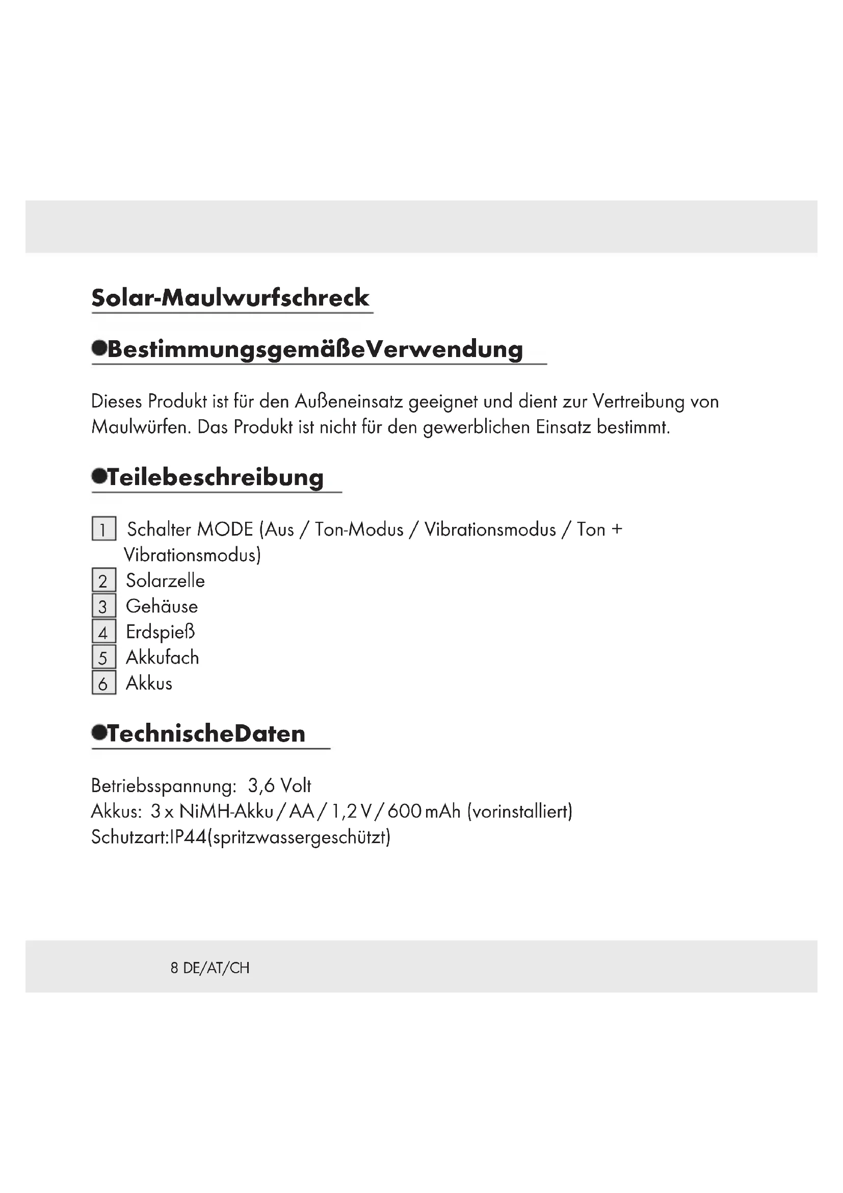 57 DE/AT/CH Bestimmungsgemäße Verwendung .................................Seite 8 Teilebeschreibung ............................................................................Seite 8 Technische Daten ..............................................................................Seite 8 Sicherheitshinweise ........................................................................Seite 9 Produktspezifische Sicherheitshinweise ......................................................Seite 10 Sicherheitshinweise für Akkus ..................................................................... Seite 10 Inbetriebnahme ................................................................................. Seite 11 Montage ...................................................................................................... Seite 11 Akkus aufladen ............................................................................................Seite 12 Akkus austauschen ...................................................................................... Seite 12 Wartung und Reinigung .............................................................Seite 12 Fehler beheben ..................................................................................Seite 13 Entsorgung ............................................................................................. Seite 13 Garantie ...................................................................................................Seite 148 DE/AT/CH Solar-Maulwurfschreck Bestimmungsgemäße Verwendung Dieses Produkt ist für den Außeneinsatz geeignet und dient zur Vertreibung von Maulwürfen. Das Produkt ist nicht für den gewerblichen Einsatz bestimmt. Teilebeschreibung