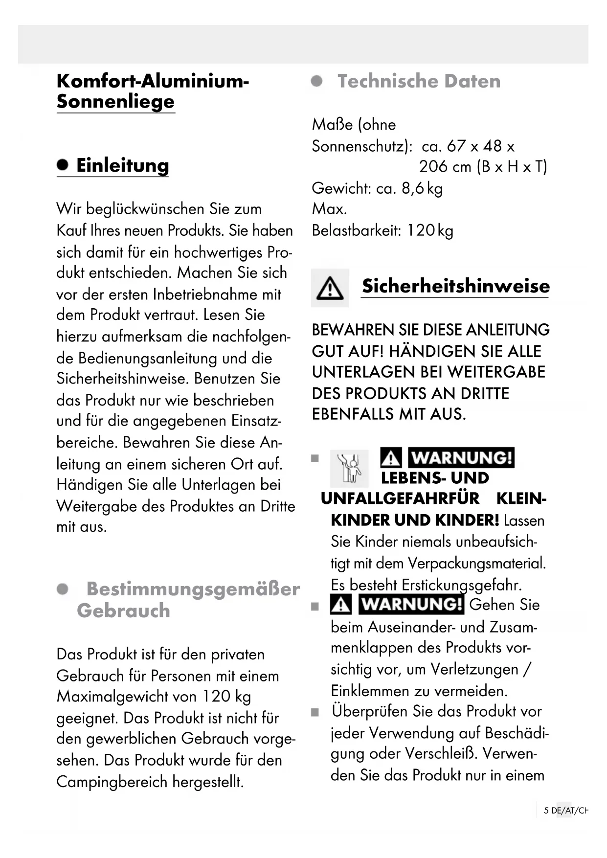 SCHÄDIGUNG! Wir haften nicht für Unfälle, die infolge der Nichtbeachtung der oben ge- nannten Sicherheitshinweise oder durch falsche Handhabung auftreten. Reinigung und Pflege Reinigen Sie das Produkt mit einem feuchten Tuch und einem milden Reinigungsmittel. Lassen Sie alle Teile gut trocknen, bevor Sie das Produkt wieder verpacken. Dies verhindert die Bildung von Schimmel, Gerüchen und Verfärbungen.7 DE/AT/CH Lagerung Lagern Sie das Produkt in einem geschützten, trockenen Raum. Lagern Sie das trockene und saubere Produkt immer bei Raumtemperatur. Entsorgung Die Verpackung besteht aus umwelt- freundlichen Materialien, die Sie über die örtlichen Recyclingstellen entsor- gen können. Möglichkeiten zur Entsorgung des ausgedienten Produkts erfahren Sie bei Ihrer Gemeinde- oder Stadtver- waltung. Garantie Das Produkt wurde nach strengen Qualitätsrichtlinien sorgfältig produ- ziert und vor Anlieferung gewissen- haft geprüft. Im Falle von Mängeln dieses Produkts stehen Ihnen gegen den Verkäufer des Produkts gesetz- liche Rechte zu. Diese gesetzlichen Rechte werden durch unsere im Fol- genden dargestellte Garantie nicht eingeschränkt. Sie erhalten auf dieses Produkt 3 Jahre Garantie ab Kaufdatum. Die Garantiefrist beginnt mit dem Kaufdatum. Bitte bewahren Sie den Original-Kassenbon gut auf. Diese Unterlage wird als Nachweis für den Kauf benötigt. Tritt innerhalb von 3 Jahren ab dem Kaufdatum dieses Produkts ein Ma- terial- oder Fabrikationsfehler auf, wird das Produkt von uns – nach unserer Wahl – für Sie kostenlos re- pariert oder ersetzt. Diese Garantie verfällt, wenn das Produkt beschädigt, nicht sachgemäß benutzt oder ge- wartet wurde. Die Garantieleistung gilt für Material- oder Fabrikationsfehler. Diese Garan- tie erstreckt sich nicht auf Produktteile, die normaler Abnutzung ausgesetzt sind (z. B. Batterien) und daher als Verschleißteile angesehen werden können oder Beschädigungen an zerbrechlichen Teilen, z. B. Schalter, Akkus oder die aus Glas gefertigt sind.8 FR/CH Bain de soleil confort en aluminium Introduction Nous vous félicitons pour l‘achat de votre nouveau produit. Vous avez opté pour un produit de grande qualité. Avant la première mise en service, vous devez vous familiariser avec toutes les fonctions du produit. Veuillez lire attentivement le mode d’emploi ci-dessous et les consignes de sécurité. N’utilisez le produit que pour l’usage décrit et les domaines d’application cités. Conserver ces instructions dans un lieu sûr. Si vous donnez le produit à des tiers, re- mettez-leur également la totalité des documents. Utilisation conforme Ce produit est uniquement destiné à l‘usage privé, pour des personnes d‘un poids max. de 120 kg. Le produit n‘est pas destiné à un usage com- mercial. Le produit a été fabriqué pour le domaine du camping. Caractéristiques techniques Dimensions (sans protection solaire) : env. 67 x 48 x 206 cm (l x H x P) Poids : env. 8,6 kg Charge max. : 120 kg Consignes de sécurité CONSERVEZ SOIGNEUSEMENT