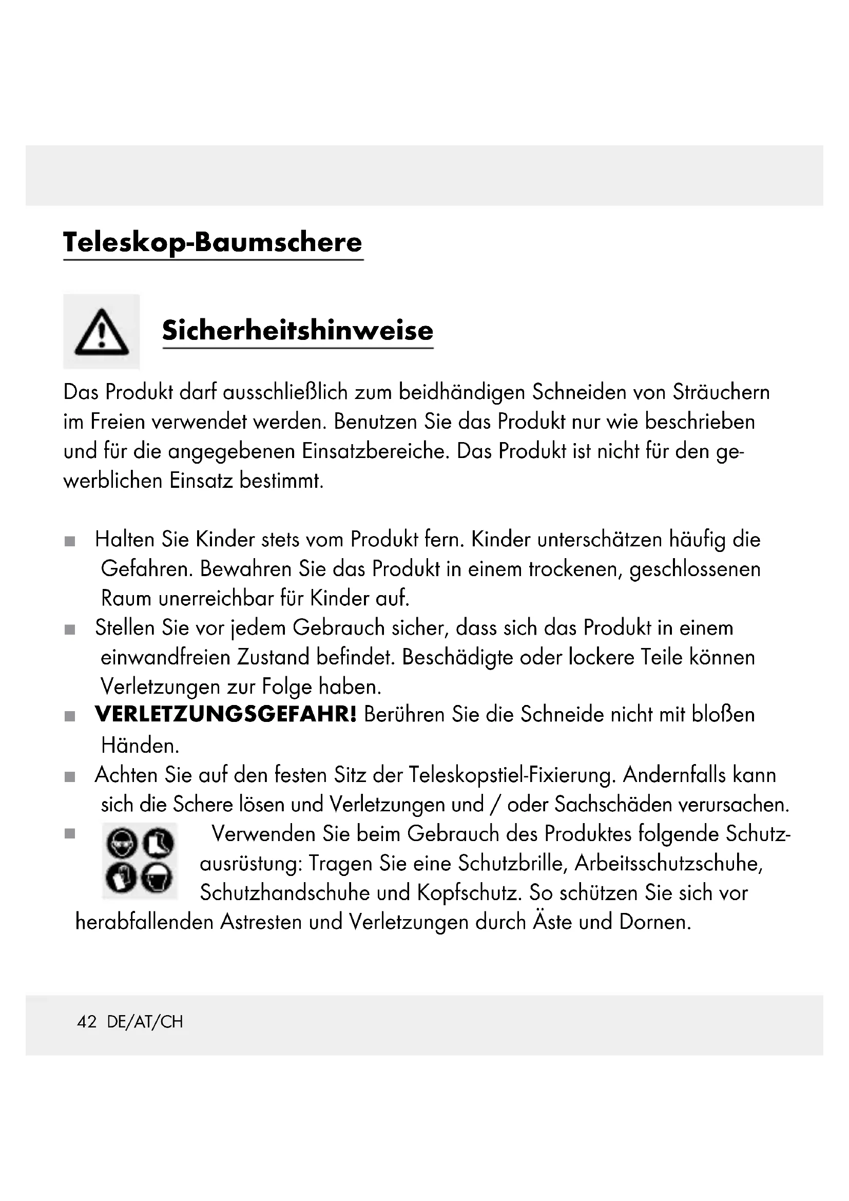 Verwijdering De verpakking bestaat uit milieuvriendelijke materialen die u via de plaatselijke recyclingdiensten kunt afvoeren. Informatie over de mogelijkheden, hoe u het afgedankte product weg kunt werpen, worden verstrekt door uw gemeentelijke overheid.41 DE/AT/CH Sicherheitshinweise ..................................................................Seite 42 Sägeblatt montieren ................................................................Seite 43 Astschere verwenden .............................................................Seite 44 Schnittwinkel einstellen ........................................................ Seite 44 Teleskopstange verlängern ..............................................Seite 45 Äste schneiden und sägen .................................................. Seite 45 Pflegehinweise .............................................................................Seite 45 Entsorgung ....................................................................................... Seite 4642 DE/AT/CH Teleskop-Baumschere Sicherheitshinweise Das Produkt darf ausschließlich zum beidhändigen Schneiden von Sträuchern im Freien verwendet werden. Benutzen Sie das Produkt nur wie beschrieben und für die angegebenen Einsatzbereiche. Das Produkt ist nicht für den ge- werblichen Einsatz bestimmt. J Halten Sie Kinder stets vom Produkt fern. Kinder unterschätzen häufig die Gefahren. Bewahren Sie das Produkt in einem trockenen, geschlossenen Raum unerreichbar für Kinder auf. J Stellen Sie vor jedem Gebrauch sicher, dass sich das Produkt in einem einwandfreien Zustand befindet. Beschädigte oder lockere Teile können Verletzungen zur Folge haben. J VERLETZUNGSGEFAHR! Berühren Sie die Schneide nicht mit bloßen Händen. J Achten Sie auf den festen Sitz der Teleskopstiel-Fixierung. Andernfalls kann sich die Schere lösen und Verletzungen und / oder Sachschäden verursachen.