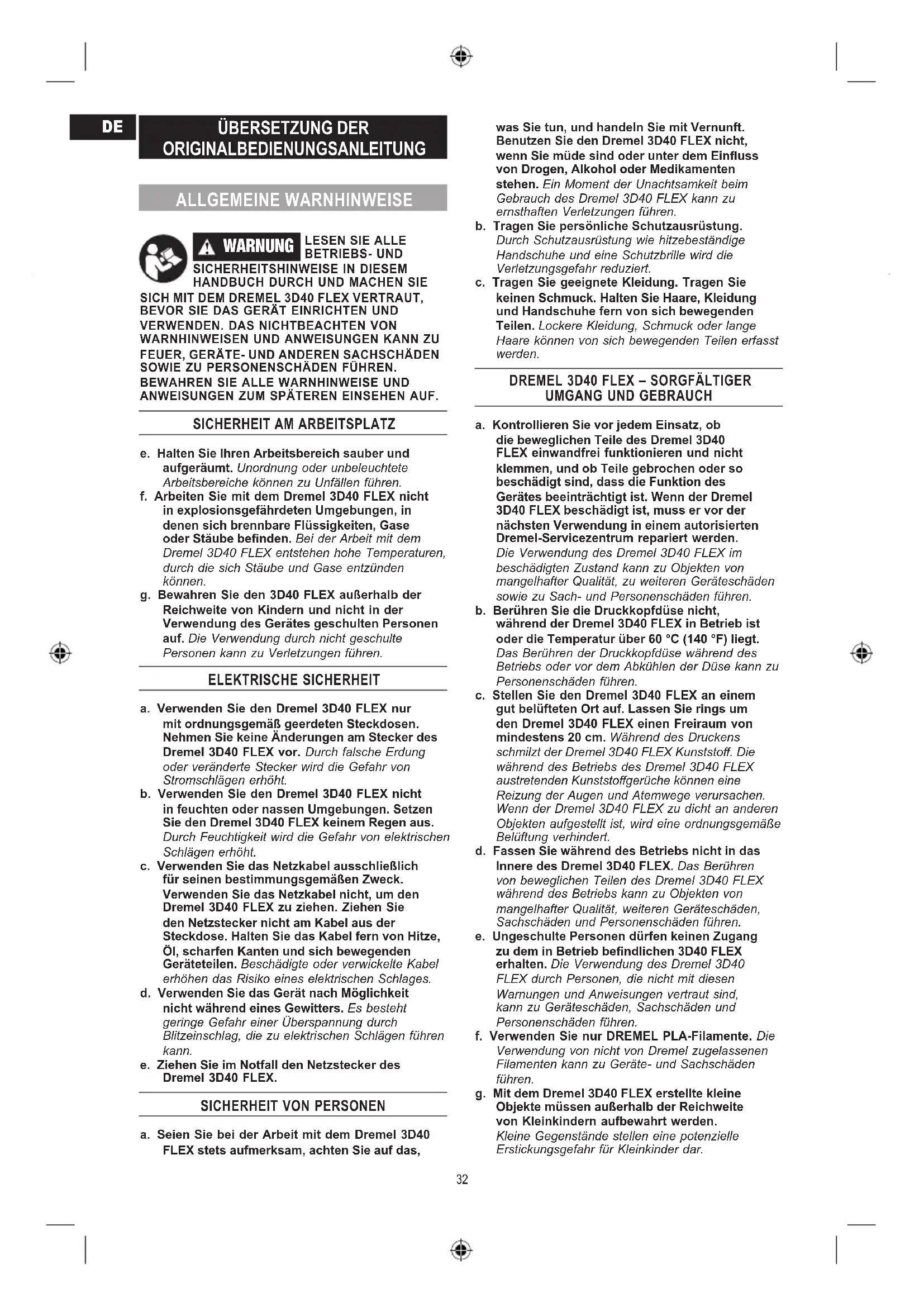 a. Kontrollieren Sie vor jedem Einsatz, ob die beweglichen Teile des Dremel 3D40 FLEX einwandfrei funktionieren und nicht klemmen, und ob Teile gebrochen oder so beschädigt sind, dass die Funktion des Gerätes beeinträchtigt ist. Wenn der Dremel 3D40 FLEX beschädigt ist, muss er vor der nächsten Verwendung in einem autorisierten Dremel-Servicezentrum repariert werden. Die Verwendung des Dremel 3D40 FLEX im beschädigten Zustand kann zu Objekten von mangelhafter Qualität, zu weiteren Geräteschäden sowie zu Sach- und Personenschäden führen. b. Berühren Sie die Druckkopfdüse nicht, während der Dremel 3D40 FLEX in Betrieb ist oder die Temperatur über 60 °C (140 °F) liegt. Das Berühren der Druckkopfdüse während des Betriebs oder vor dem Abkühlen der Düse kann zu Personenschäden führen. c. Stellen Sie den Dremel 3D40 FLEX an einem gut belüfteten Ort auf. Lassen Sie rings um den Dremel 3D40 FLEX einen Freiraum von mindestens 20 cm. Während des Druckens schmilzt der Dremel 3D40 FLEX Kunststo. Die während des Betriebs des Dremel 3D40 FLEX austretenden Kunststogerüche können eine Reizung der Augen und Atemwege verursachen. Wenn der Dremel 3D40 FLEX zu dicht an anderen Objekten aufgestellt ist, wird eine ordnungsgemäße Belüftung verhindert. d. Fassen Sie während des Betriebs nicht in das Innere des Dremel 3D40 FLEX. Das Berühren von beweglichen Teilen des Dremel 3D40 FLEX während des Betriebs kann zu Objekten von mangelhafter Qualität, weiteren Geräteschäden, Sachschäden und Personenschäden führen. e. Ungeschulte Personen dürfen keinen Zugang zu dem in Betrieb bendlichen 3D40 FLEX erhalten. Die Verwendung des Dremel 3D40 FLEX durch Personen, die nicht mit diesen Warnungen und Anweisungen vertraut sind, kann zu Geräteschäden, Sachschäden und Personenschäden führen. f. Verwenden Sie nur DREMEL PLA-Filamente. Die Verwendung von nicht von Dremel zugelassenen Filamenten kann zu Geräte- und Sachschäden führen. g. Mit dem Dremel 3D40 FLEX erstellte kleine Objekte müssen außerhalb der Reichweite von Kleinkindern aufbewahrt werden. Kleine Gegenstände stellen eine potenzielle Erstickungsgefahr für Kleinkinder dar.