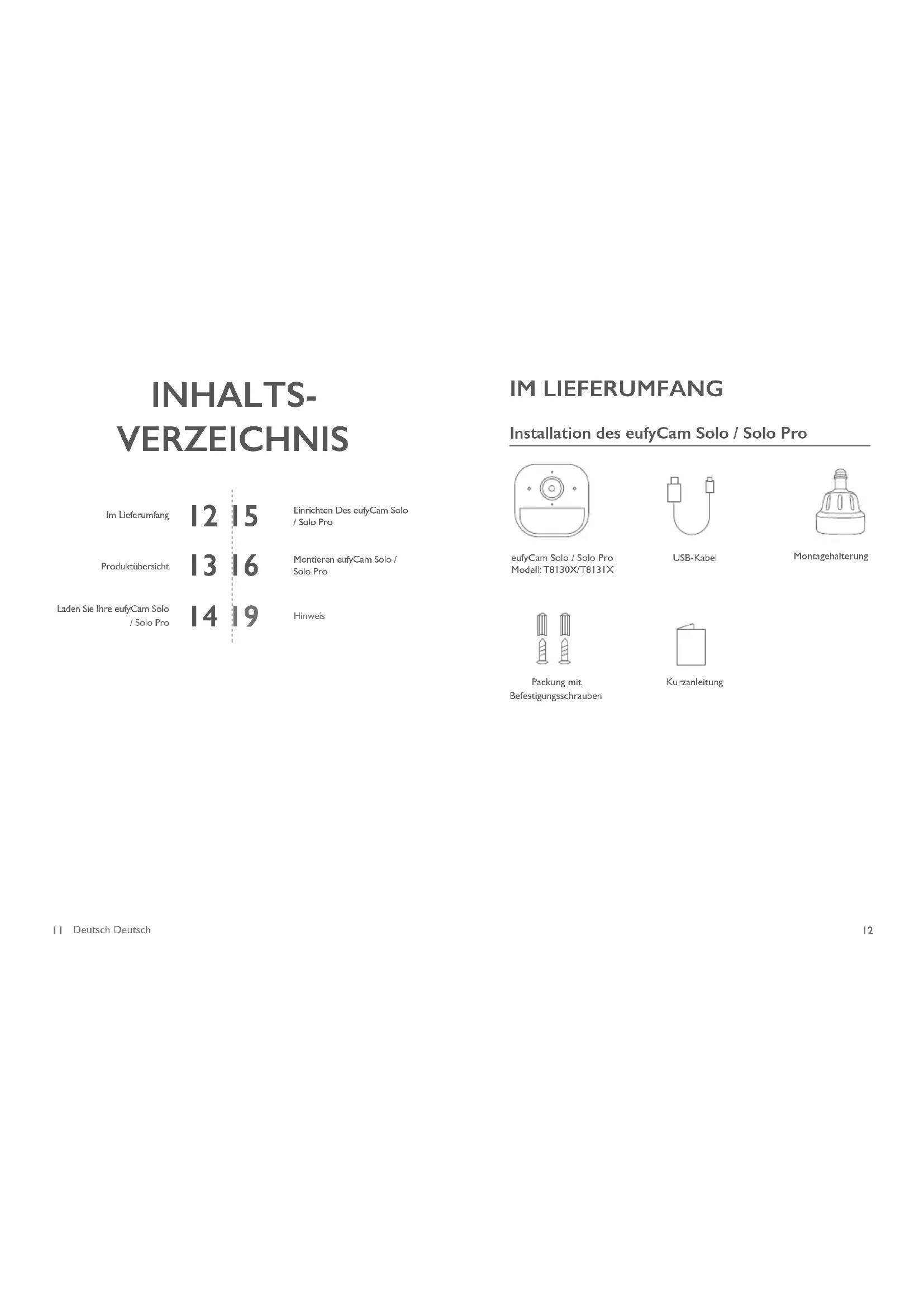 IM LIEFERUMFANG Installation des eufyCam Solo / Solo Pro eufyCam Solo / Solo ProModell: T8130X/T8131X Packung mit BefestigungsschraubenUSB-KabelKurzanleitung Montagehalterung INHALTS- VERZEICHNIS Im Lieferumfang Einrichten Des eufyCam Solo / Solo ProProduktübersicht Montieren eufyCam Solo / Solo ProLaden Sie Ihre eufyCam Solo / Solo Pro Hinweis13 Deutsch Deutsch