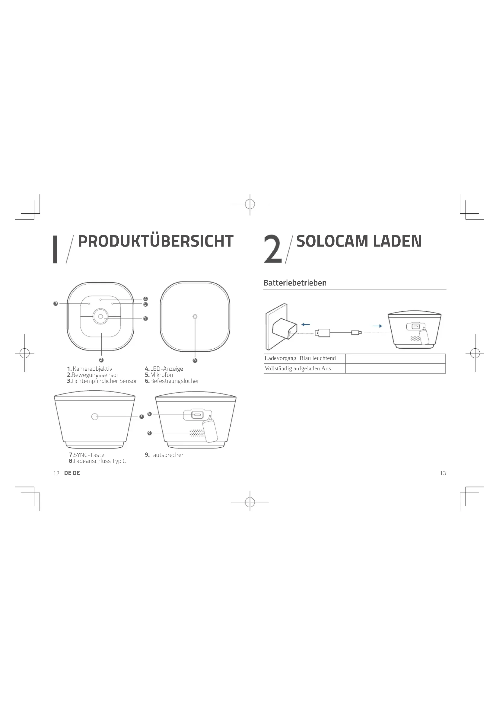 SOLOCAM LADEN Batteriebetrieben Ladevorgang Blau leuchtend Vollständig aufgeladen Aus14 DE DE