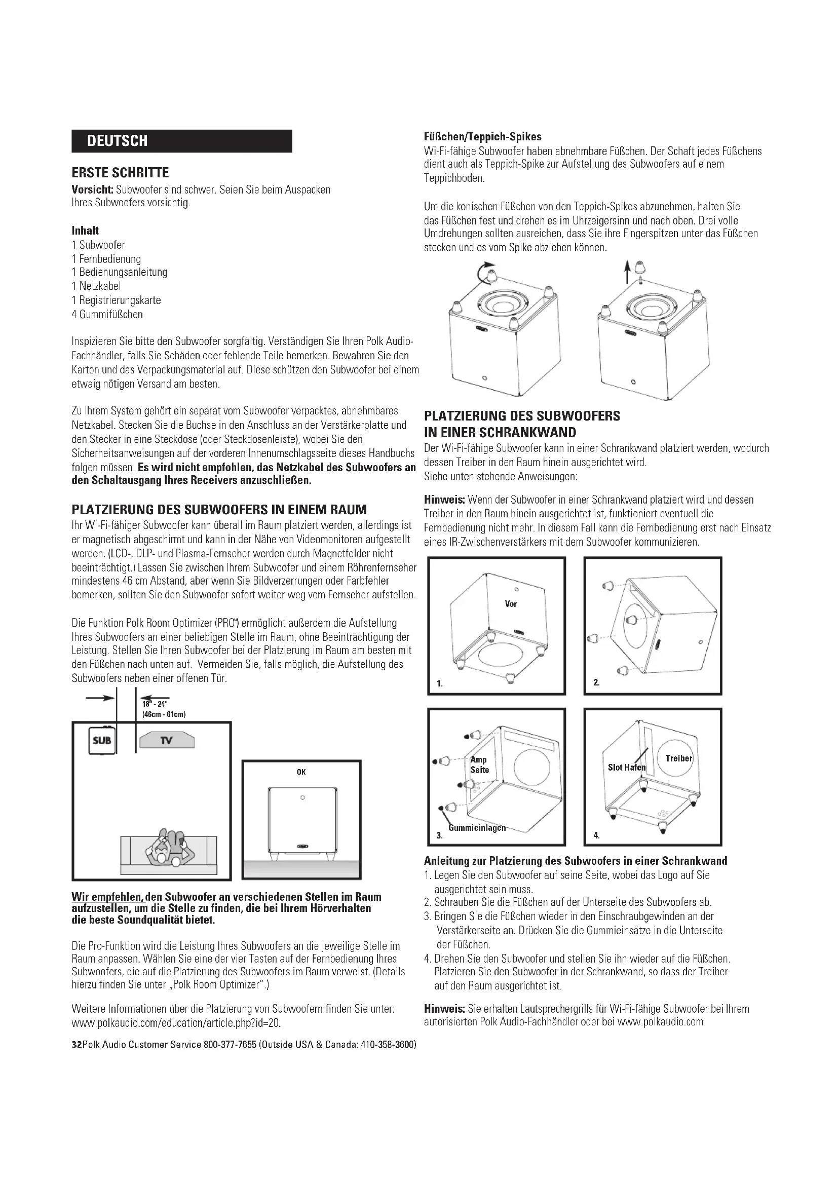 na nota en el rendimiento inalámbrico: Customer Service Hours of Operation: Monday-Friday, 9AM-5:30PM EST polkcs@polkaudio.com 3132 Polk Audio Customer Service 800-377-7655 (Outside USA & Canada: 410-358-3600) ERSTE SCHRITTE Vorsicht: Subwoofer sind schwer. Seien Sie beim Auspacken Ihres Subwoofers vorsichtig. Inhalt 1 Subwoofer 1 Fernbedienung 1 Bedienungsanleitung