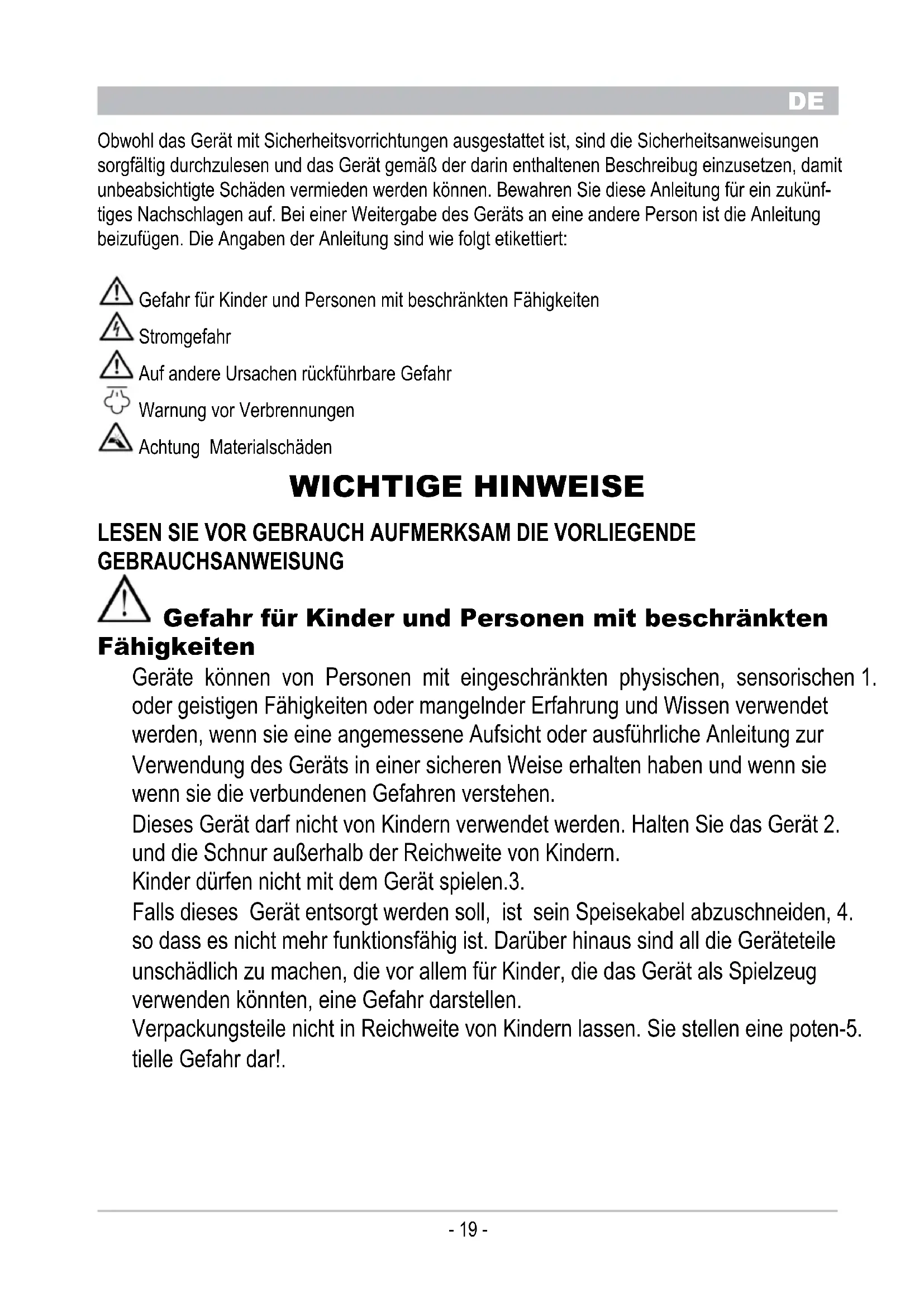 Obwohl das Gerät mit Sicherheitsvorrichtungen ausgestattet ist, sind die Sicherheitsanweisungen sorgfältig durchzulesen und das Gerät gemäß der darin enthaltenen Beschreibug einzusetzen, damit unbeabsichtigte Schäden vermieden werden können. Bewahren Sie diese Anleitung für ein zukünf- tiges Nachschlagen auf. Bei einer Weitergabe des Geräts an eine andere Person ist die Anleitung beizufügen. Die Angaben der Anleitung sind wie folgt etikettiert: Gefahr für Kinder und Personen mit beschränkten Fähigkeiten Stromgefahr Auf andere Ursachen rückführbare Gefahr Warnung vor Verbrennungen Achtung Materialschäden WICHTIGE HINWEISE lEsEN sIE vOR GEBRAuCH AuFMERKsAM DIE vORlIEGENDE GEBRAuCHsANWEIsuNG Gefahr für Kinder und Personen mit beschränkten Fähigkeiten Geräte können von Personen mit eingeschränkten physischen, sensorischen 1. oder geistigen Fähigkeiten oder mangelnder Erfahrung und Wissen verwendet werden, wenn sie eine angemessene Aufsicht oder ausführliche Anleitung zur Verwendung des Geräts in einer sicheren Weise erhalten haben und wenn sie wenn sie die verbundenen Gefahren verstehen. Dieses Gerät darf nicht von Kindern verwendet werden. Halten Sie das Gerät 2. und die Schnur außerhalb der Reichweite von Kindern. Kinder dürfen nicht mit dem Gerät spielen.3. Falls dieses Gerät entsorgt werden soll, ist sein Speisekabel abzuschneiden, 4. so dass es nicht mehr funktionsfähig ist. Darüber hinaus sind all die Geräteteile unschädlich zu machen, die vor allem für Kinder, die das Gerät als Spielzeug verwenden könnten, eine Gefahr darstellen. Verpackungsteile nicht in Reichweite von Kindern lassen. Sie stellen eine poten-5. tielle Gefahr dar!.DE
