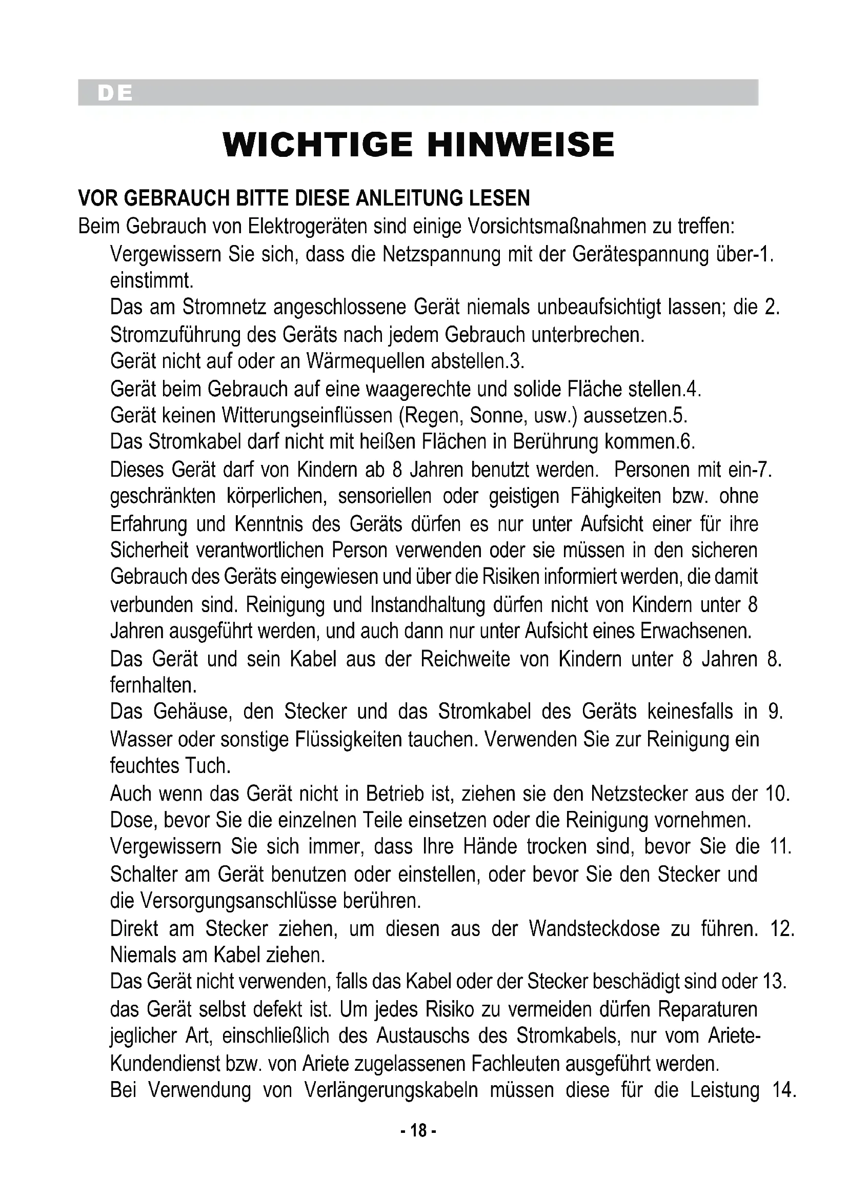 Beim Gebrauch von Elektrogeräten sind einige Vorsichtsmaßnahmen zu treffen: Vergewissern Sie sich, dass die Netzspannung mit der Gerätespannung über-1. einstimmt. Das am Stromnetz angeschlossene Gerät niemals unbeaufsichtigt lassen; die 2. Stromzuführung des Geräts nach jedem Gebrauch unterbrechen. Gerät nicht auf oder an Wärmequellen abstellen.3. Gerät beim Gebrauch auf eine waagerechte und solide Fläche stellen.4. Gerät keinen Witterungseinflüssen (Regen, Sonne, usw.) aussetzen.5. Das Stromkabel darf nicht mit heißen Flächen in Berührung kommen.6. Dieses Gerät darf von Kindern ab 8 Jahren benutzt werden. Personen mit ein-7. geschränkten körperlichen, sensoriellen oder geistigen Fähigkeiten bzw. ohne Erfahrung und Kenntnis des Geräts dürfen es nur unter Aufsicht einer für ihre Sicherheit verantwortlichen Person verwenden oder sie müssen in den sicheren Gebrauch des Geräts eingewiesen und über die Risiken informiert werden, die damit verbunden sind. Reinigung und Instandhaltung dürfen nicht von Kindern unter 8 Jahren ausgeführt werden, und auch dann nur unter Aufsicht eines Erwachsenen. Das Gerät und sein Kabel aus der Reichweite von Kindern unter 8 Jahren 8. fernhalten. Das Gehäuse, den Stecker und das Stromkabel des Geräts keinesfalls in 9. Wasser oder sonstige Flüssigkeiten tauchen. Verwenden Sie zur Reinigung ein feuchtes Tuch. Auch wenn das Gerät nicht in Betrieb ist, ziehen sie den Netzstecker aus der 10. Dose, bevor Sie die einzelnen Teile einsetzen oder die Reinigung vornehmen. Vergewissern Sie sich immer, dass Ihre Hände trocken sind, bevor Sie die 11. Schalter am Gerät benutzen oder einstellen, oder bevor Sie den Stecker und die Versorgungsanschlüsse berühren. Direkt am Stecker ziehen, um diesen aus der Wandsteckdose zu führen. 12. Niemals am Kabel ziehen. Das Gerät nicht verwenden, falls das Kabel oder der Stecker beschädigt sind oder 13. das Gerät selbst defekt ist. Um jedes Risiko zu vermeiden dürfen Reparaturen jeglicher Art, einschließlich des Austauschs des Stromkabels, nur vom Ariete- Kundendienst bzw. von Ariete zugelassenen Fachleuten ausgeführt werden. Bei Verwendung von Verlängerungskabeln müssen diese für die Leistung 14.DE