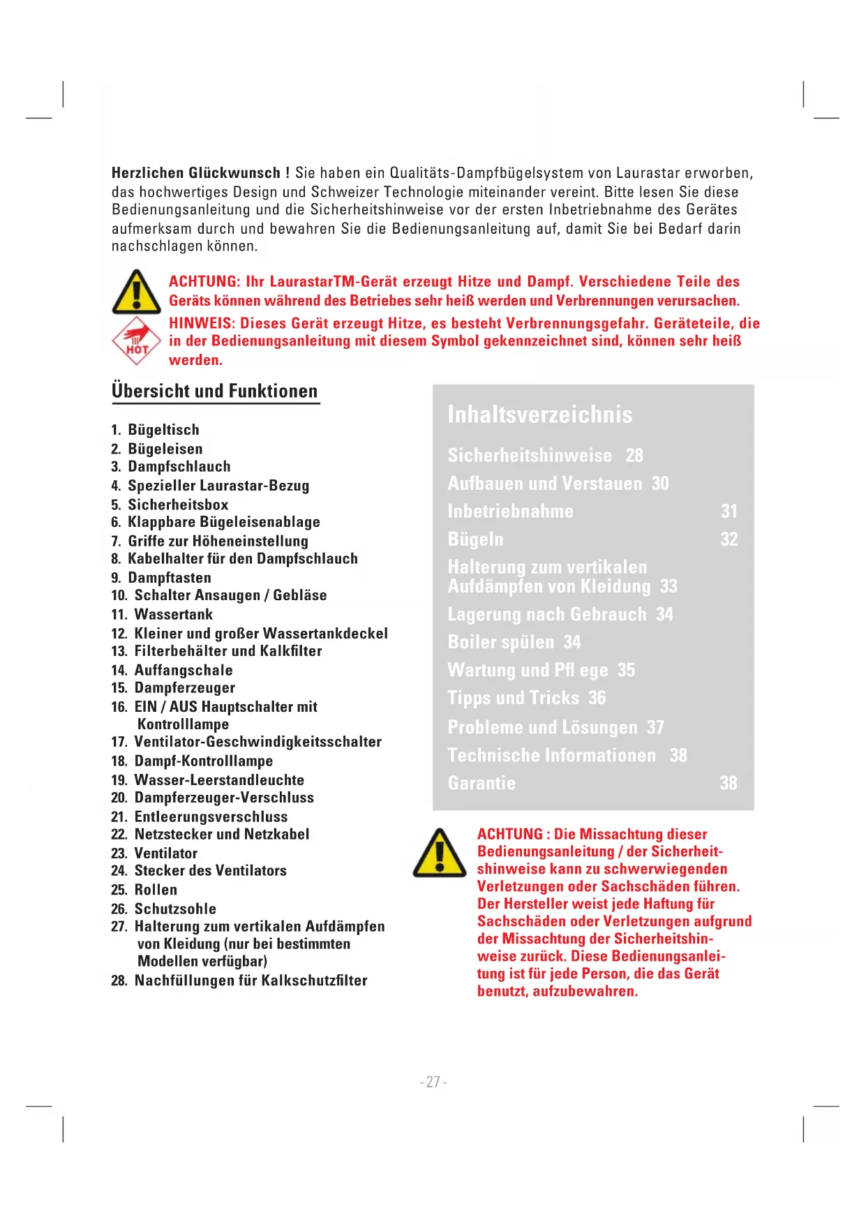 national guarantee went into effect in June 2017. EN- 27 - ACHTUNG : Die Missachtung dieser Bedienungsanleitung / der Sicherheit- shinweise kann zu schwerwiegenden Verletzungen oder Sachschäden führen. Der Hersteller weist jede Haftung für Sachschäden oder Verletzungen aufgrund der Missachtung der Sicherheitshin- weise zurück. Diese Bedienungsanlei- tung ist für jede Person, die das Gerät benutzt, aufzubewahren. ACHTUNG: Ihr LaurastarTM-Gerät erzeugt Hitze und Dampf. Verschiedene Teile des Geräts können während des Betriebes sehr heiß werden und Verbrennungen verursachen. HINWEIS: Dieses Gerät erzeugt Hitze, es besteht Verbrennungsgefahr. Geräteteile, die in der Bedienungsanleitung mit diesem Symbol gekennzeichnet sind, können sehr heiß werden. Inhaltsverzeichnis Sicherheitshinweise 28 Aufbauen und Verstauen 30 Inbetriebnahme 31 Bügeln 32 Halterung zum vertikalen Aufdämpfen von Kleidung 33 Lagerung nach Gebrauch 34 Boiler spülen 34 Wartung und P ege 35 Tipps und Tricks 36 Probleme und Lösungen 37 Technische Informationen 38 Garantie 38 Herzlichen Glückwunsch ! Sie haben ein Qualitäts-Dampfbügelsystem von Laurastar erworben, das hochwertiges Design und Schweizer Technologie miteinander vereint. Bitte lesen Sie diese Bedienungsanleitung und die Sicherheitshinweise vor der ersten Inbetriebnahme des Gerätes aufmerksam durch und bewahren Sie die Bedienungsanleitung auf, damit Sie bei Bedarf darin nachschlagen können. Übersicht und Funktionen
