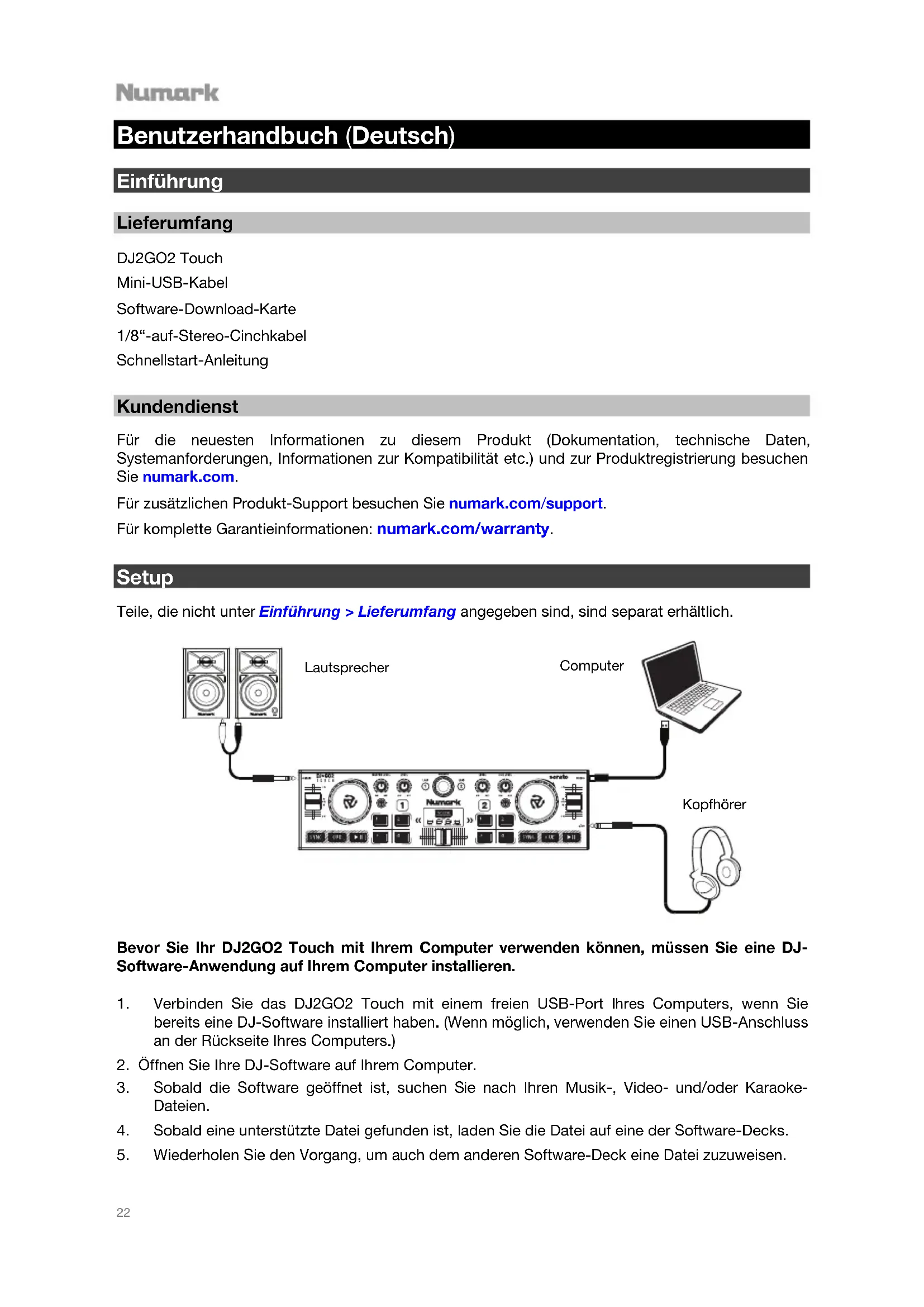 Benutzerhandbuch (Deutsch) Einführung Lieferumfang DJ2GO2 Touch Mini-USB-Kabel Software-Download-Karte 1/8“-auf-Stereo-Cinchkabel Schnellstart-Anleitung Kundendienst Für die neuesten Informationen zu diesem Produkt (Dokumentation, technische Daten, Systemanforderungen, Informationen zur Kompatibilität etc.) und zur Produktregistrierung besuchen Sie numark.com. Für zusätzlichen Produkt-Support besuchen Sie numark.com/support. Für komplette Garantieinformationen: numark.com/warranty. Setup Teile, die nicht unter Einführung > Lieferumfang angegeben sind, sind separat erhältlich.