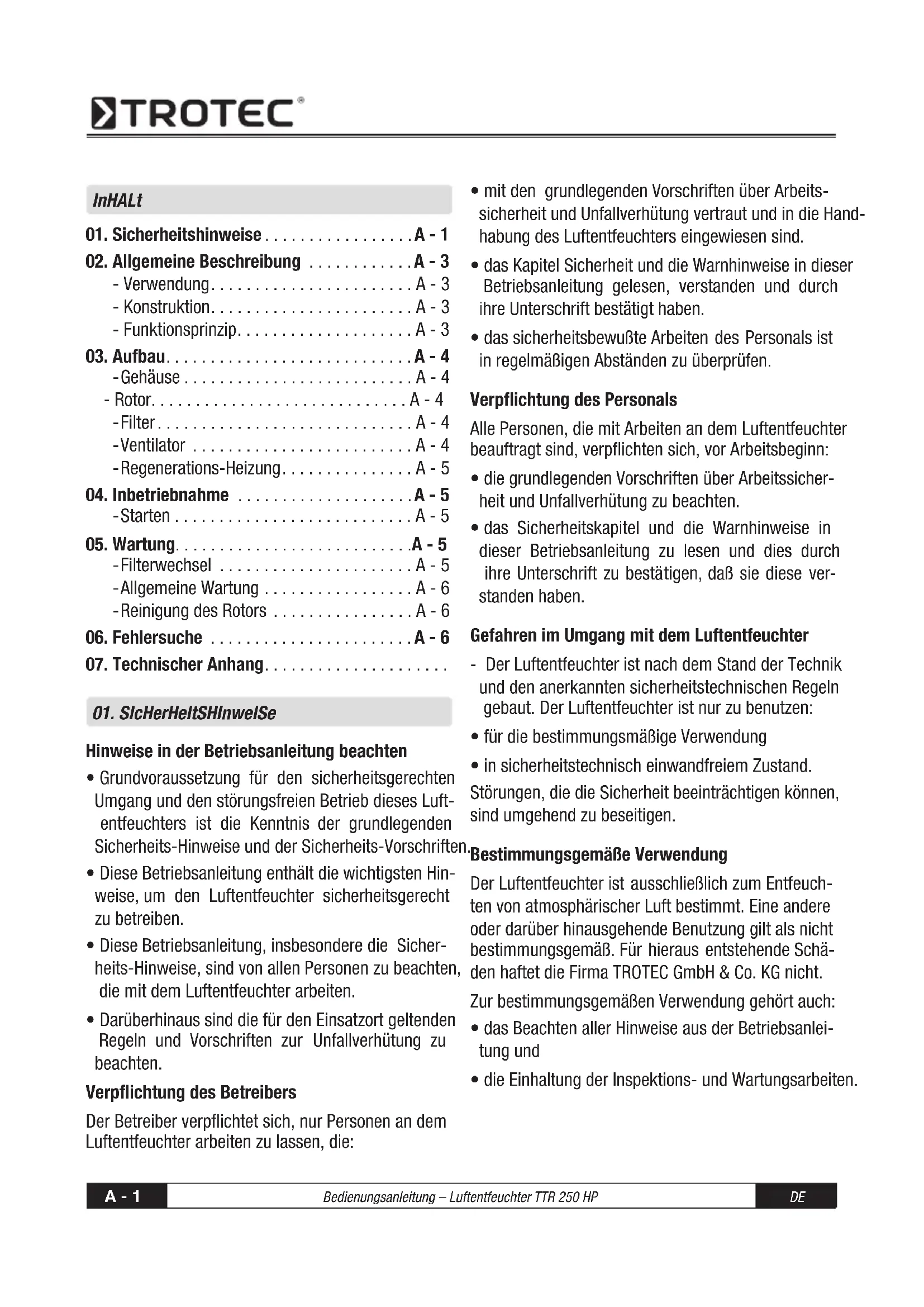 - die Einhaltung der Inspektions- und Wartungsarbeiten.DE Bedienungsanleitung – Luftentfeuchter TTR 250 HP A - 2 Gewährleistung und Haftung Grundsätzlich gelten unsere „Allgemeinen Verkaufs- und Lieferbedingungen“. Diese stehen dem Betreiber spätestens seit Vertragsabschluß zur Verfügung. Ge- währleistungs- und Haftungsansprüche bei Perso- nen- und Sachschäden sind ausgeschlossen, wenn sie auf eine oder mehrere der folgenden Ursachen zurückzuführen sind: