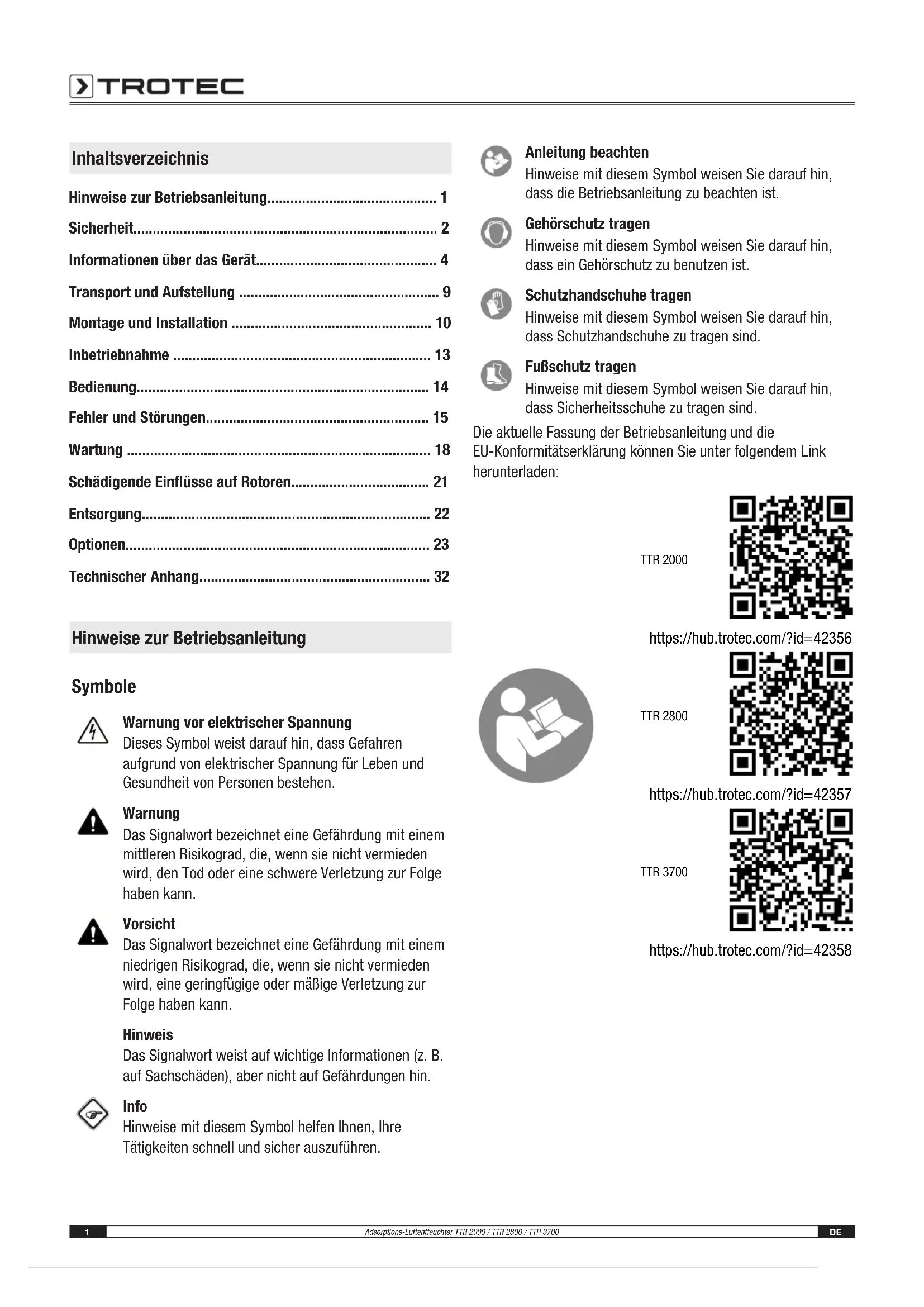- Technischer Anhang Hinweise zur Betriebsanleitung Symbole Warnung vor elektrischer Spannung Dieses Symbol weist darauf hin, dass Gefahren aufgrund von elektrischer Spannung für Leben und Gesundheit von Personen bestehen. Warnung Das Signalwort bezeichnet eine Gefährdung mit einem mittleren Risikograd, die, wenn sie nicht vermieden wird, den Tod oder eine schwere Verletzung zur Folge haben kann. Vorsicht Das Signalwort bezeichnet eine Gefährdung mit einem niedrigen Risikograd, die, wenn sie nicht vermieden wird, eine geringfügige oder mäßige Verletzung zur Folge haben kann. Hinweis Das Signalwort weist auf wichtige Informationen (z. B. auf Sachschäden), aber nicht auf Gefährdungen hin. Info Hinweise mit diesem Symbol helfen Ihnen, Ihre Tätigkeiten schnell und sicher auszuführen. Anleitung beachten Hinweise mit diesem Symbol weisen Sie darauf hin, dass die Betriebsanleitung zu beachten ist. Gehörschutz tragen Hinweise mit diesem Symbol weisen Sie darauf hin, dass ein Gehörschutz zu benutzen ist. Schutzhandschuhe tragen Hinweise mit diesem Symbol weisen Sie darauf hin, dass Schutzhandschuhe zu tragen sind. Fußschutz tragen Hinweise mit diesem Symbol weisen Sie darauf hin, dass Sicherheitsschuhe zu tragen sind. Die aktuelle Fassung der Betriebsanleitung und die EU-Konformitätserklärung können Sie unter folgendem Link herunterladen: TTR 2000 https://hub.trotec.com/?id=42356 TTR 2800 https://hub.trotec.com/?id=42357 TTR 3700 https://hub.trotec.com/?id=42358DE 2 Adsorptions-Luftentfeuchter TTR 2000 / TTR 2800 / TTR 3700 Sicherheit Lesen Sie diese Anleitung vor Inbetriebnahme / Verwendung des Gerätes sorgfältig durch und bewahren Sie die Anleitung immer in unmittelbarer Nähe des Aufstellortes bzw. am Gerät auf! Warnung Lesen Sie alle Sicherheitshinweise und Anweisungen. Versäumnisse bei der Einhaltung der Sicherheitshinweise und Anweisungen können elektrischen Schlag, Brand und/ oder schwere Verletzungen verursachen. Bewahren Sie alle Sicherheitshinweise und Anweisungen für die Zukunft auf. p. 32