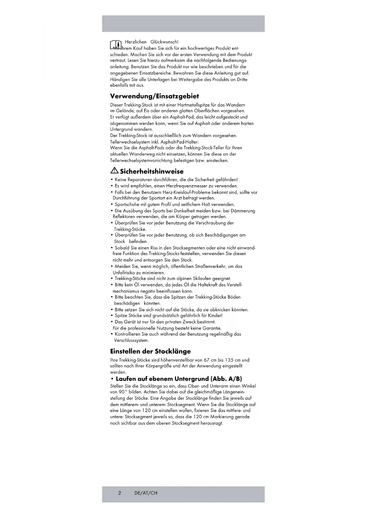 - Laufen auf ebenem Untergrund (Abb. A/B) Stellen Sie die Stocklänge so ein, dass Ober- und Unterarm einen Winkel von 90° bilden. Achten Sie dabei auf die gleichmäßige Längenein- stellung der Stöcke. Eine Angabe der Stocklänge finden Sie jeweils auf dem mittlerem- und unterem- Stocksegment. Wenn Sie die Stocklänge auf eine Länge von 120 cm einstellen wollen, fixieren Sie das mittlere- und untere- Stocksegment jeweils so, dass die 120 cm Markierung gerade noch sichtbar aus dem oberen Stocksegment herausragt. DE/AT/CH3DE/AT/CH