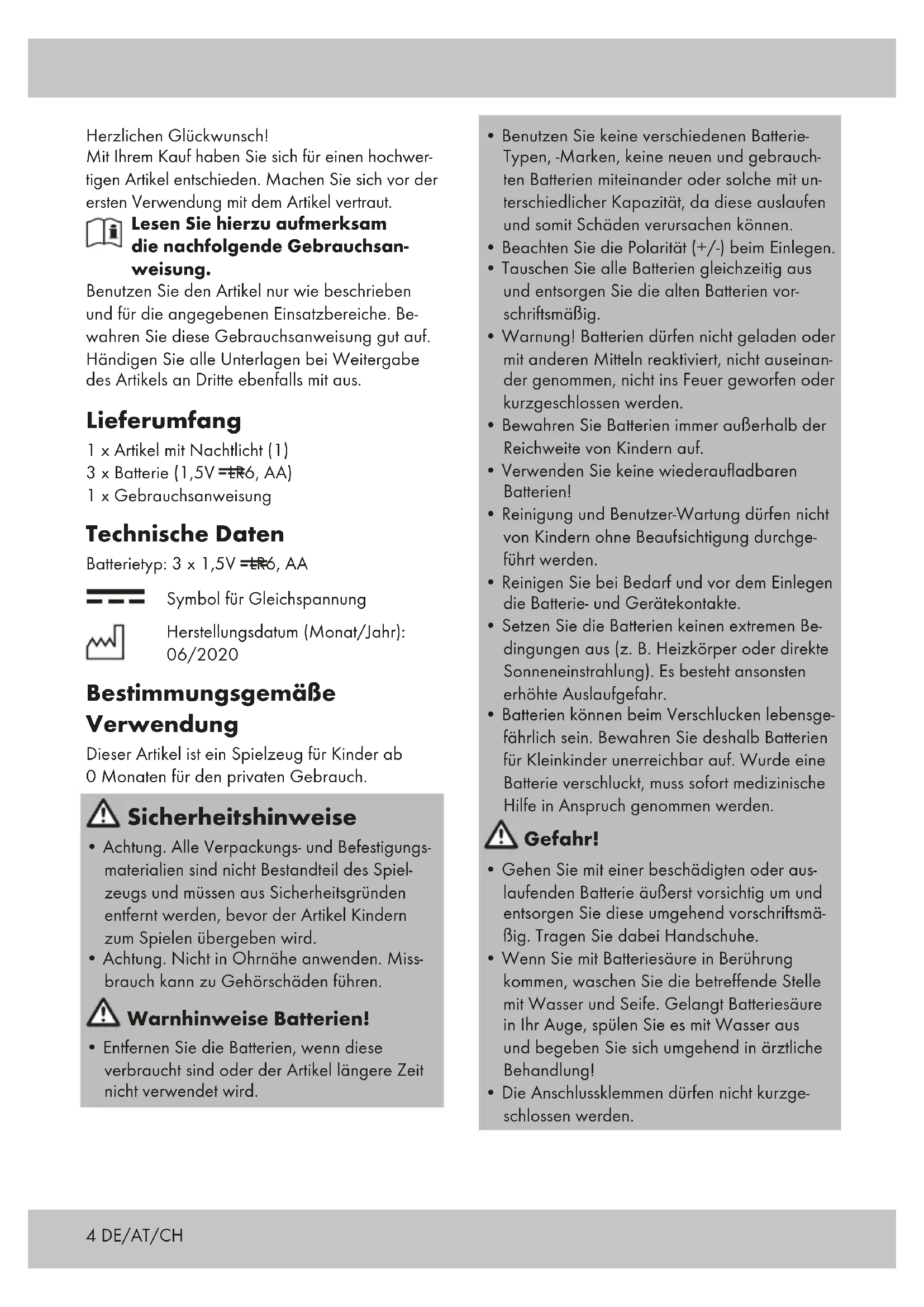 C4 DE/AT/CH Herzlichen Glückwunsch! Mit Ihrem Kauf haben Sie sich für einen hochwer- tigen Artikel entschieden. Machen Sie sich vor der ersten Verwendung mit dem Artikel vertraut. Lesen Sie hierzu aufmerksam die nachfolgende Gebrauchsan- weisung. Benutzen Sie den Artikel nur wie beschrieben und für die angegebenen Einsatzbereiche. Be- wahren Sie diese Gebrauchsanweisung gut auf. Händigen Sie alle Unterlagen bei Weitergabe des Artikels an Dritte ebenfalls mit aus. Lieferumfang 1 x Artikel mit Nachtlicht (1) 3 x Batterie (1,5V LR6, AA) 1 x Gebrauchsanweisung Technische Daten Batterietyp: 3 x 1,5V LR6, AA Symbol für Gleichspannung Herstellungsdatum (Monat/Jahr): 06/2020 Bestimmungsgemäße Verwendung Dieser Artikel ist ein Spielzeug für Kinder ab 0 Monaten für den privaten Gebrauch. Sicherheitshinweise