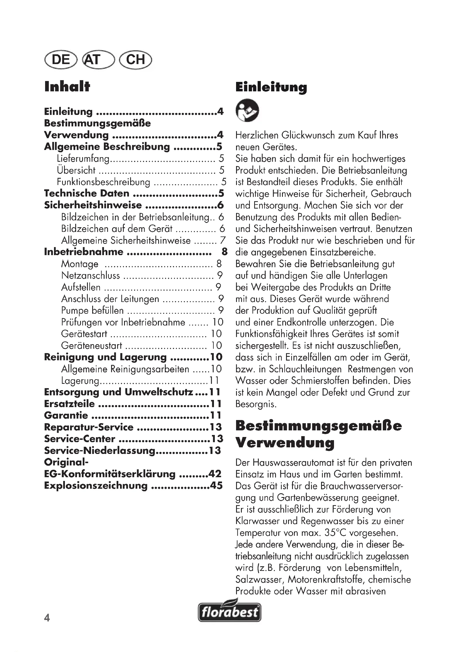 Einleitung Herzlichen Glückwunsch zum Kauf Ihres neuen Gerätes. Sie haben sich damit für ein hochwertiges Produkt entschieden. Die Betriebsanleitung ist Bestandteil dieses Produkts. Sie enthält wichtige Hinweise für Sicherheit, Gebrauch und Entsorgung. Machen Sie sich vor der Benutzung des Produkts mit allen Bedien- und Sicherheitshinweisen vertraut. Benutzen Sie das Produkt nur wie beschrieben und für die angegebenen Einsatzbereiche. Bewahren Sie die Betriebsanleitung gut auf und händigen Sie alle Unterlagen bei Weitergabe des Produkts an Dritte mit aus. Dieses Gerät wurde während der Produktion auf Qualität geprüft und einer Endkontrolle unterzogen. Die Funktionsfähigkeit Ihres Gerätes ist somit sichergestellt. Es ist nicht auszuschließen, dass sich in Einzelfällen am oder im Gerät, bzw. in Schlauchleitungen Restmengen von Wasser oder Schmierstoffen benden. Dies ist kein Mangel oder Defekt und Grund zur Besorgnis. Bestimmungsgemäße Verwendung Der Hauswasserautomat ist für den privaten Einsatz im Haus und im Garten bestimmt. Das Gerät ist für die Brauchwasserversor- gung und Gartenbewässerung geeignet. Er ist ausschließlich zur Förderung von Klarwasser und Regenwasser bis zu einer Temperatur von max. 35°C vorgesehen. Jede andere Verwendung, die in dieser Be- triebsanleitung nicht ausdrücklich zugelassen wird (z.B. Förderung von Lebensmitteln, Salzwasser, Motorenkraftstoffe, chemische Produkte oder Wasser mit abrasiven Inhalt