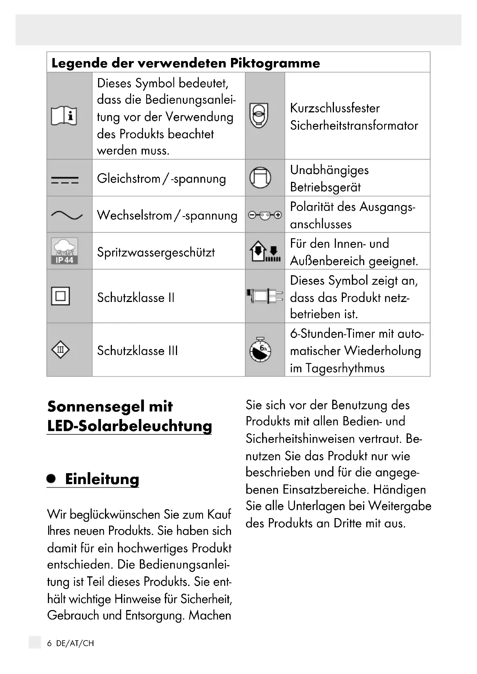 F5 DE/AT/CH Legende der verwendeten Piktogramme ................... Seite 6 Einleitung ................................................................................... Seite 6 Bestimmungsgemäße Verwendung ........................................... Seite 7 Teilebeschreibung ...................................................................... Seite 7 Technische Daten ....................................................................... Seite 7 Lieferumfang ............................................................................... Seite 8 Sicherheitshinweise ............................................................... Seite 8 Sicherheitshinweise für Batterien / Akkus .................................. Seite 11 Akku einsetzen / wechseln ................................................. Seite 12 Montage ..................................................................................... Seite 13 Produkt montieren ....................................................................... Seite 14 Verwendung ............................................................................ Seite 15 Timer-Funktion (nur für Verwendung mit Netzteil) ... Seite 16 Produkt demontieren ........................................................... Seite 16 Reinigung und Pflege ........................................................... Seite 17 Fehlerbehebung (für Verwendung mit Solarpanel) ... Seite 17 Entsorgung ................................................................................ Seite 18 Garantie ..................................................................................... Seite 19 Abwicklung im Garantiefall ....................................................... Seite 20 Service......................................................................................... Seite 206 DE/AT/CH Legende der verwendeten Piktogramme Dieses Symbol bedeutet, dass die Bedienungsanlei- tung vor der Verwendung des Produkts beachtet werden muss. Kurzschlussfester Sicherheitstrans formator Gleichstrom / -spannung Unabhängiges Betriebsgerät Wechselstrom / -spannung Polarität des Ausgangs- anschlusses Spritzwassergeschützt Für den Innen- und Außenbereich geeignet. Schutzklasse II Dieses Symbol zeigt an, dass das Produkt netz- betrieben ist. Schutzklasse III 6-Stunden-Timer mit auto- matischer Wiederholung im Tagesrhythmus Sonnensegel mit LED-Solarbeleuchtung Einleitung Wir beglückwünschen Sie zum Kauf