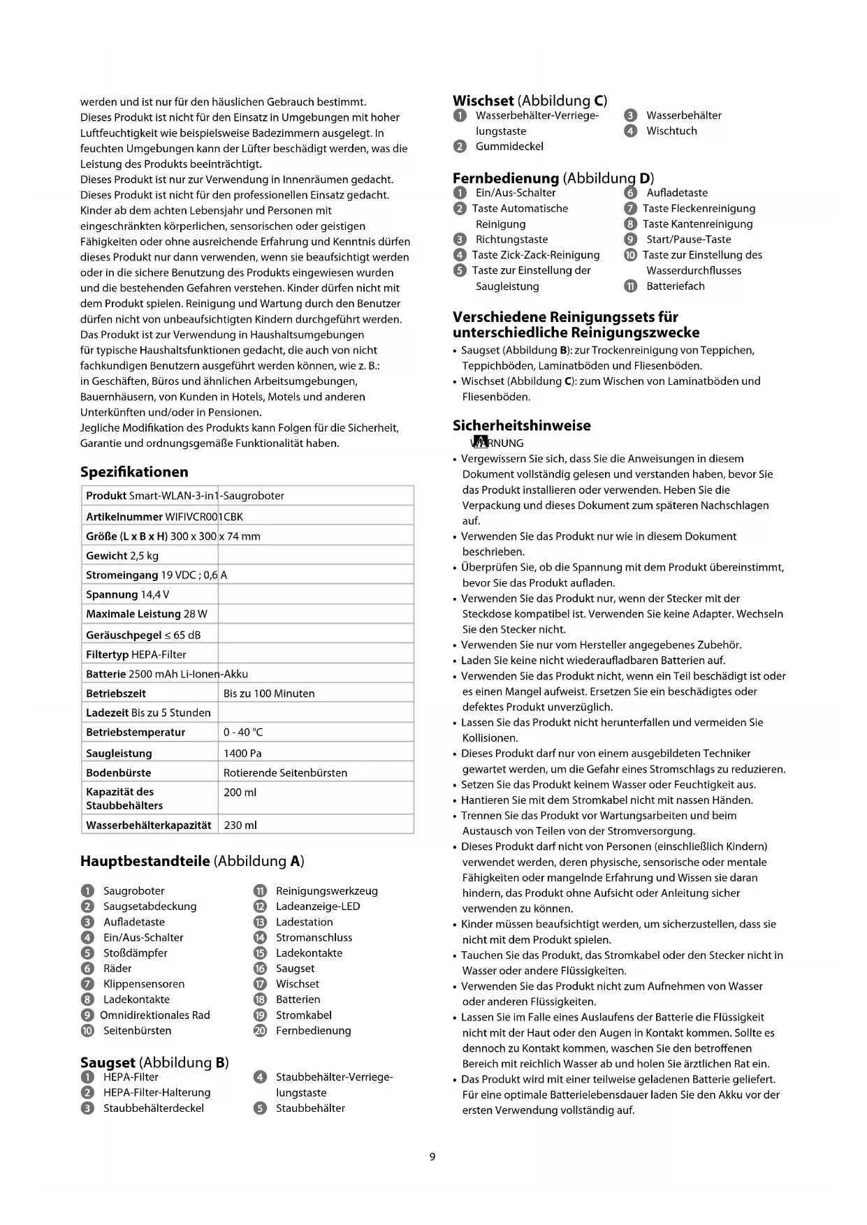 - Wischset (Abbildung C): zum Wischen von Laminatböden und Fliesenböden. Sicherheitshinweise