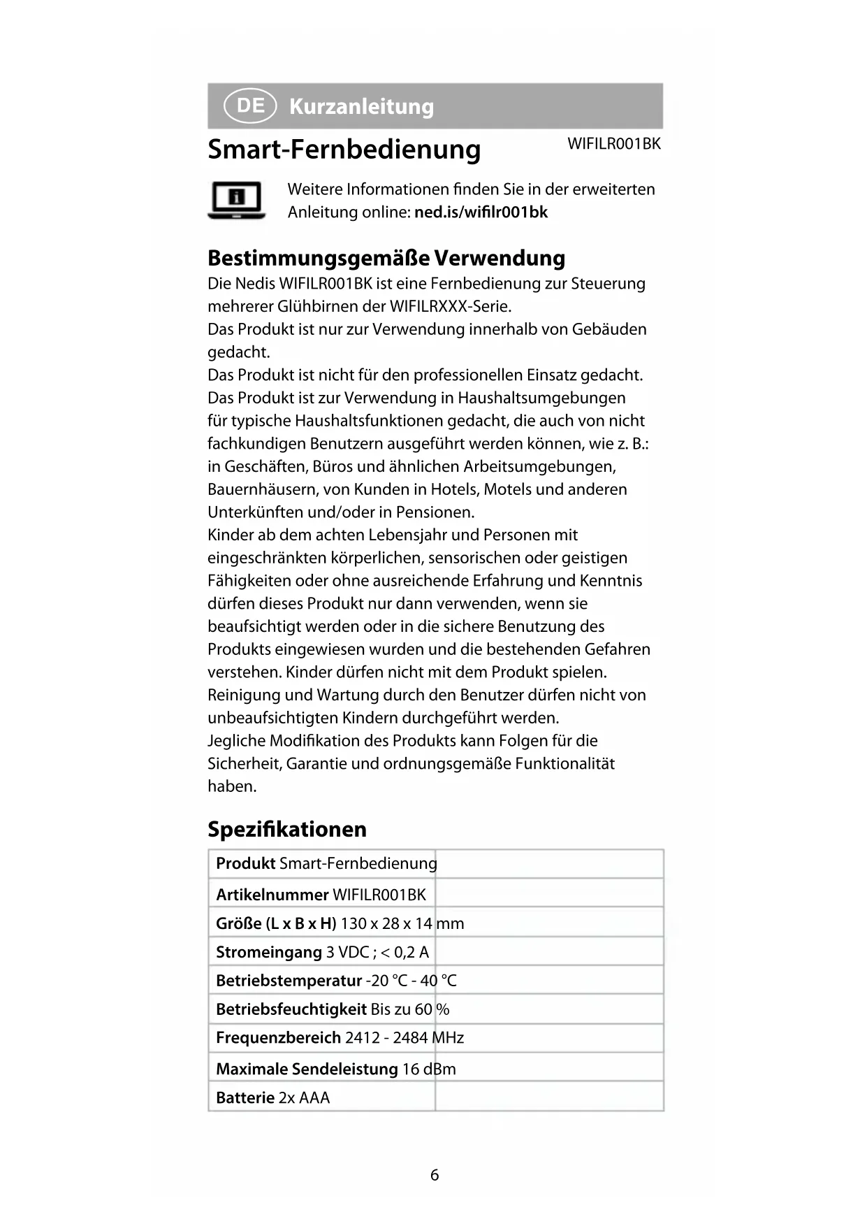 Kurzanleitung Smart-Fernbedienung WIFILR001BK Weitere Informationen nden Sie in der erweiterten Anleitung online: ned.is/wilr001bk Bestimmungsgemäße Verwendung Die Nedis WIFILR001BK ist eine Fernbedienung zur Steuerung mehrerer Glühbirnen der WIFILRXXX-Serie. Das Produkt ist nur zur Verwendung innerhalb von Gebäuden gedacht. Das Produkt ist nicht für den professionellen Einsatz gedacht. Das Produkt ist zur Verwendung in Haushaltsumgebungen für typische Haushaltsfunktionen gedacht, die auch von nicht fachkundigen Benutzern ausgeführt werden können, wie z.B.: in Geschäften, Büros und ähnlichen Arbeitsumgebungen, Bauernhäusern, von Kunden in Hotels, Motels und anderen Unterkünften und/oder in Pensionen. Kinder ab dem achten Lebensjahr und Personen mit eingeschränkten körperlichen, sensorischen oder geistigen Fähigkeiten oder ohne ausreichende Erfahrung und Kenntnis dürfen dieses Produkt nur dann verwenden, wenn sie beaufsichtigt werden oder in die sichere Benutzung des Produkts eingewiesen wurden und die bestehenden Gefahren verstehen. Kinder dürfen nicht mit dem Produkt spielen. Reinigung und Wartung durch den Benutzer dürfen nicht von unbeaufsichtigten Kindern durchgeführt werden. Jegliche Modikation des Produkts kann Folgen für die Sicherheit, Garantie und ordnungsgemäße Funktionalität haben. Spezikationen Produkt Smart-Fernbedienung Artikelnummer WIFILR001BK Größe (L x B x H) 130 x 28 x 14 mm Stromeingang 3 VDC ; < 0,2 A Betriebstemperatur -20 °C - 40 °C Betriebsfeuchtigkeit Bis zu 60 % Frequenzbereich 2412 - 2484 MHz Maximale Sendeleistung 16 dBm Batterie 2x AAA7 Hauptbestandteile (Abbildung A) 1 Anzeige-LED 2 Ein-Taste 3 Helligkeit verringern 4 Aus-Taste 5 Helligkeit erhöhen 6 Batteriefach Sicherheitshinweise