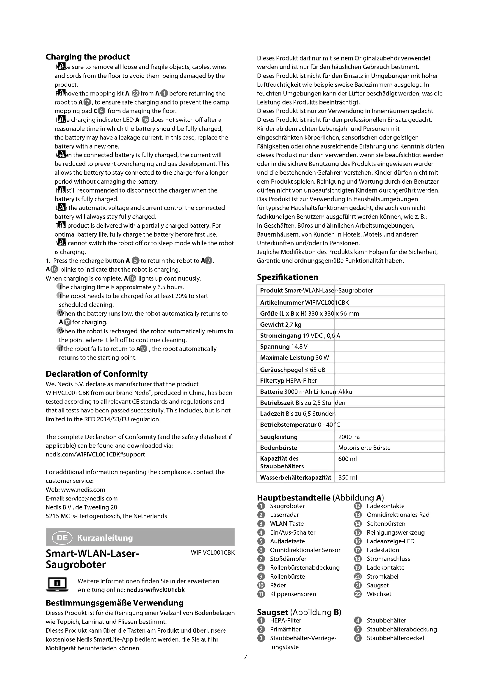 Kurzanleitung Smart-WLAN-Laser- Saugroboter WIFIVCL001CBKWeitere Informationen nden Sie in der erweiterten Anleitung online: ned.is/wivcl001cbk Bestimmungsgemäße Verwendung Dieses Produkt ist für die Reinigung einer Vielzahl von Bodenbelägen wie Teppich, Laminat und Fliesen bestimmt.Dieses Produkt kann über die Tasten am Produkt und über unsere kostenlose Nedis SmartLife-App bedient werden, die Sie auf Ihr Mobilgerät herunterladen können.Dieses Produkt darf nur mit seinem Originalzubehör verwendet werden und ist nur für den häuslichen Gebrauch bestimmt.Dieses Produkt ist nicht für den Einsatz in Umgebungen mit hoher Luftfeuchtigkeit wie beispielsweise Badezimmern ausgelegt. In feuchten Umgebungen kann der Lüfter beschädigt werden, was die Leistung des Produkts beeinträchtigt.Dieses Produkt ist nur zur Verwendung in Innenräumen gedacht.Dieses Produkt ist nicht für den professionellen Einsatz gedacht.Kinder ab dem achten Lebensjahr und Personen mit eingeschränkten körperlichen, sensorischen oder geistigen Fähigkeiten oder ohne ausreichende Erfahrung und Kenntnis dürfen dieses Produkt nur dann verwenden, wenn sie beaufsichtigt werden oder in die sichere Benutzung des Produkts eingewiesen wurden und die bestehenden Gefahren verstehen. Kinder dürfen nicht mit dem Produkt spielen. Reinigung und Wartung durch den Benutzer dürfen nicht von unbeaufsichtigten Kindern durchgeführt werden.Das Produkt ist zur Verwendung in Haushaltsumgebungen für typische Haushaltsfunktionen gedacht, die auch von nicht fachkundigen Benutzern ausgeführt werden können, wie z.B.: in Geschäften, Büros und ähnlichen Arbeitsumgebungen, Bauernhäusern, von Kunden in Hotels, Motels und anderen Unterkünften und/oder in Pensionen.Jegliche Modikation des Produkts kann Folgen für die Sicherheit, Garantie und ordnungsgemäße Funktionalität haben. Spezikationen Produkt Smart-WLAN-Laser-SaugroboterArtikelnummer WIFIVCL001CBKGröße (L x B x H) 330 x 330 x 96 mmGewicht 2,7 kgStromeingang 19 VDC ; 0,6 ASpannung 14,8 VMaximale Leistung 30 WGeräuschpegel ≤ 65 dBFiltertyp HEPA-FilterBatterie 3000 mAh Li-Ionen-AkkuBetriebszeit Bis zu 2,5 StundenLadezeit Bis zu 6,5 StundenBetriebstemperatur 0 - 40 °CSaugleistung 2000 PaBodenbürste Motorisierte BürsteKapazität des Staubbehälters600 mlWasserbehälterkapazität 350 ml Hauptbestandteile (Abbildung A) 1 Saugroboter2 Laserradar3 WLAN-Taste4 Ein/Aus-Schalter5 Auadetaste6 Omnidirektionaler Sensor7 Stoßdämpfer8 Rollenbürstenabdeckung9 Rollenbürsteq Räderw Klippensensorene Ladekontakter Omnidirektionales Radt Seitenbürsteny Reinigungswerkzeugu Ladeanzeige-LEDi Ladestationo Stromanschlussp Ladekontaktea Stromkabels Saugsetd Wischset Saugset (Abbildung B) 1 HEPA-Filter2 Primärlter3 Staubbehälter-Verriege-lungstaste4 Staubbehälter5 Staubbehälterabdeckung6 Staubbehälterdeckel8 Austausch von Teilen von der Stromversorgung.