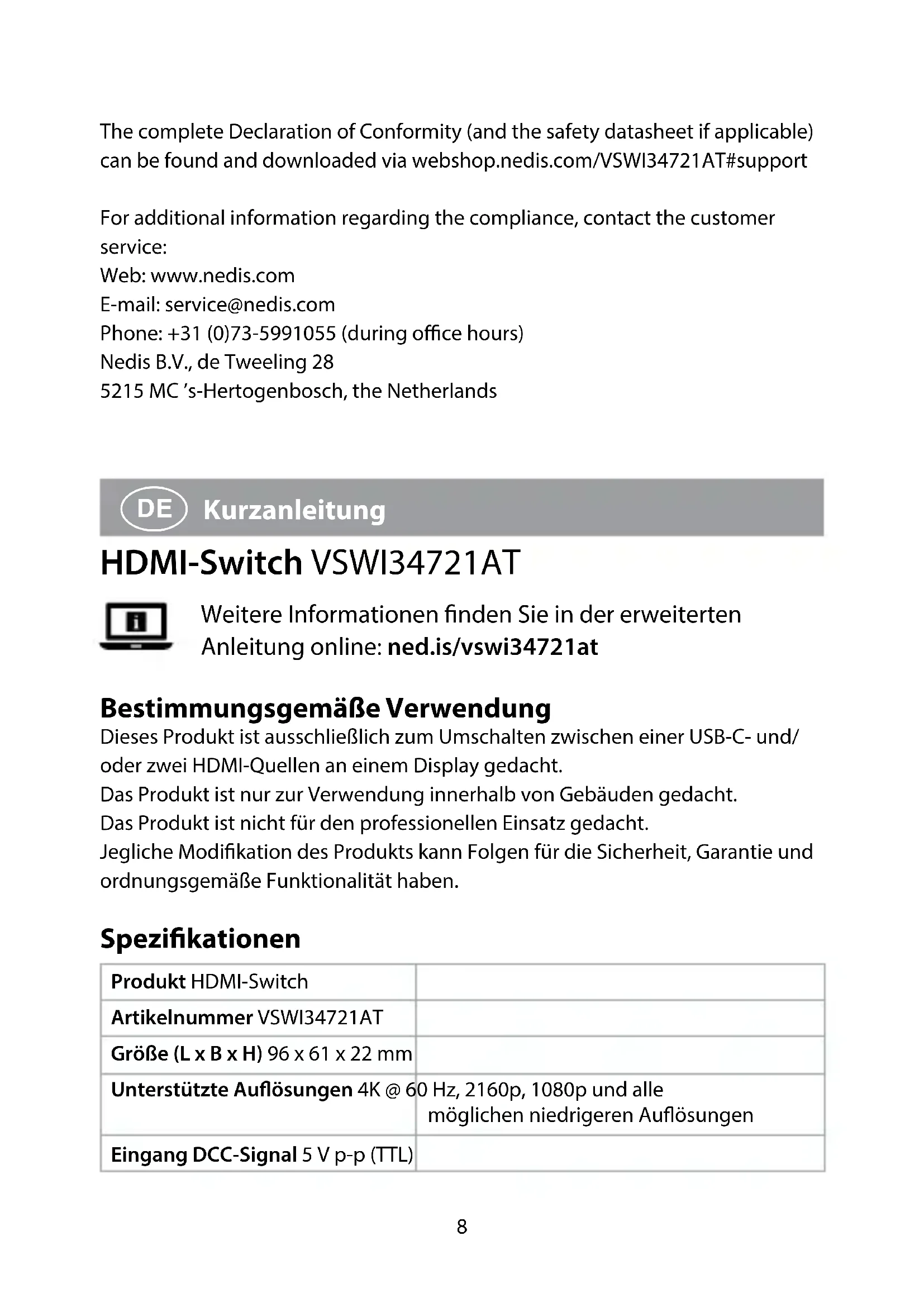 Kurzanleitung HDMI-Switch VSWI34721AT Weitere Informationen nden Sie in der erweiterten Anleitung online: ned.is/vswi34721at Bestimmungsgemäße Verwendung Dieses Produkt ist ausschließlich zum Umschalten zwischen einer USB-C- und/ oder zwei HDMI-Quellen an einem Display gedacht. Das Produkt ist nur zur Verwendung innerhalb von Gebäuden gedacht. Das Produkt ist nicht für den professionellen Einsatz gedacht. Jegliche Modikation des Produkts kann Folgen für die Sicherheit, Garantie und ordnungsgemäße Funktionalität haben. Spezikationen Produkt HDMI-Switch Artikelnummer VSWI34721AT Größe (L x B x H) 96 x 61 x 22 mm Unterstützte Auösungen 4K @ 60 Hz, 2160p, 1080p und alle möglichen niedrigeren Auösungen Eingang DCC-Signal 5 V p-p (TTL)9 Videoausgabe HDMI HDMI-Version HDMI 2.0 Vertikaler Frequenzbereich 50 / 60 Hz Videobandbreite 18 Gb/s / 600 MHz Betriebstemperatur -20 °C - 70 °C Betriebsfeuchtigkeit 10 - 85% rel. Feuchte (keine Kondensation) Stromversorgung 5 VDC / 1 A Stromverbrauch 5 W Hauptbestandteile (Abbildung A)