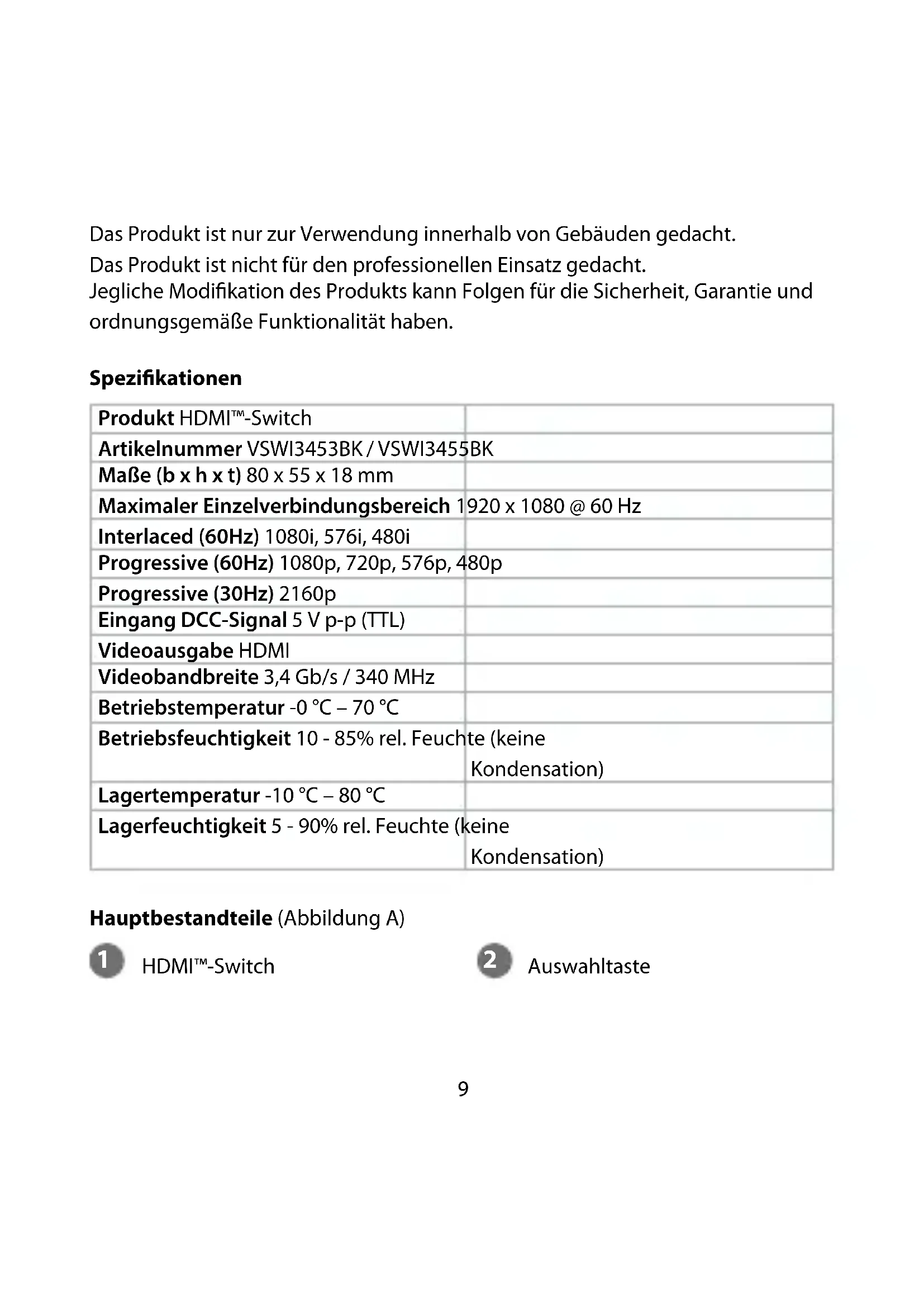 Weitere Informationen finden Sie in der erweiterten Anleitung online: ned.is/vswi3453bk | ned.is/vswi3455bk Bestimmungsgemäße Verwendung Dieses Produkt ist exklusiv zum Umschalten mehrerer HDMI-Quellen auf 1 HD-Bildschirm oder Projektor gedacht.9 Das Produkt ist nur zur Verwendung innerhalb von Gebäuden gedacht. Das Produkt ist nicht für den professionellen Einsatz gedacht. Jegliche Modifikation des Produkts kann Folgen für die Sicherheit, Garantie und ordnungsgemäße Funktionalität haben. Spezikationen Produkt HDMI™-Switch Artikelnummer VSWI3453BK / VSWI3455BK Maße (b x h x t) 80 x 55 x 18 mm Maximaler Einzelverbindungsbereich 1920 x 1080 @ 60 Hz Interlaced (60Hz) 1080i, 576i, 480i Progressive (60Hz) 1080p, 720p, 576p, 480p Progressive (30Hz) 2160p Eingang DCC-Signal 5 V p-p (TTL) Videoausgabe HDMI Videobandbreite 3,4 Gb/s / 340 MHz Betriebstemperatur -0 °C – 70 °C Betriebsfeuchtigkeit 10 - 85% rel. Feuchte (keine Kondensation) Lagertemperatur -10 °C – 80 °C Lagerfeuchtigkeit 5 - 90% rel. Feuchte (keine Kondensation) Hauptbestandteile (Abbildung A)