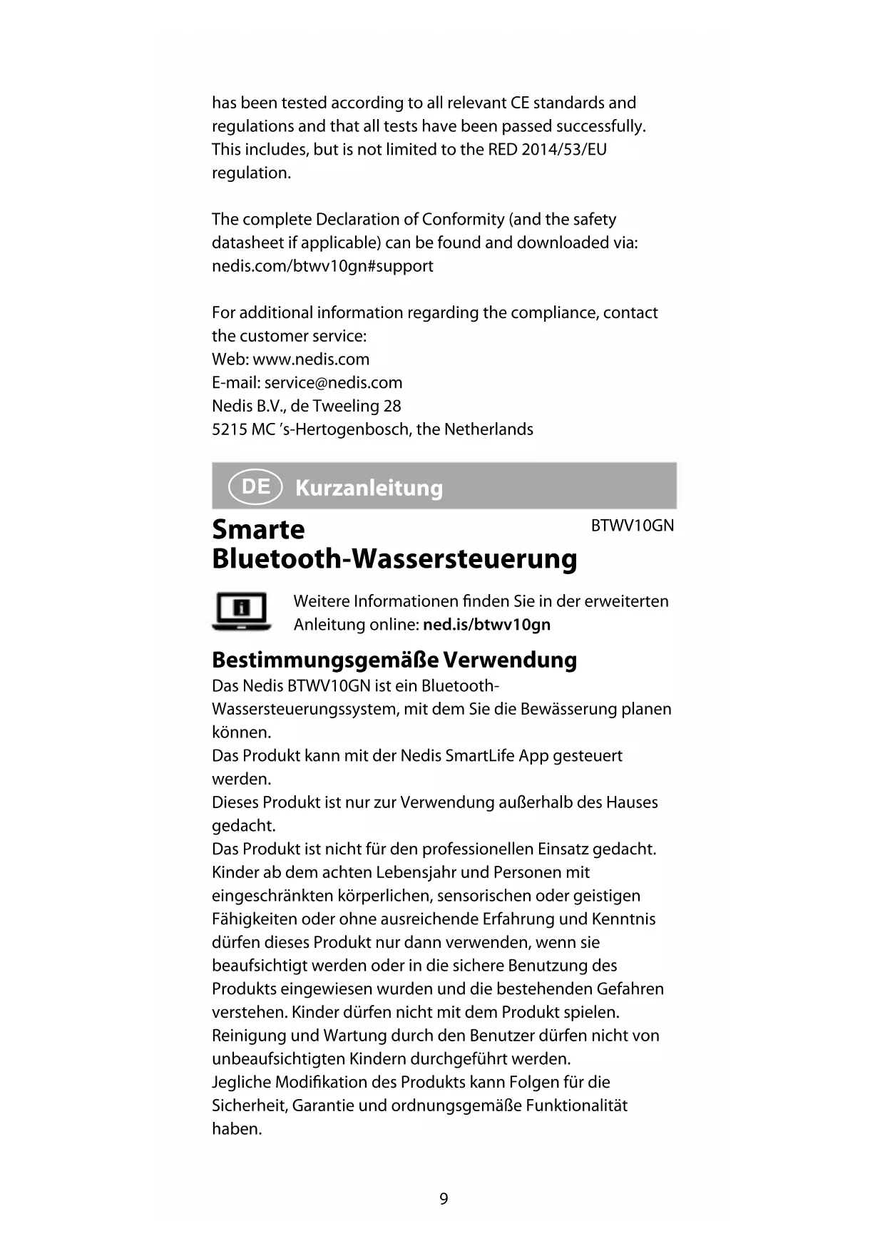 Verwenden Sie die App, um das Produkt einzustellen und zu bedienen. Weitere Informationen zur Funktionsweise und zu den Möglichkeiten der App nden Sie in der erweiterten Anleitung online.13 Konformitätserklärung Wir, Nedis B.V., erklären als Hersteller, dass das Produkt BTWV10GN unserer Marke Nedis®, produziert in China, nach allen geltenden CE-Standards und Vorschriften getestet wurde und alle diese Tests erfolgreich bestanden hat. Dies gilt unter anderem auch für die Richtlinie RED 2014/53/EU. Die vollständige Konformitätserklärung (und das Sicherheitsdatenblatt, falls zutreend) steht zum Download zur Verfügung unter: nedis.de/btwv10gn#support Weiterführende Informationen zur Compliance erhalten Sie über den Kundenservice: Web: www.nedis.com E-Mail: service@nedis.com Nedis B.V., de Tweeling 28 5215 MC ’s-Hertogenbosch, Niederlande