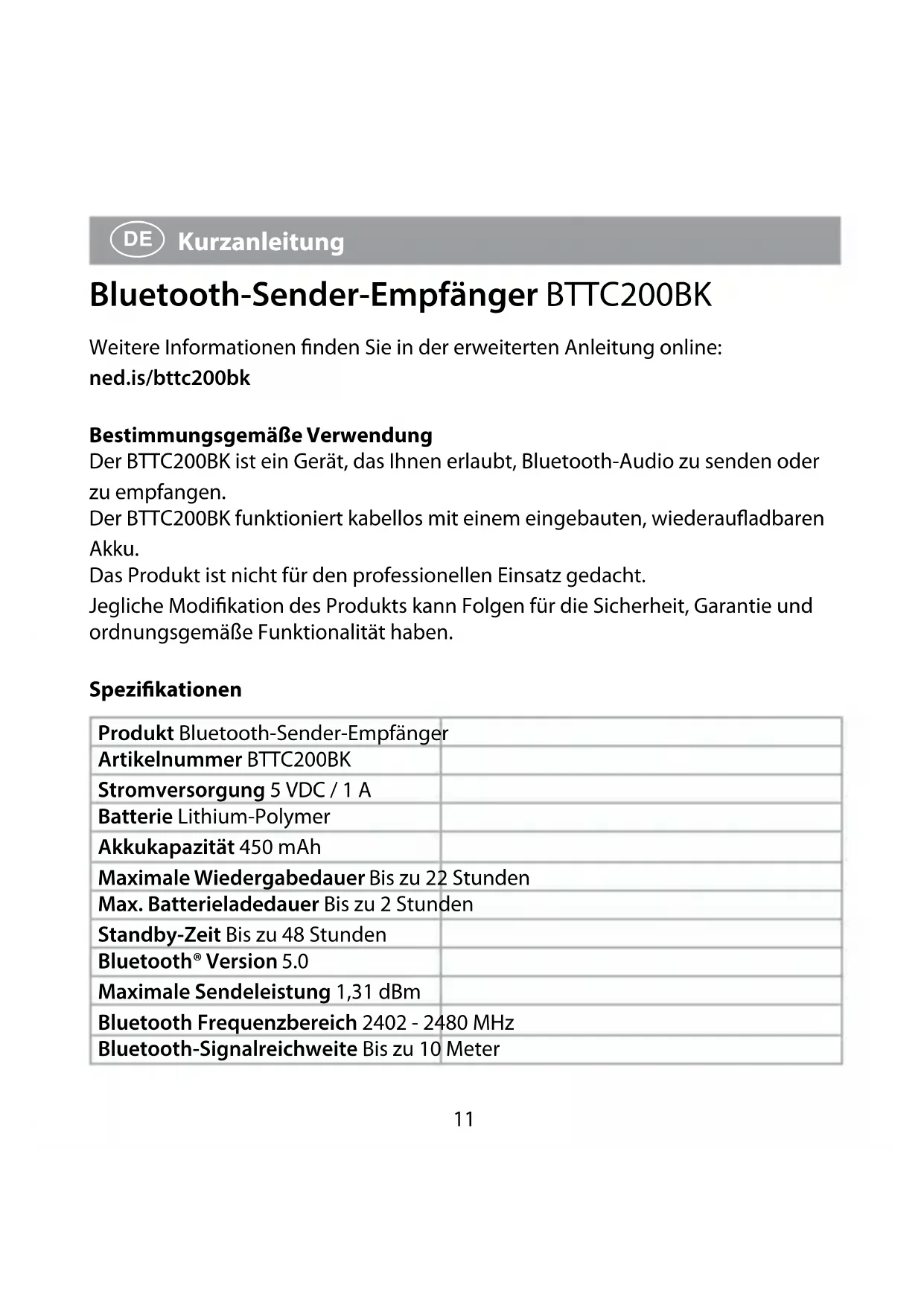 Kurzanleitung Bluetooth-Sender-Empfänger BTTC200BK Weitere Informationen finden Sie in der erweiterten Anleitung online: ned.is/bttc200bk Bestimmungsgemäße Verwendung Der BTTC200BK ist ein Gerät, das Ihnen erlaubt, Bluetooth-Audio zu senden oder zu empfangen. Der BTTC200BK funktioniert kabellos mit einem eingebauten, wiederaufladbaren Akku. Das Produkt ist nicht für den professionellen Einsatz gedacht. Jegliche Modifikation des Produkts kann Folgen für die Sicherheit, Garantie und ordnungsgemäße Funktionalität haben. Spezikationen Produkt Bluetooth-Sender-Empfänger Artikelnummer BTTC200BK Stromversorgung 5 VDC / 1 A Batterie Lithium-Polymer Akkukapazität 450 mAh Maximale Wiedergabedauer Bis zu 22 Stunden Max. Batterieladedauer Bis zu 2 Stunden Standby-Zeit Bis zu 48 Stunden Bluetooth® Version 5.0 Maximale Sendeleistung 1,31 dBm Bluetooth Frequenzbereich 2402 - 2480 MHz Bluetooth-Signalreichweite Bis zu 10 Meter12 Bluetooth-Prole A2DP Unterstützte Codecs SBC / aptX